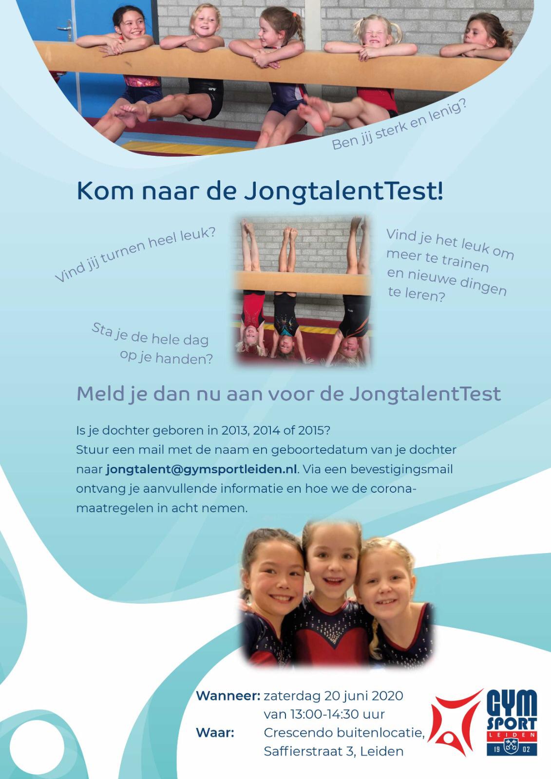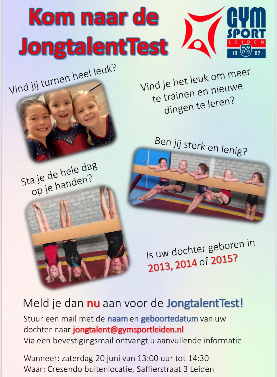 De JongTalenttestdag is aanstaande zaterdag 20 juni van 13.00 tot 14.30 uur, op het terrein van Cresendo aan de Saffierstraat 3 in Leiden. In verband met de coronamaatregelen traint Gymsport Leiden momenteel buiten. Opgeven voor de talenttestdag kan per e-mail: jongtalent@gymsportleiden.nl. Voor meer informatie kun je terecht op de website van Gymsport Leiden.