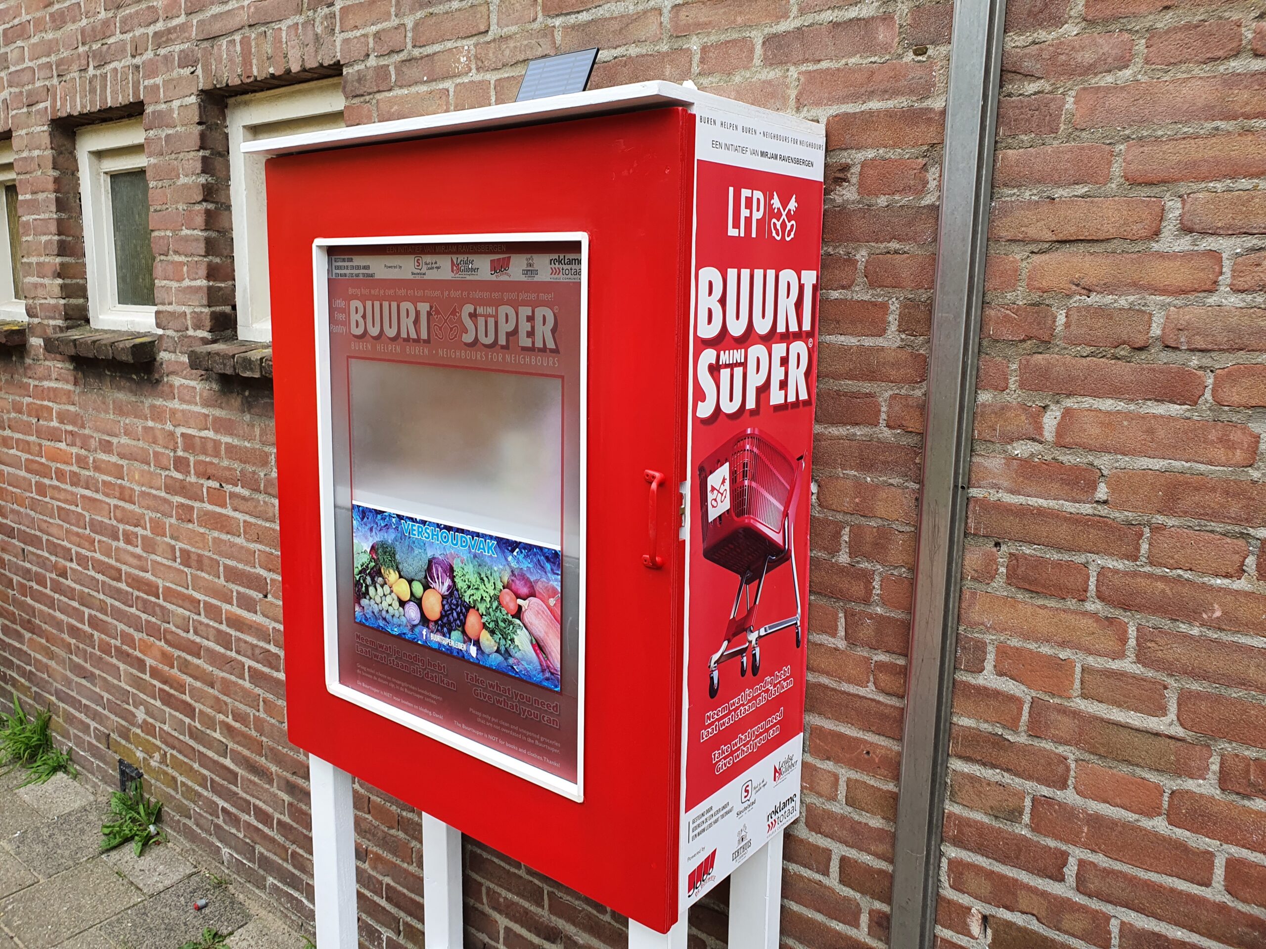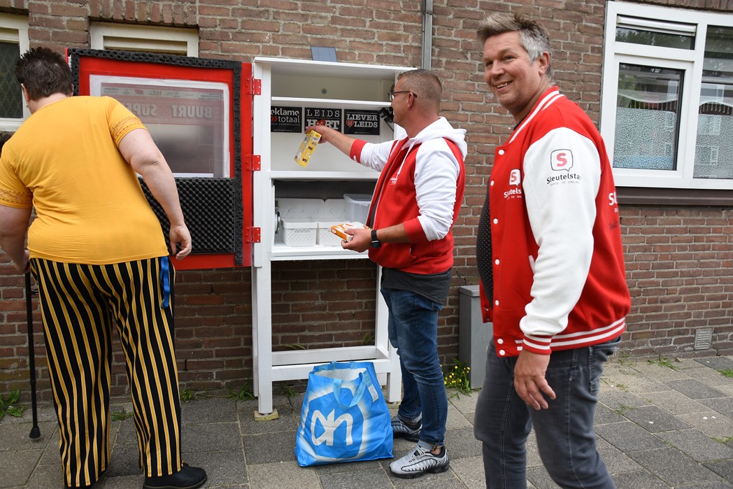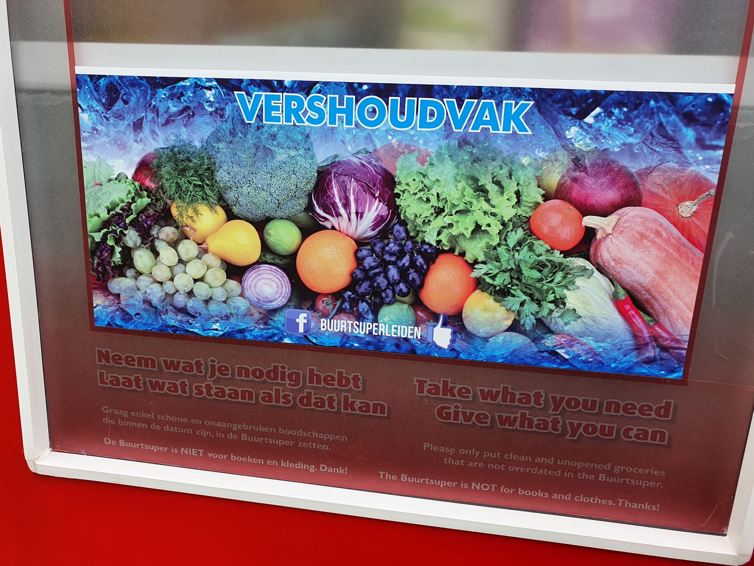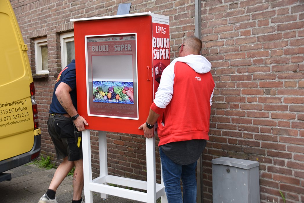 Gisteren werd er een prachtig nieuw exemplaar tegen de muur van de flat geschroefd. Onder toeziend oog van een ontroerde Ravensbergen. “Er zijn zoveel mensen die wel wat hulp kunnen gebruiken”, zegt ze terwijl ze het resultaat bewondert van een crowdfunding via Voorjebuurt.nl de afgelopen weken 250 euro werd opgehaald. Geld dat eigenlijk gebruikt zou worden voor een nieuw uitgiftekastje, maar de actie werd opgemerkt door enkele Leidse ondernemers die onder aanvoering van Joris de Bruin van Reklametotaal het maken en plaatsen van de nieuwe ‘Buurtsuper Leiden’ voor hun rekening namen. Andere meewerkende bedrijven waren Jobo de Bouwer, het Theehuis de Leidse hout en Sleutelstad.