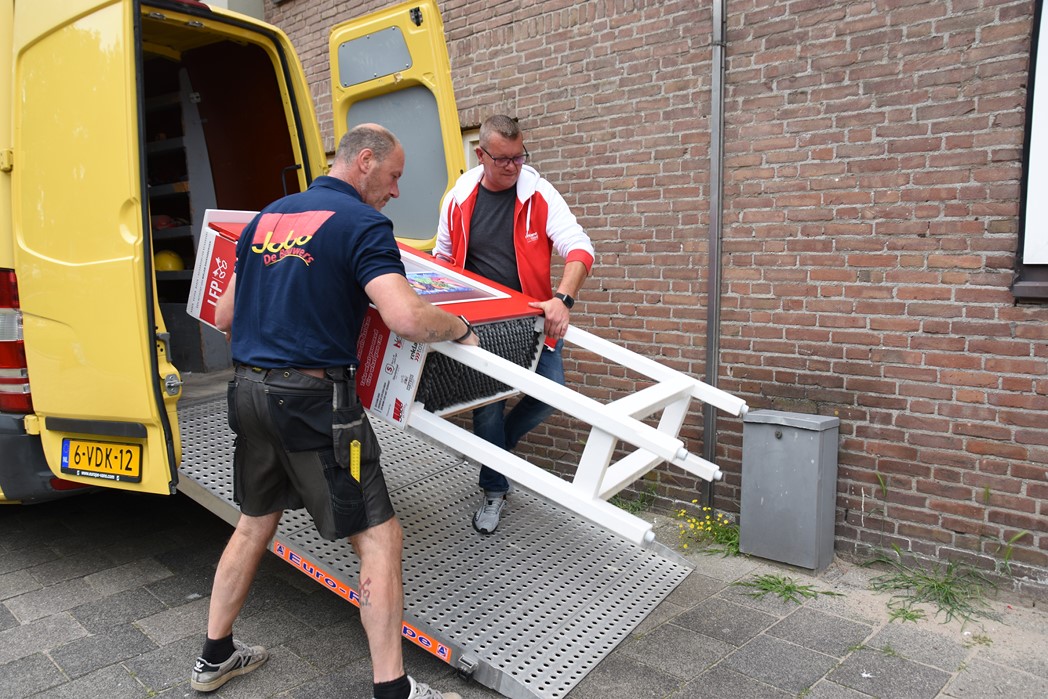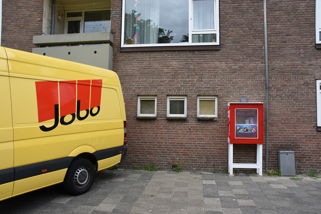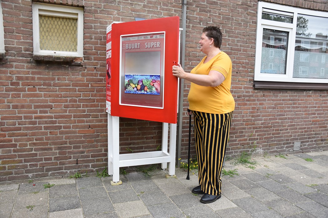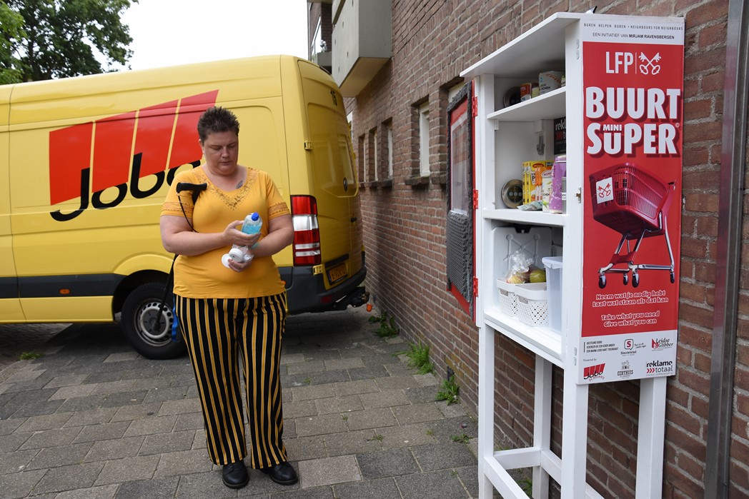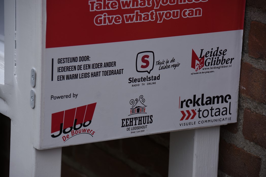 Gisteren werd er een prachtig nieuw exemplaar tegen de muur van de flat geschroefd. Onder toeziend oog van een ontroerde Ravensbergen. “Er zijn zoveel mensen die wel wat hulp kunnen gebruiken”, zegt ze terwijl ze het resultaat bewondert van een crowdfunding via Voorjebuurt.nl de afgelopen weken 250 euro werd opgehaald. Geld dat eigenlijk gebruikt zou worden voor een nieuw uitgiftekastje, maar de actie werd opgemerkt door enkele Leidse ondernemers die onder aanvoering van Joris de Bruin van Reklametotaal het maken en plaatsen van de nieuwe ‘Buurtsuper Leiden’ voor hun rekening namen. Andere meewerkende bedrijven waren Jobo de Bouwer, het Theehuis de Leidse hout en Sleutelstad.