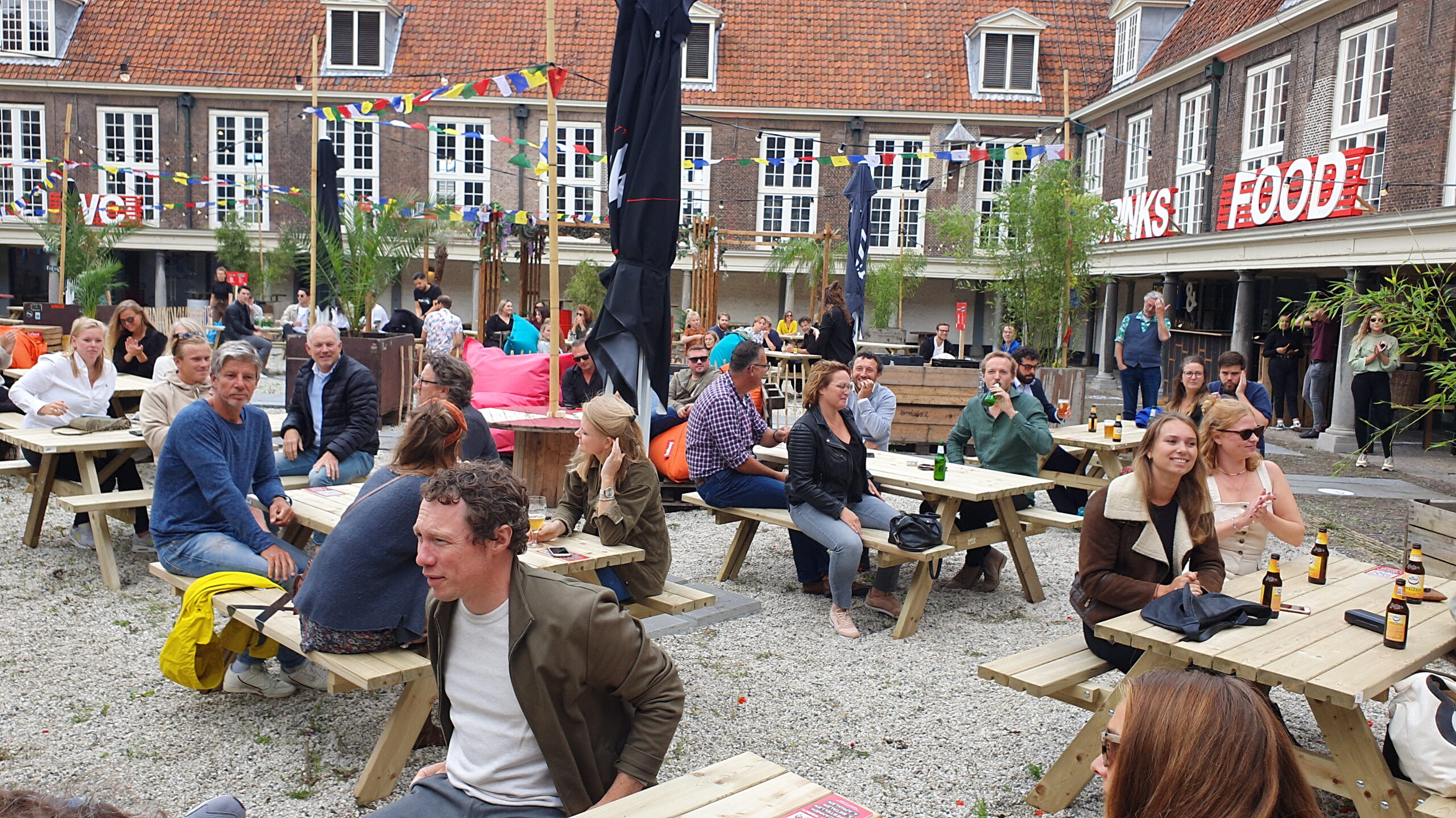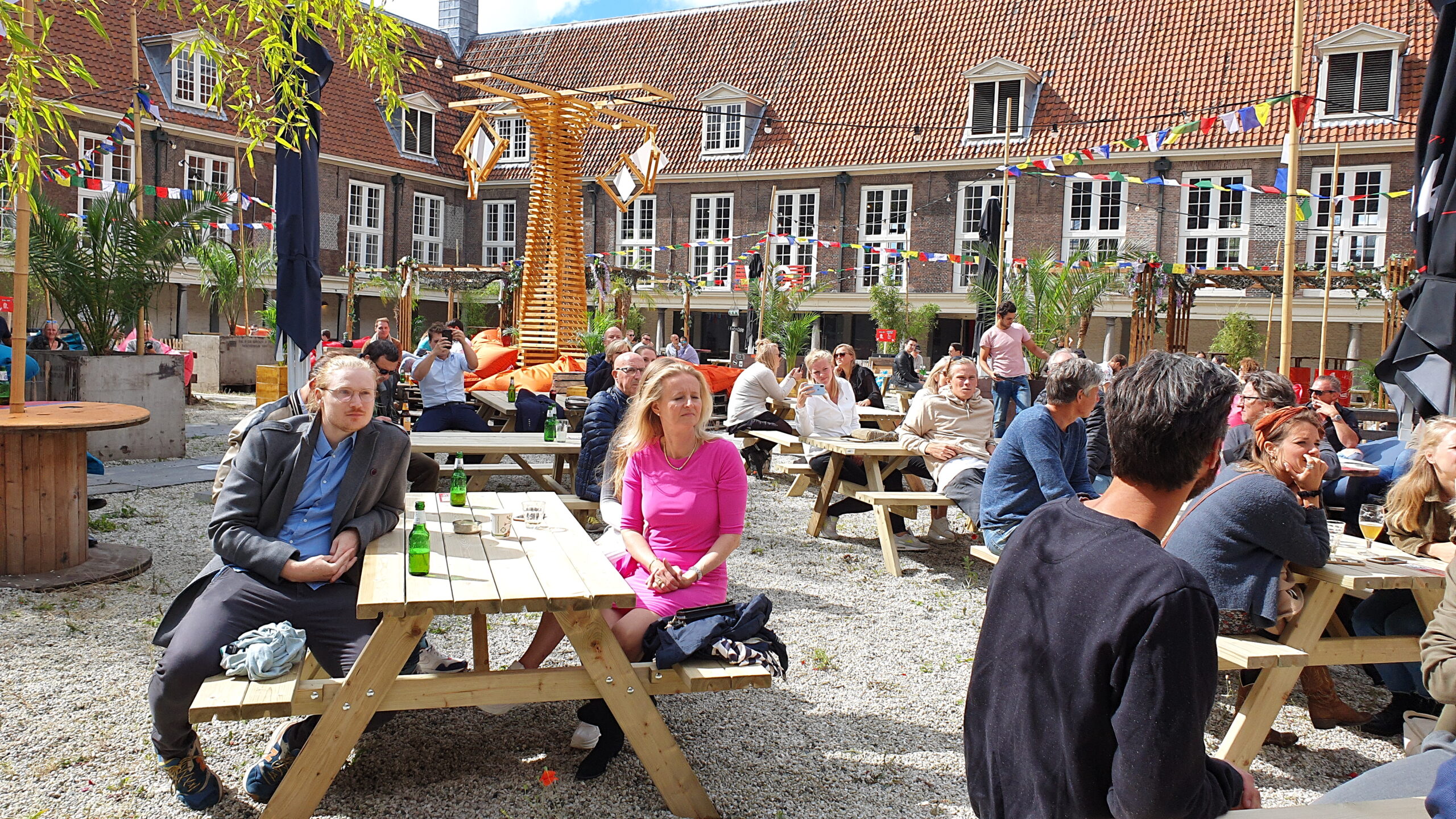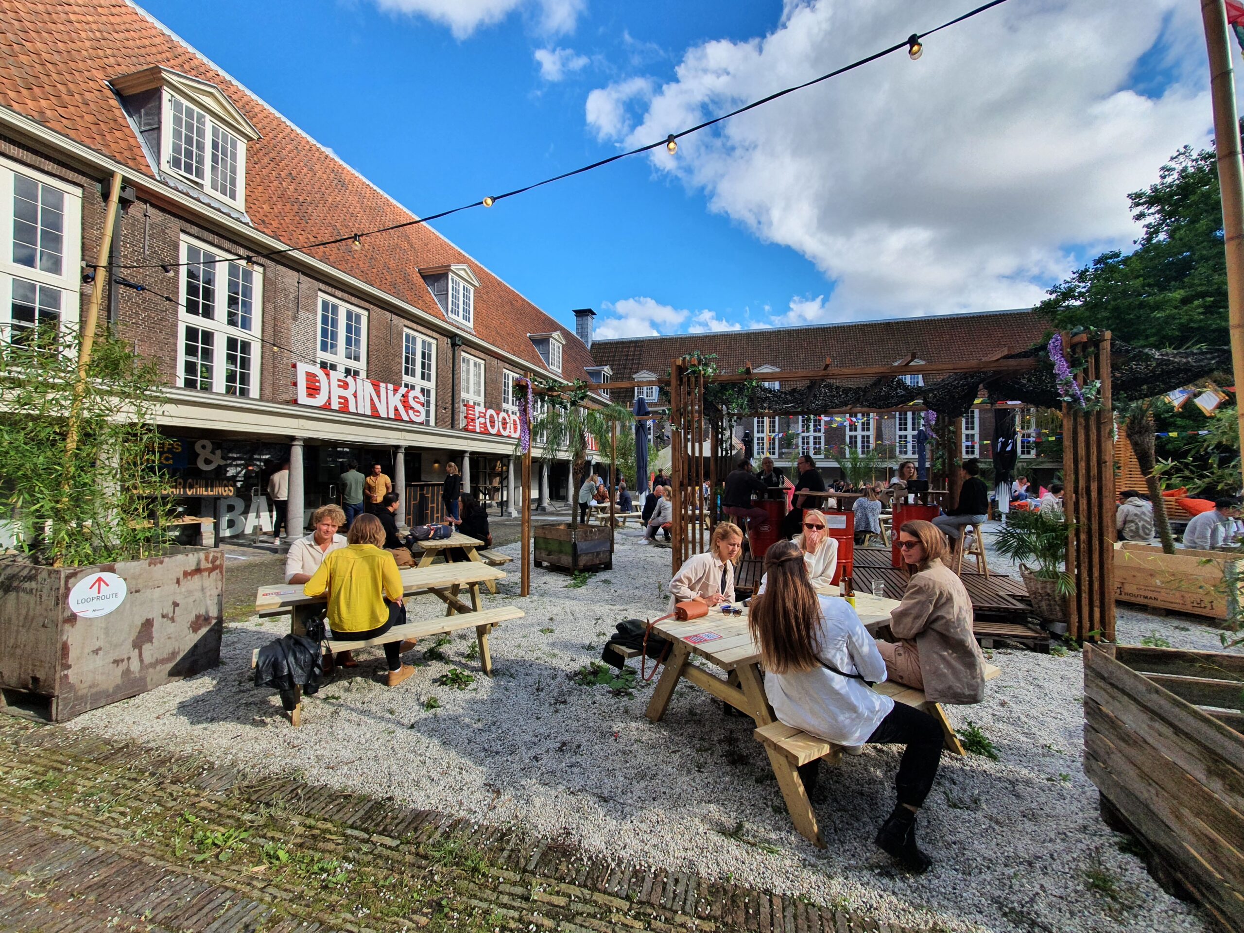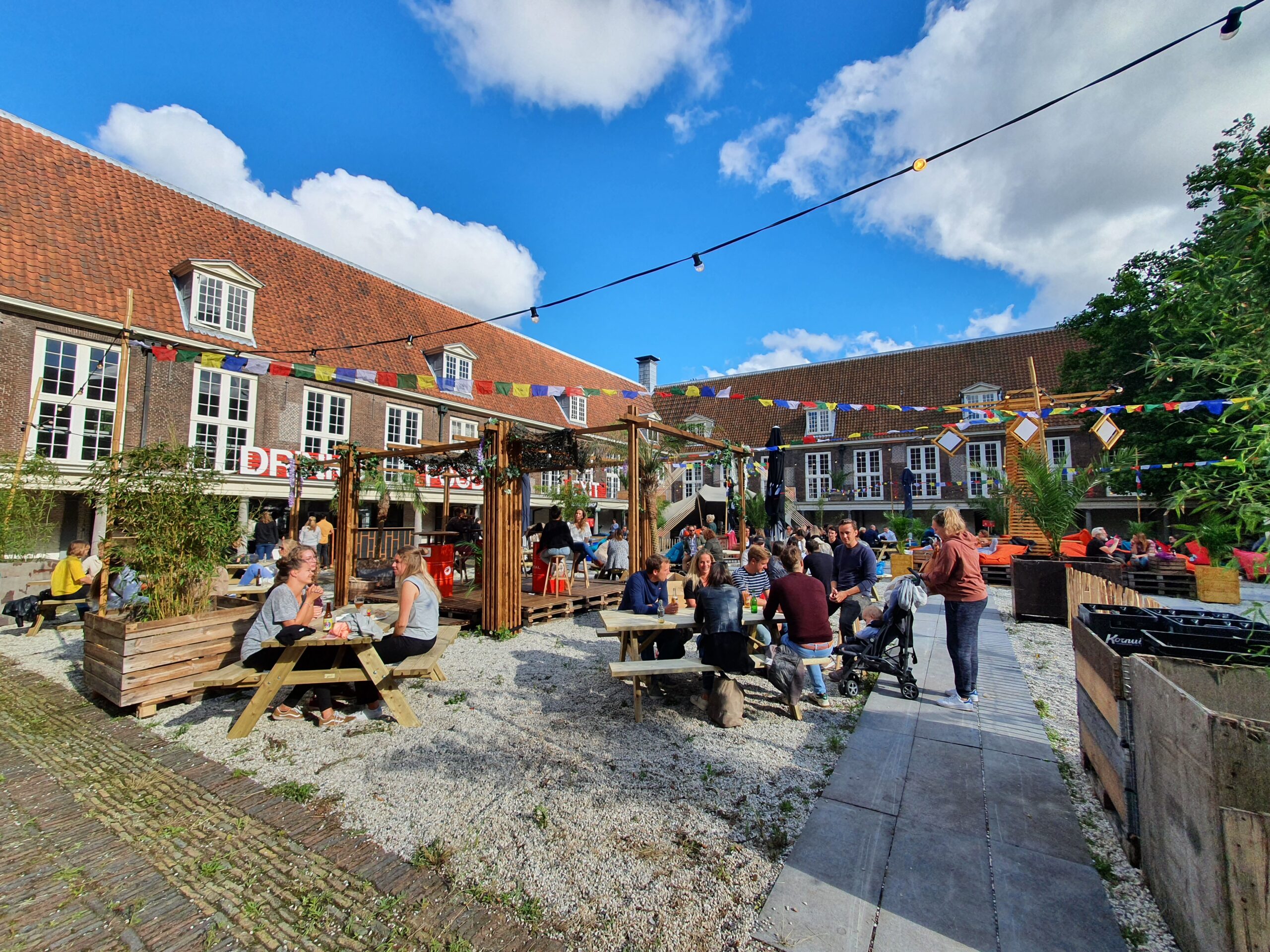 In de stralende zon opende De Buurt 1.5 vrijdagmiddag op het binnenterrein van het Pesthuis in Leiden. De Buurt was vier jaar geleden een zeer succesvolle pop-up hotspot tegenover station Leiden Centraal en beleeft nu een tweede ‘corona-proof’ editie 1.5, waarbij de anderhalve meter in acht genomen wordt.