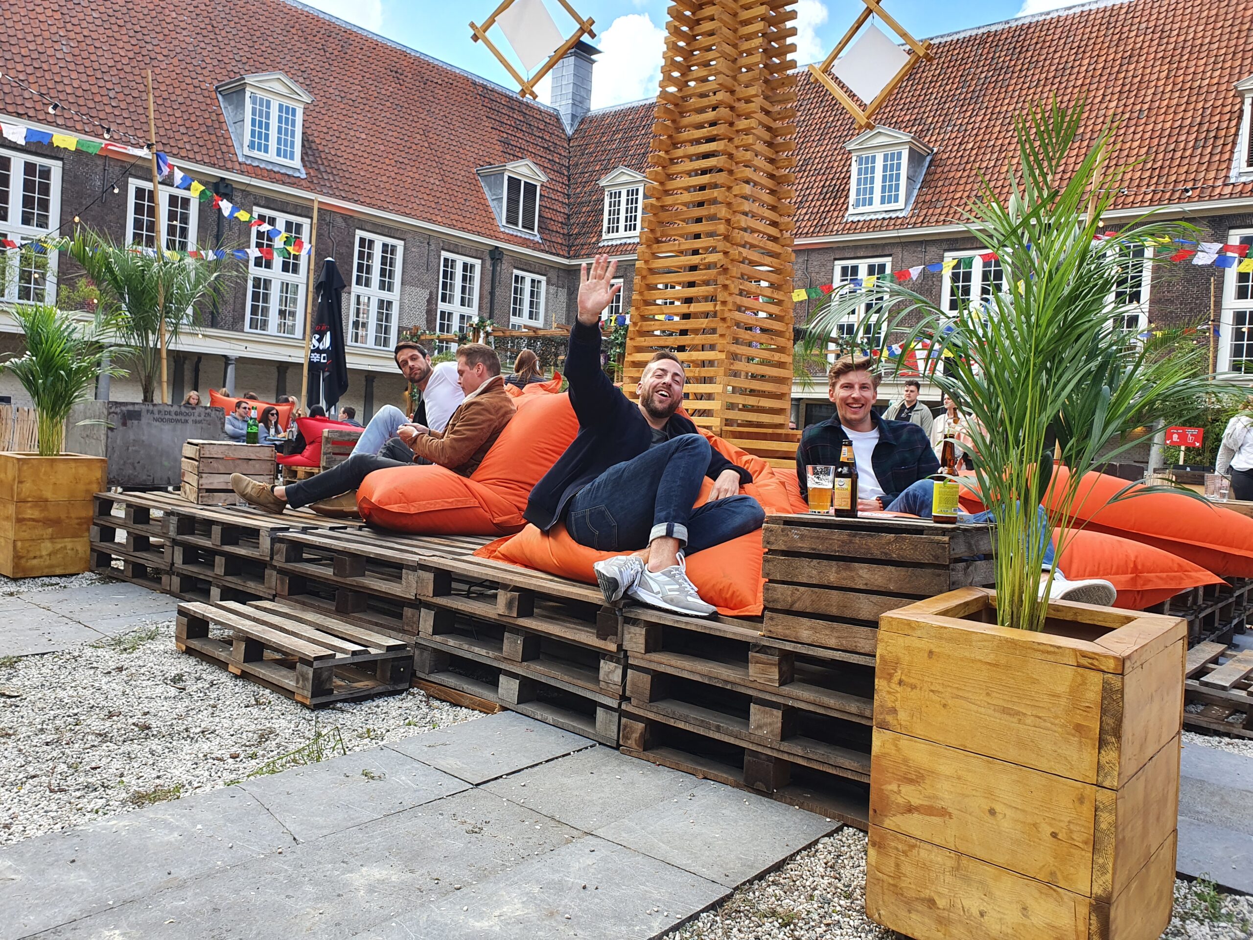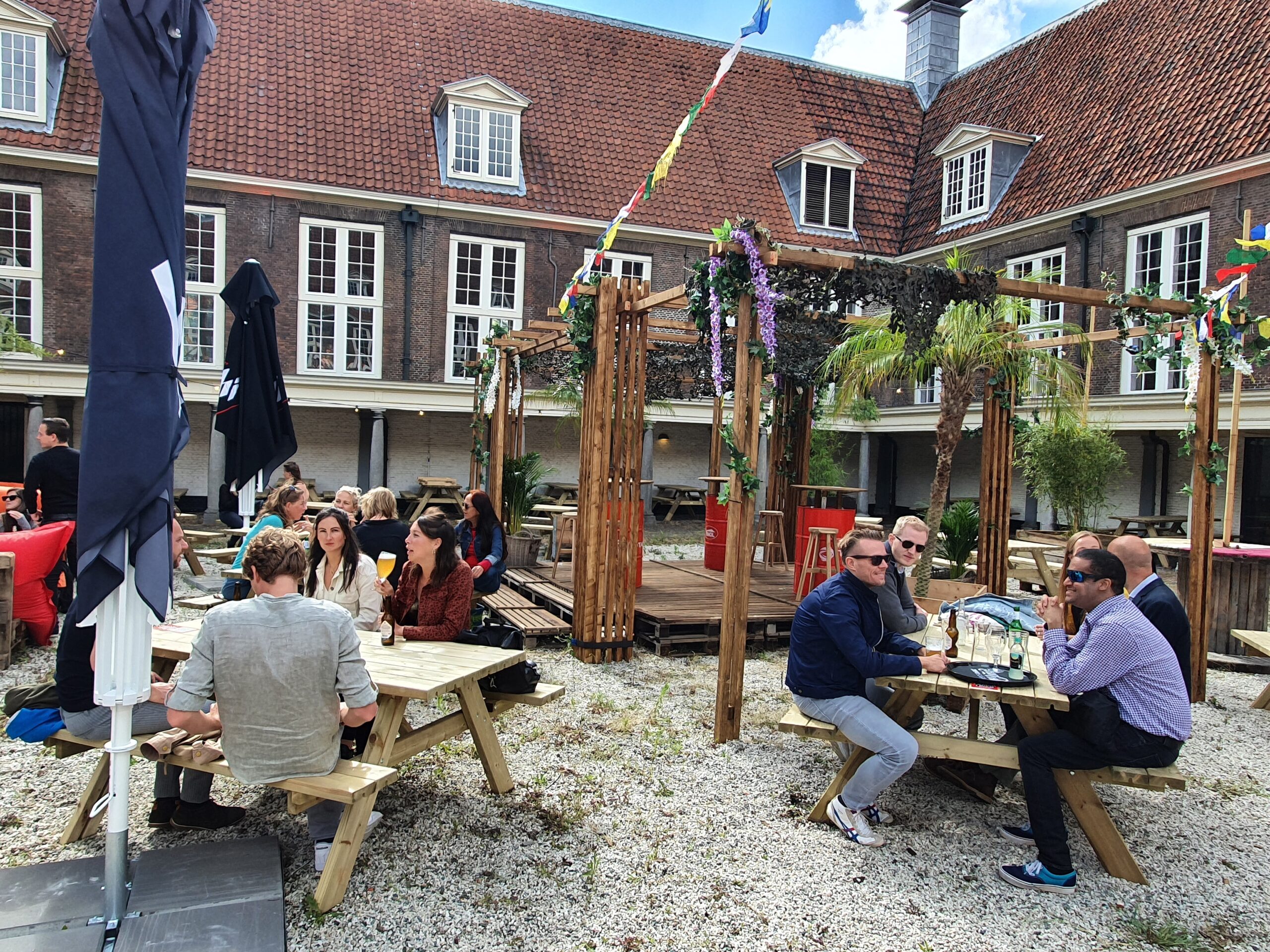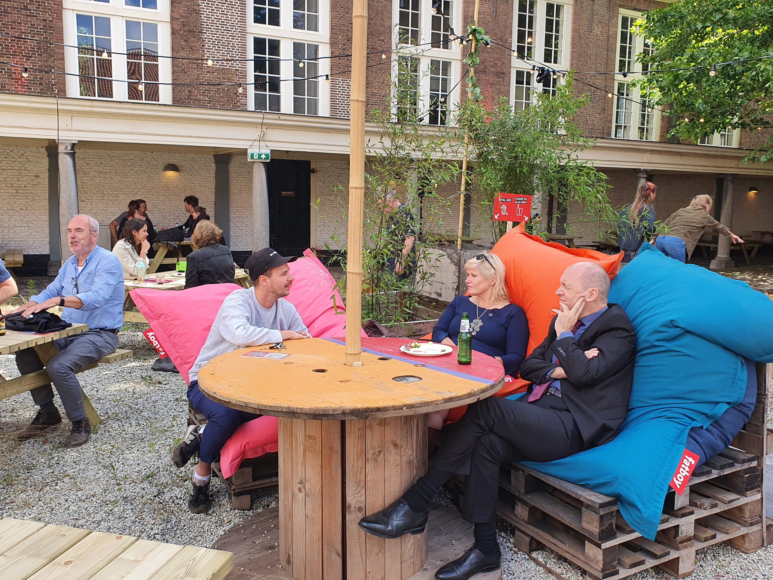 In de stralende zon opende De Buurt 1.5 vrijdagmiddag op het binnenterrein van het Pesthuis in Leiden. De Buurt was vier jaar geleden een zeer succesvolle pop-up hotspot tegenover station Leiden Centraal en beleeft nu een tweede ‘corona-proof’ editie 1.5, waarbij de anderhalve meter in acht genomen wordt.