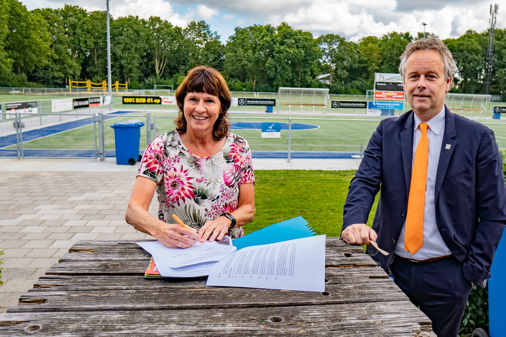 Tijdens een feestelijke bijeenkomst voor het clubgebouw zette sportwethouder Willem Joosten donderdagmiddag om 16.30 uur als eerste zijn handtekening onder de nieuwe huurovereenkomst. Daarna volgde Ine Goedegebuur (penningmeester), Lianne van der Kruk (secretaris) en Anita van Bentum (voorzitter) namens Velocitas.