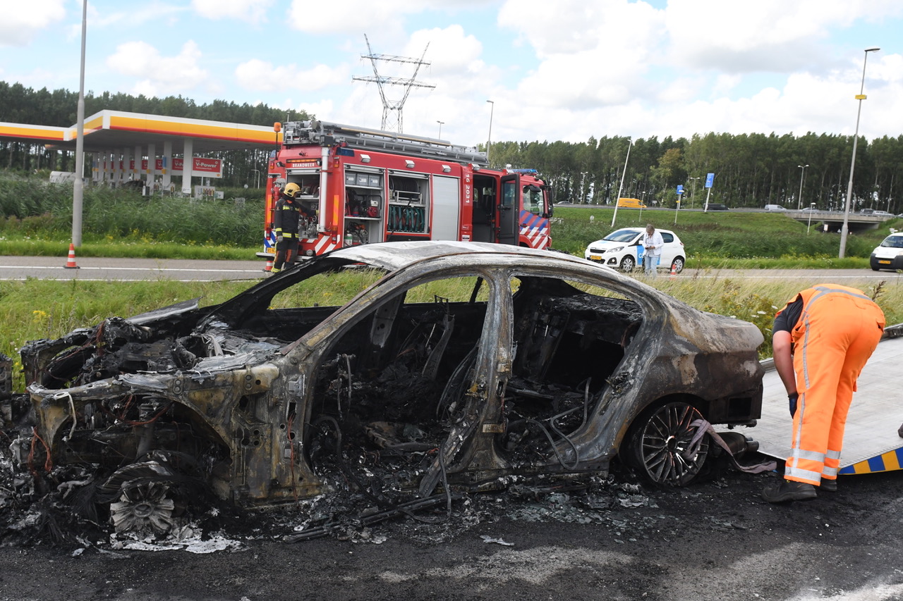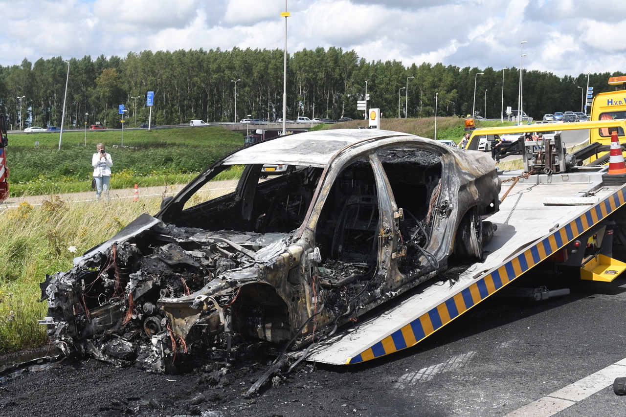De brandweer en andere hulpverleners hebben niet weten te voorkomen dat de auto volledig afbrandde. Een berger heeft de resten van de auto afgevoerd.