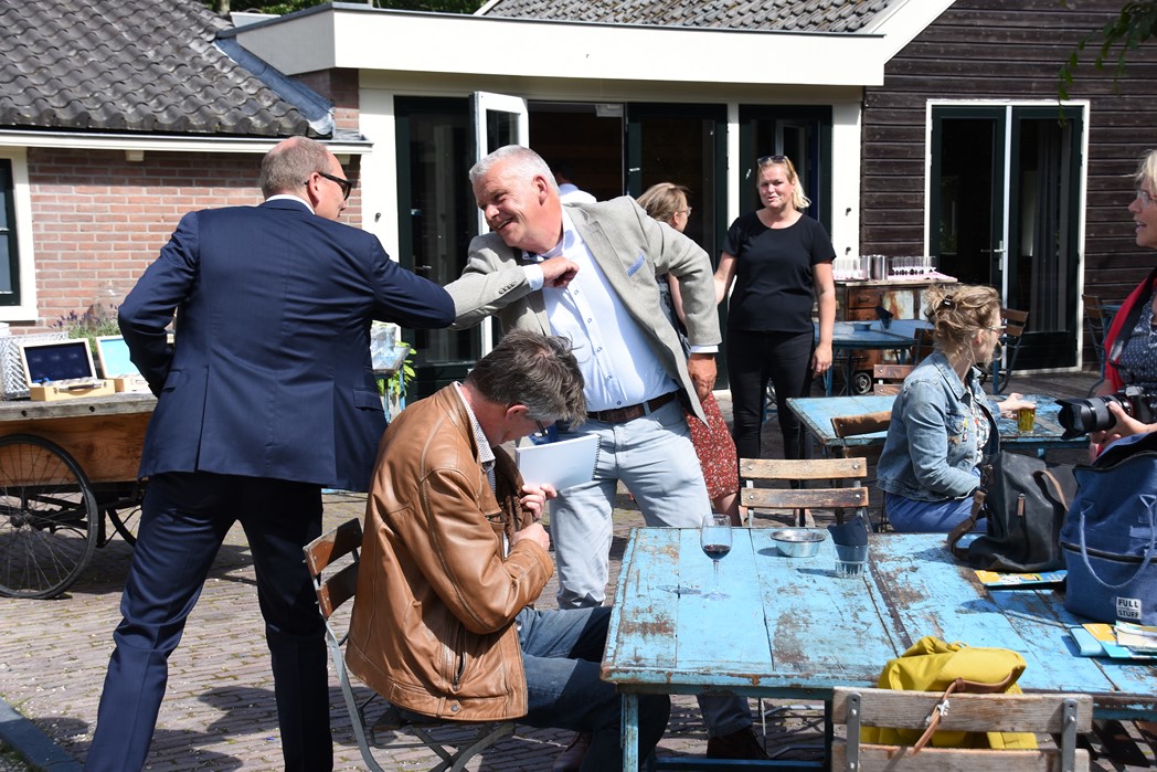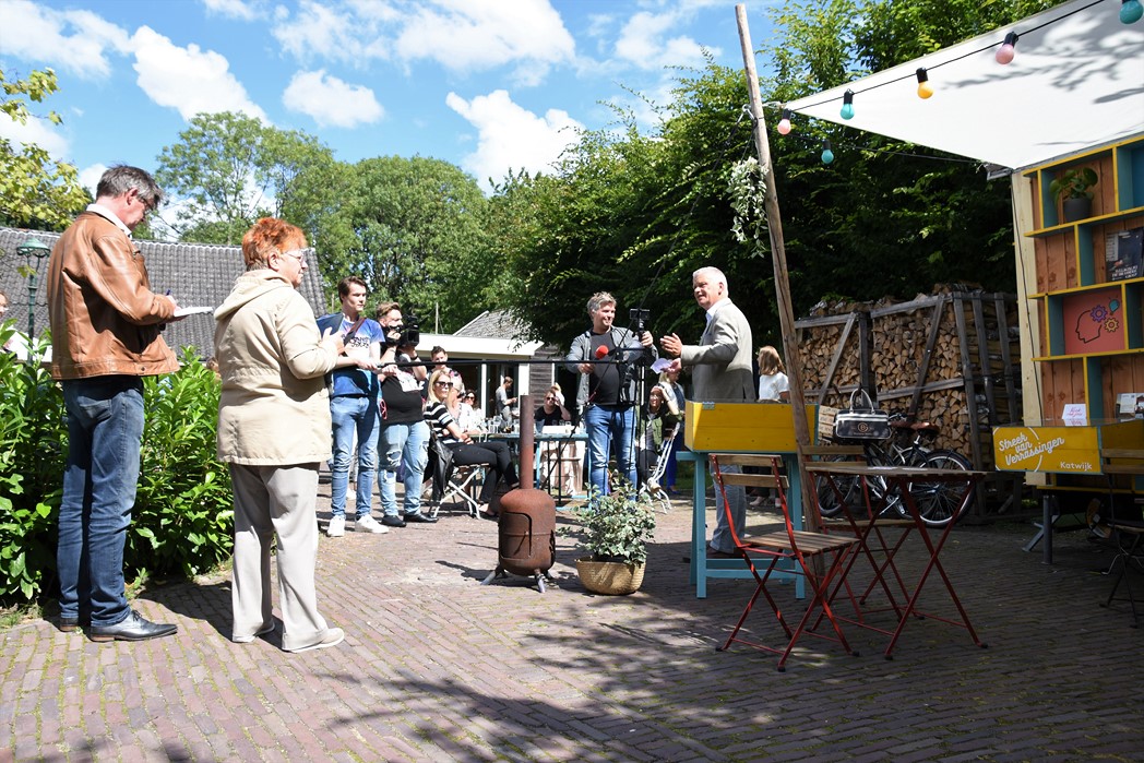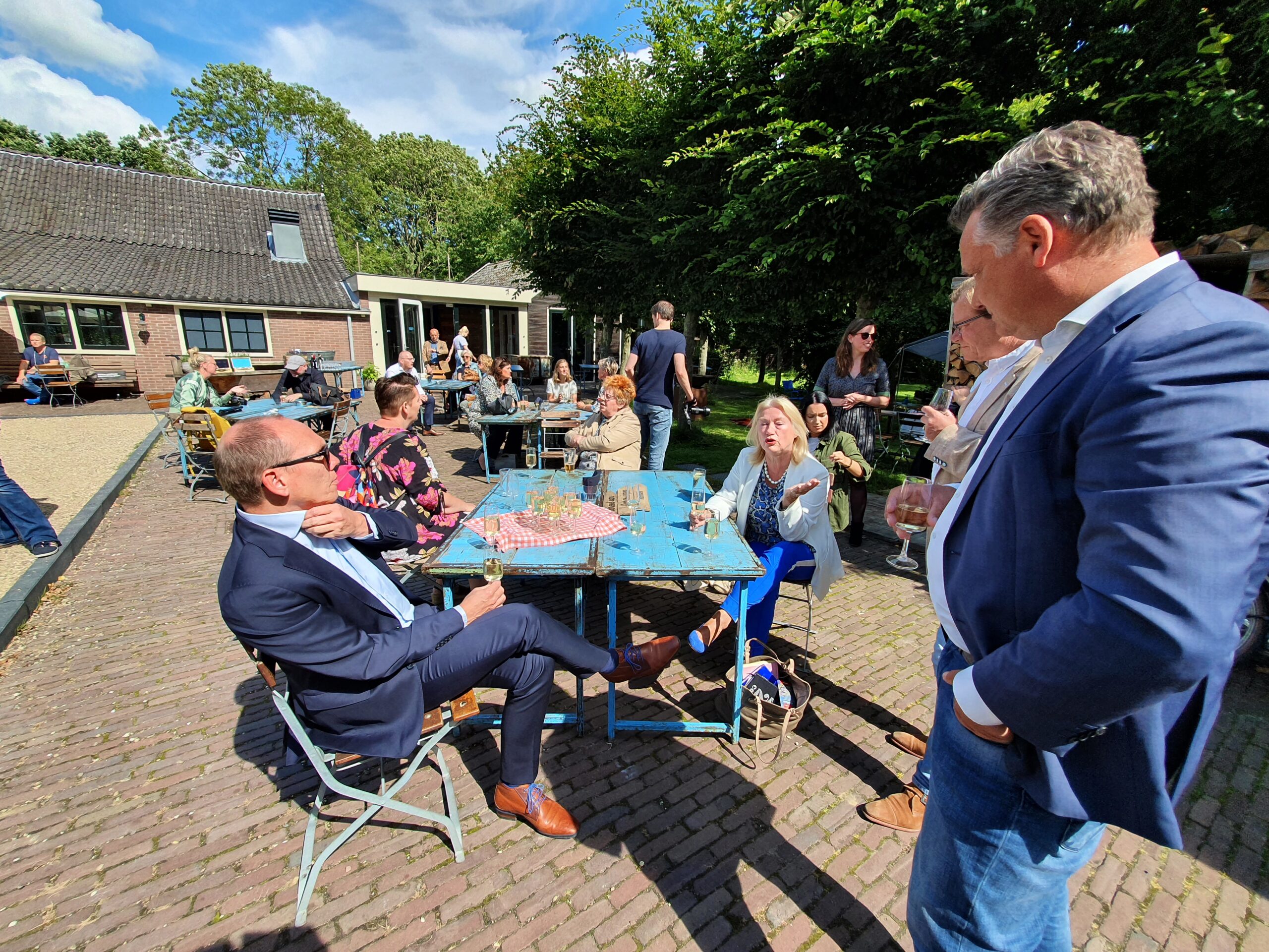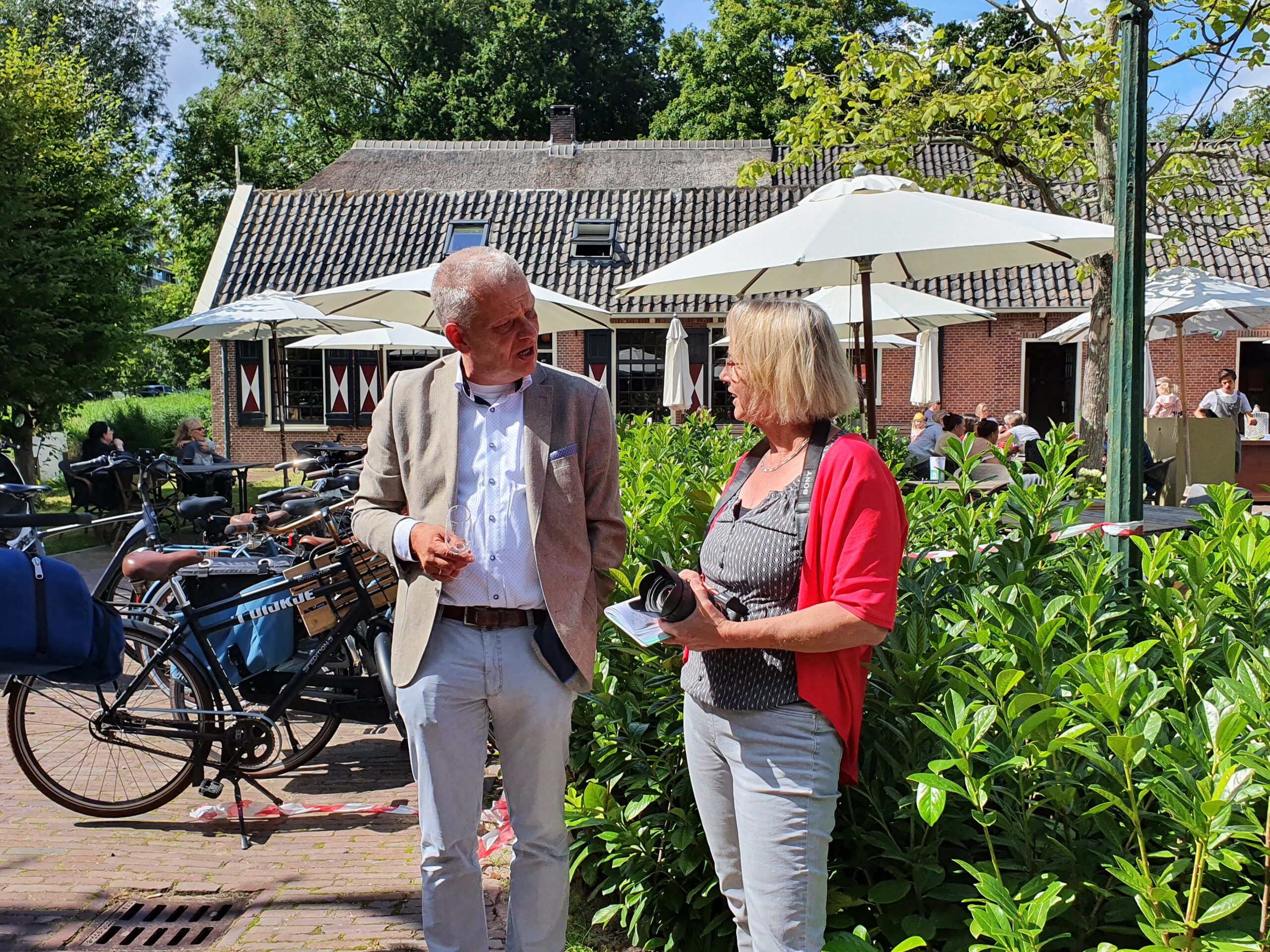 Chris de Waard in gesprek met Marjolijn van der Jagt van Dorpsmarketing Oegstgeest en de Leiderdorpse wethouder Daan Binnendijk.