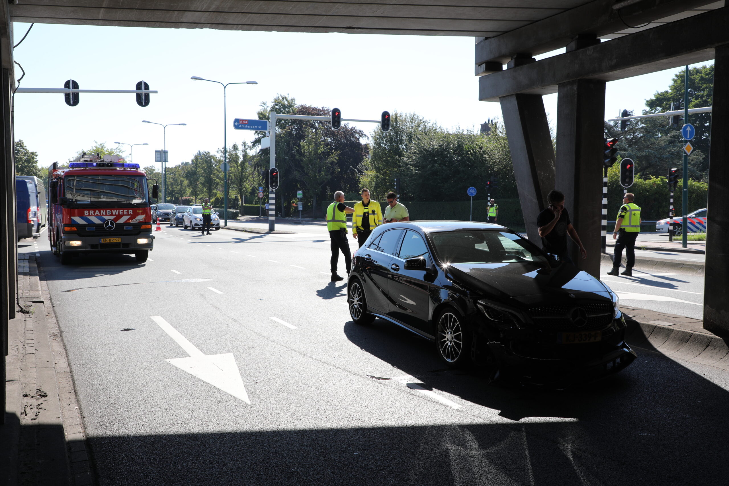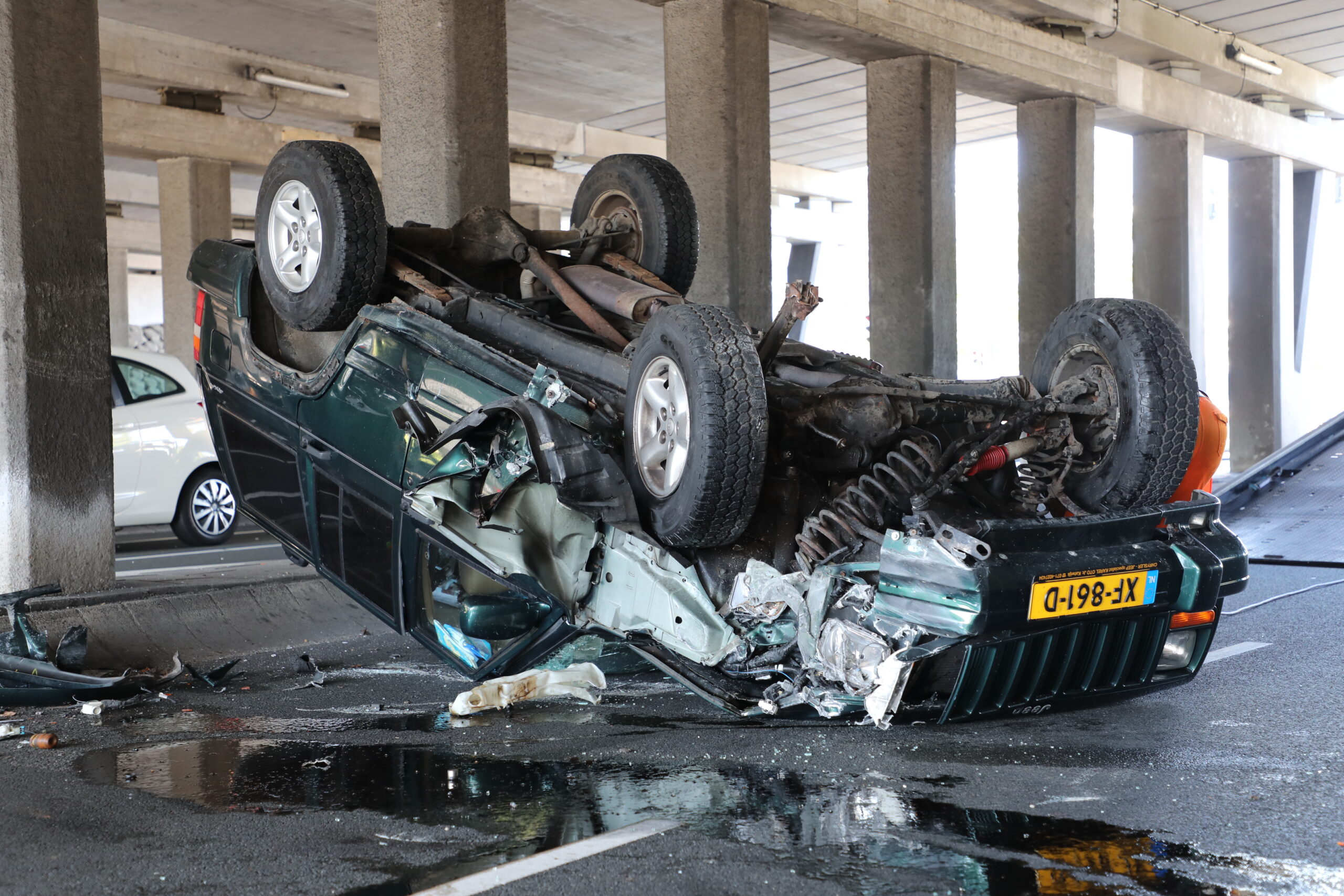 Onder het viaduct van de A44 op de Rijnzichtweg in Oegstgeest zijn vanochtend twee auto’s hard met elkaar in botsing gekomen. Daarbij is één van de auto’s op zijn kop beland.