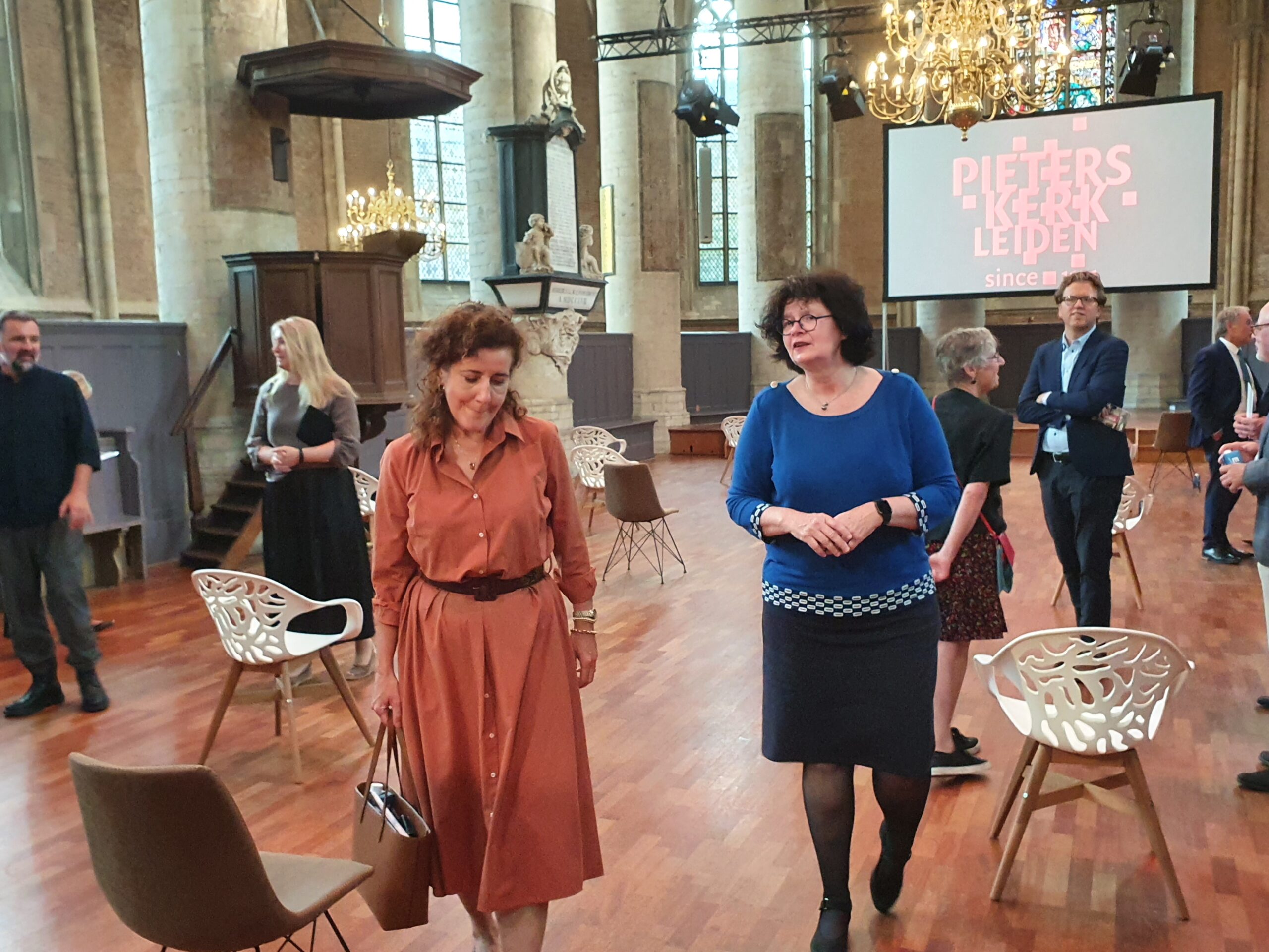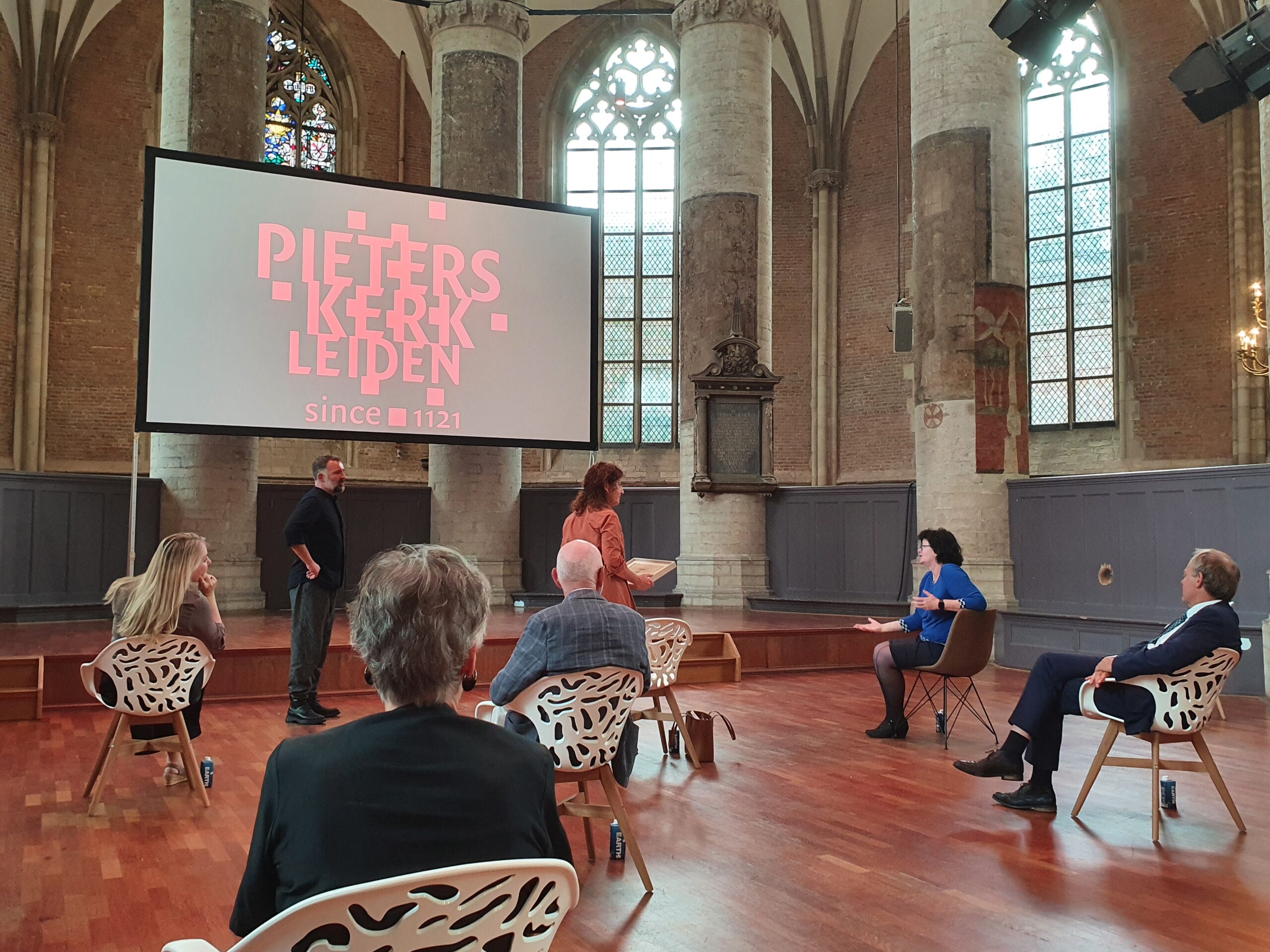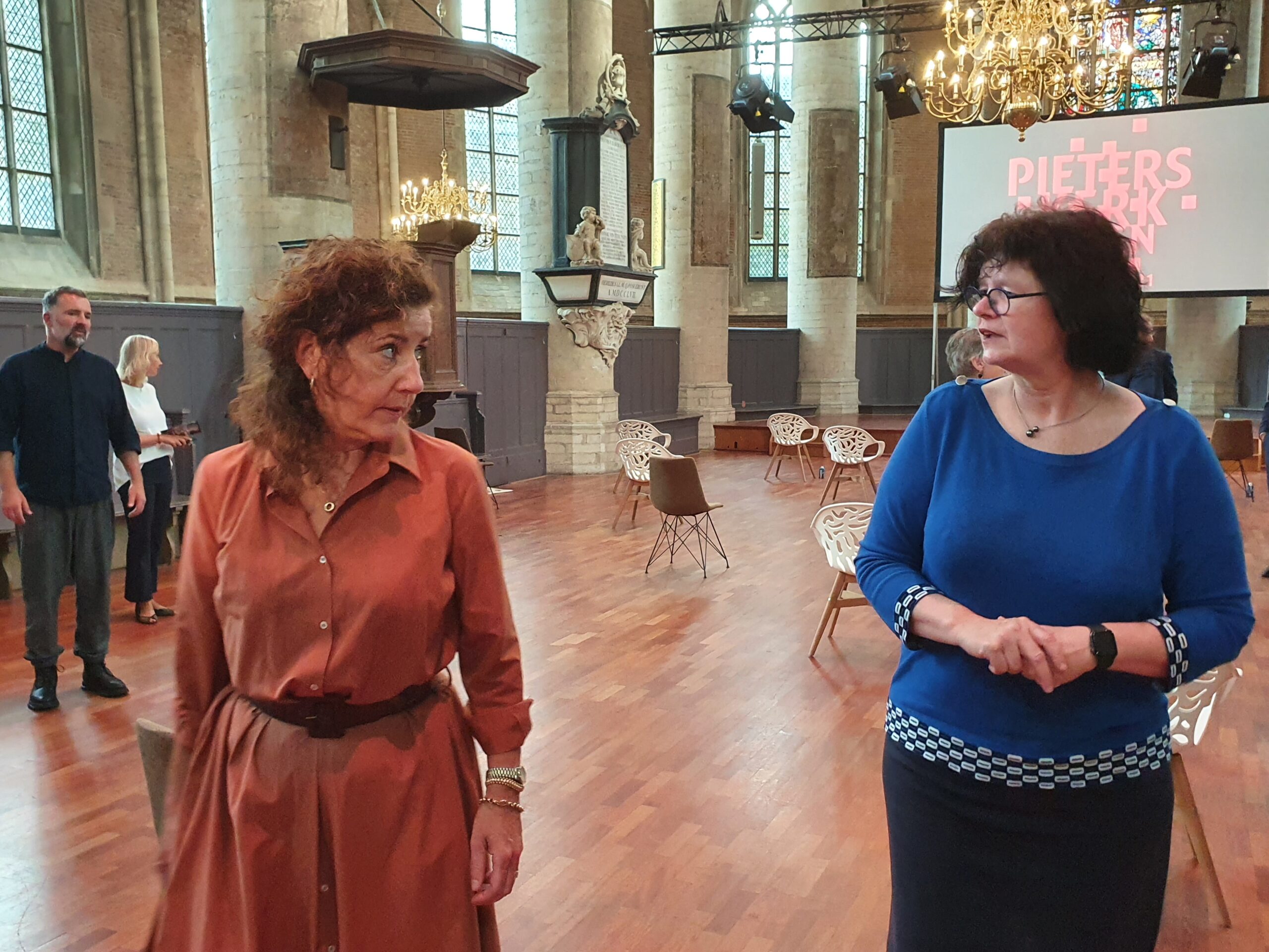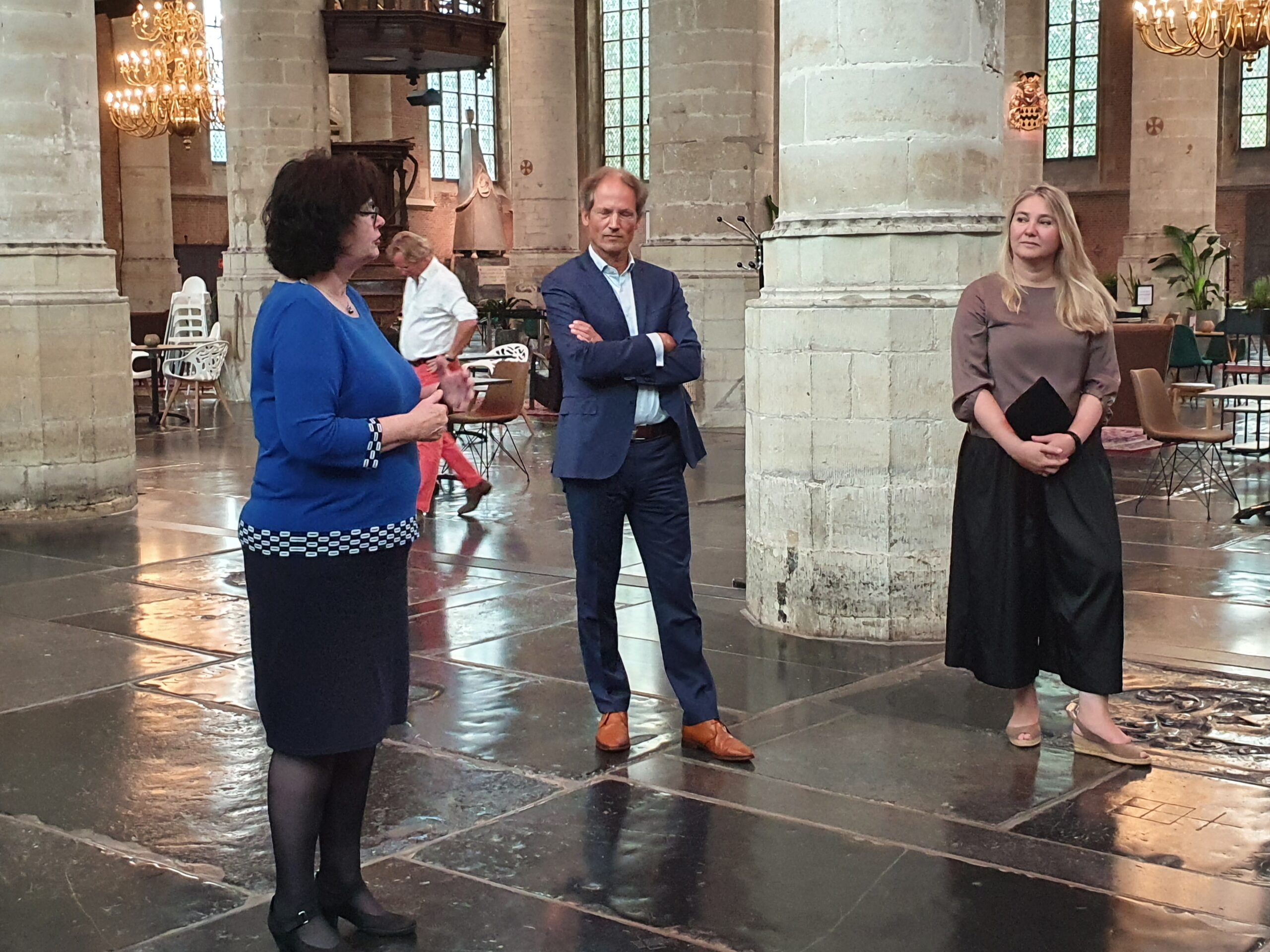 Chris de Waard sprak in de Pieterskerk met minister Ingrid van Engelshoven en directeur-bestuurder Frieke Hurkmans.