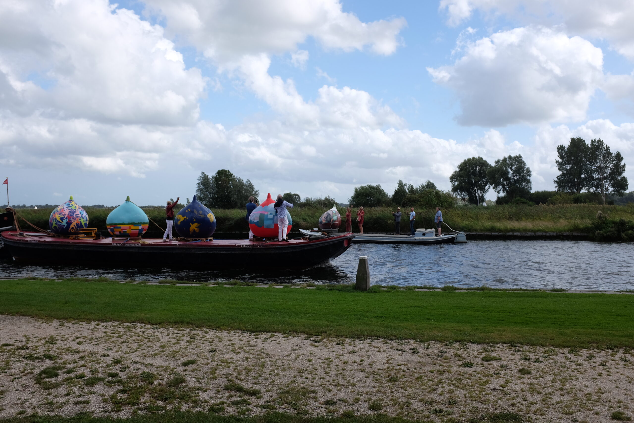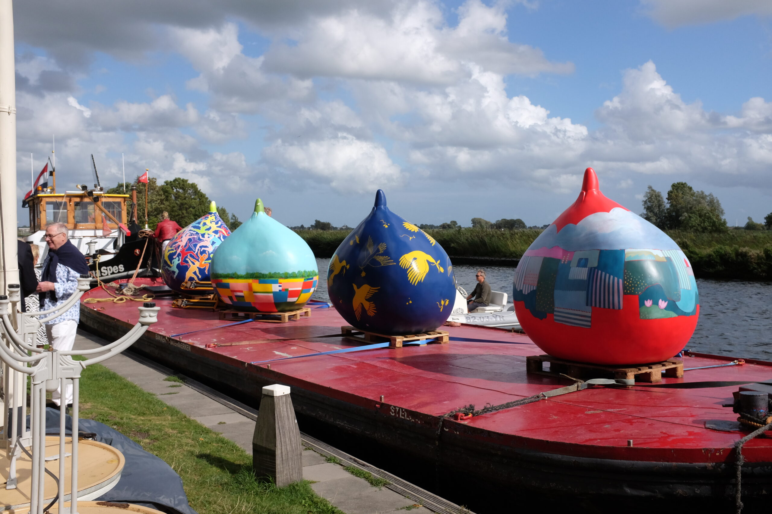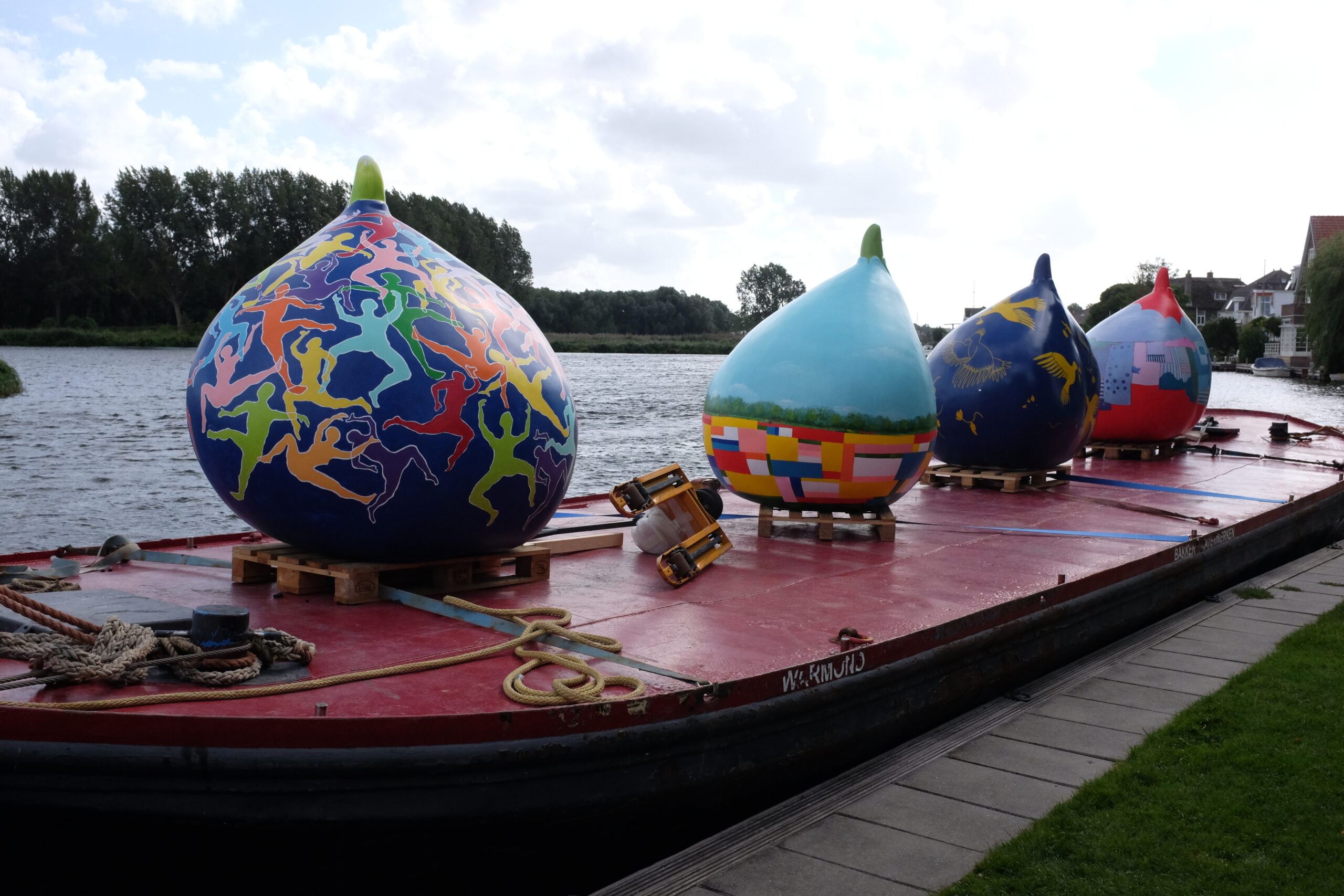 Vijf reuzenbollen van het project ‘Giant Tulip Bulbs’ werden afgelopen zaterdag van Lisse naar Warmond gevaren. De bollen zijn elk 1.85 meter hoog en onderdeel van een groot kunstproject in de Bollenstreek. Van Leiden tot Haarlem worden zo’n tachtig bollen geplaatst. “De verhalen achter deze bollen en de kunstwerken zelf zijn straks een mooie nieuwe toeristische attractie voor de streek”, vertelt Marjolein van der Jagt die zich bezig houdt met de promotie van de regio. “Zo worden straks tussen deze bollen fietsroutes aangelegd.”