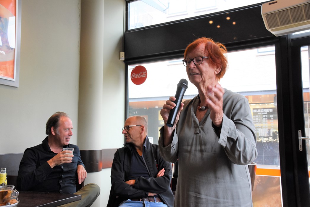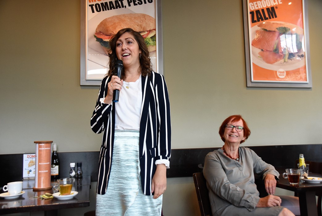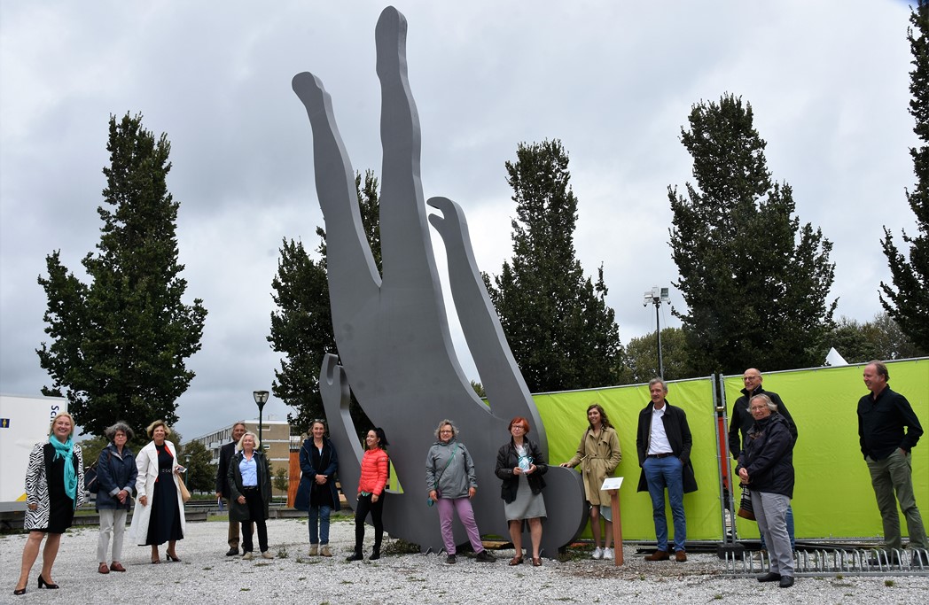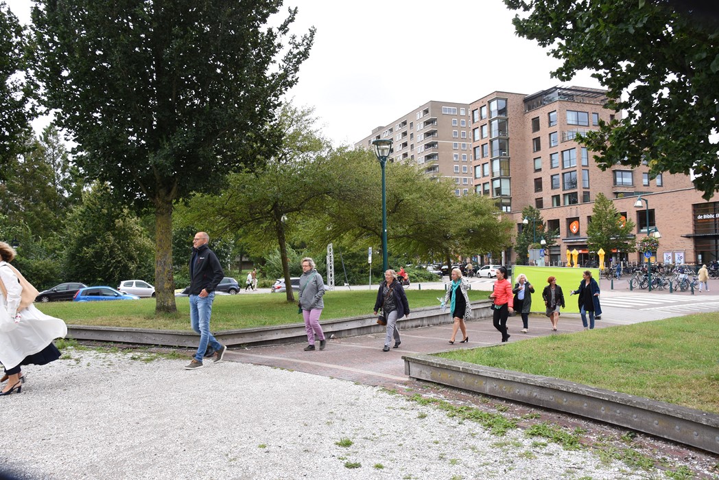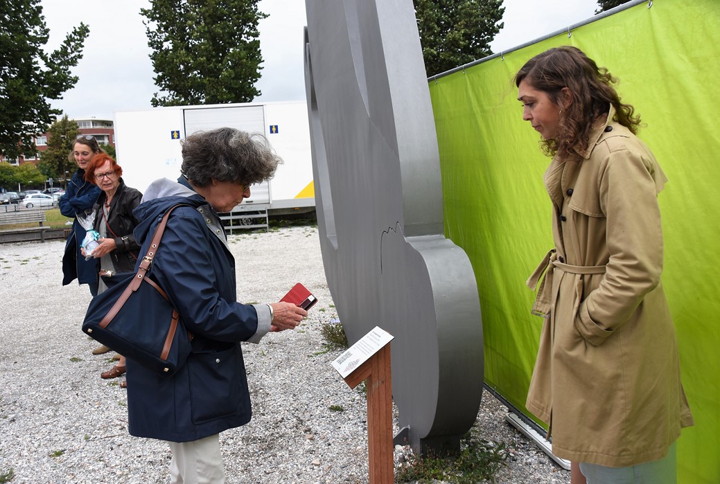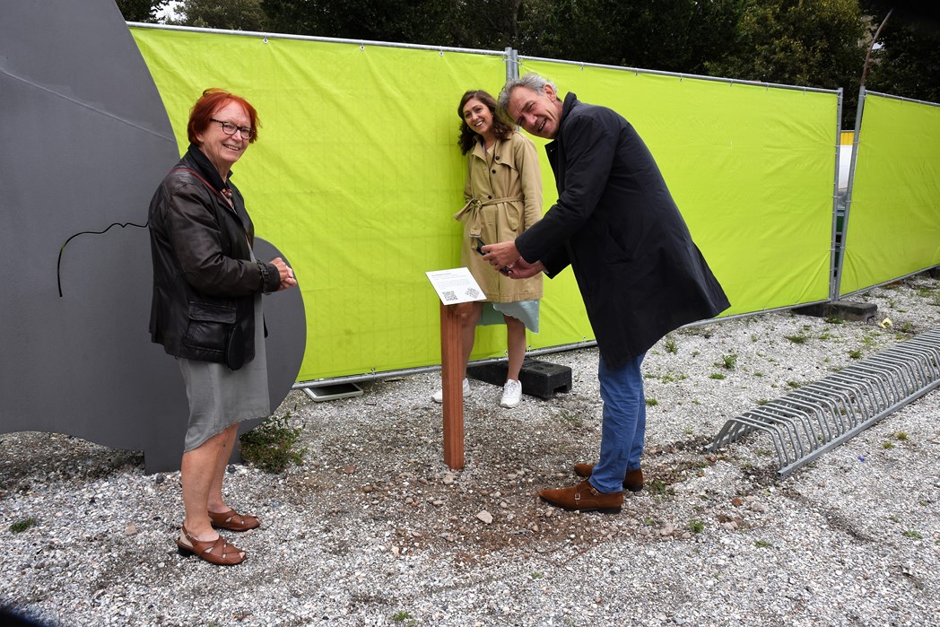 Wethouder Matthijs Huizing onthulde samen met voorzitter Jetteke Bolten van het cultuurfonds een bordje met een QR-code. Door de code met de smartphone te scannen kunnen allerlei verhalen worden beluisterd.