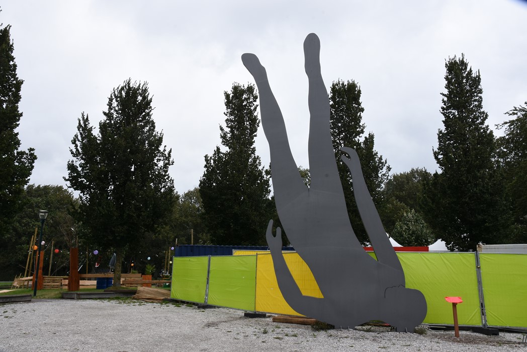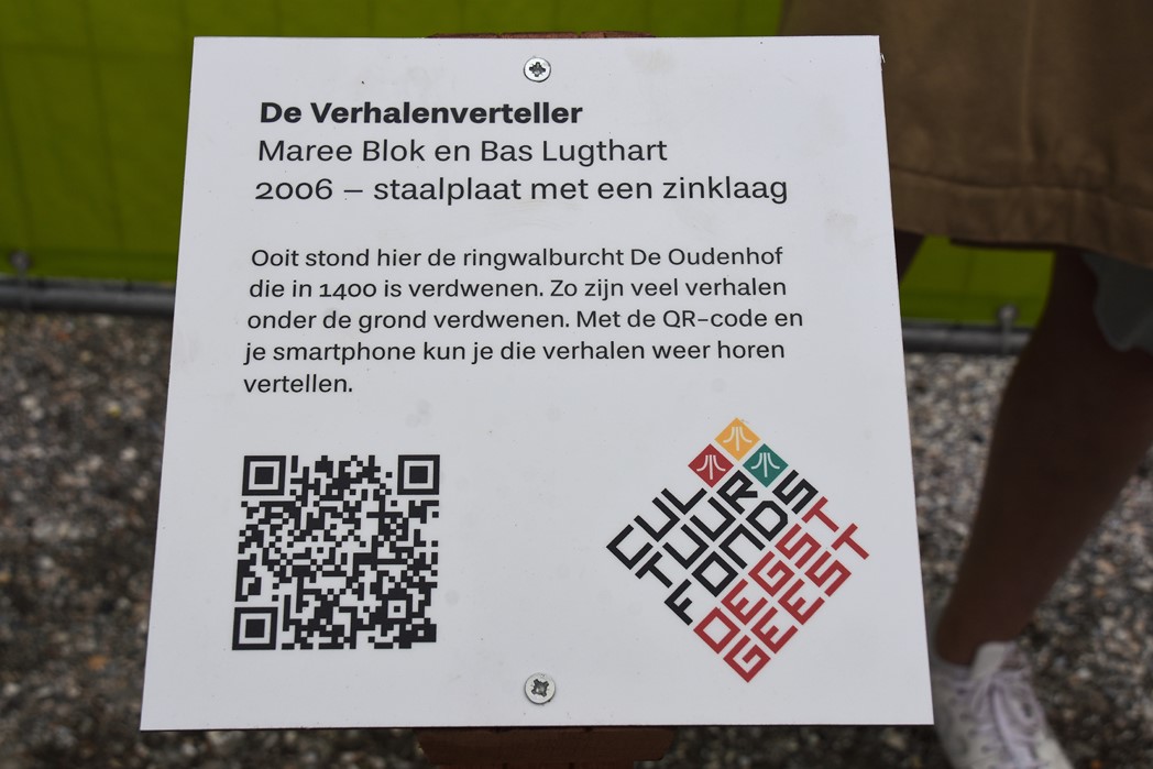 De Verhalenverteller vertelt de geschiedenis van Oegstgeest aan de hand van verhalen en herinneringen van de inwoners van Oegstgeest. ‘Staande boven op de heuvel legt de grote mensfiguur zijn oor te luisteren op de aarde onder zich, waar de resten liggen van de vroegmiddeleeuwse burcht de Oudenhof’.