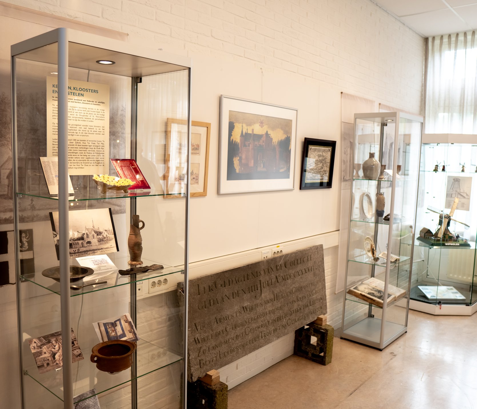 De openingstentoonstelling over de bevrijding van Leiderdorp is tot het eind van het jaar te bezoeken. Daarnaast wordt de geschiedenis van Leiderdorp vertelt in: ‘Weet waar je woont’. Vitrines geven een overzicht van de tweeduizend jarige geschiedenis van Leiderdorp. Aan de orde komen: de Romeinse tijd, Leithon (middeleeuwen), de Leiderdorpse kastelen en Klooster Engelendaal.