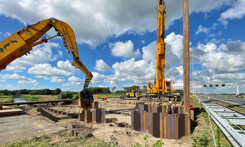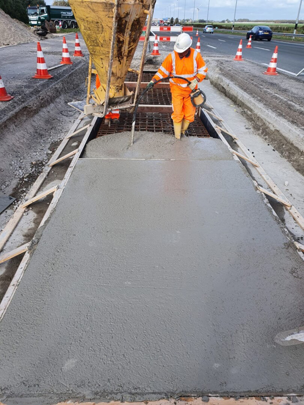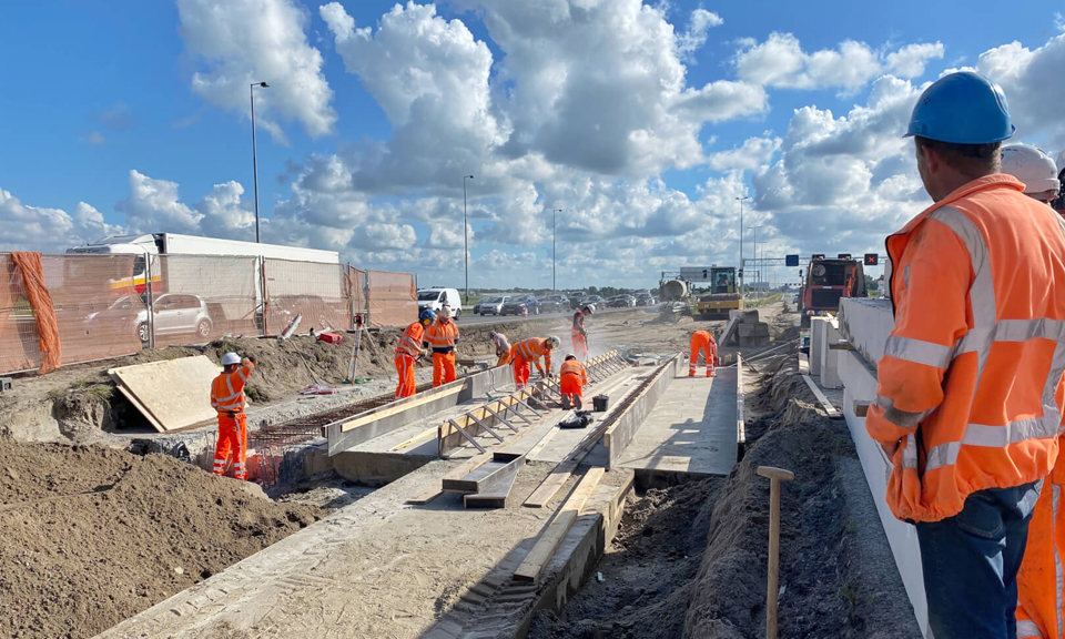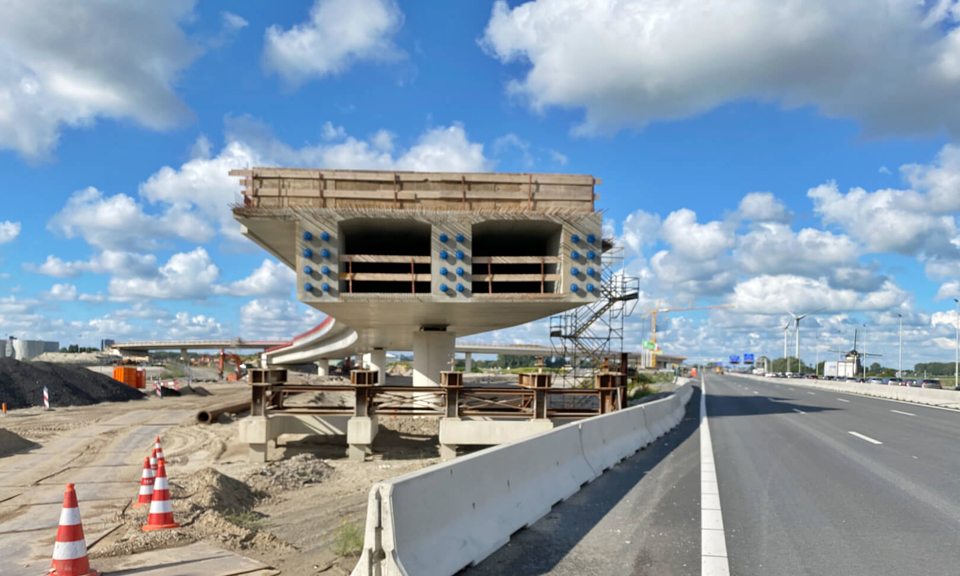 Er wordt gewerkt om de rijbaan richting Den Haag te verleggen naar de definitieve locatie. De rijbaan loopt dan onder het eerste deel van de fly-overs van het nieuwe knooppunt Hofvliet door.