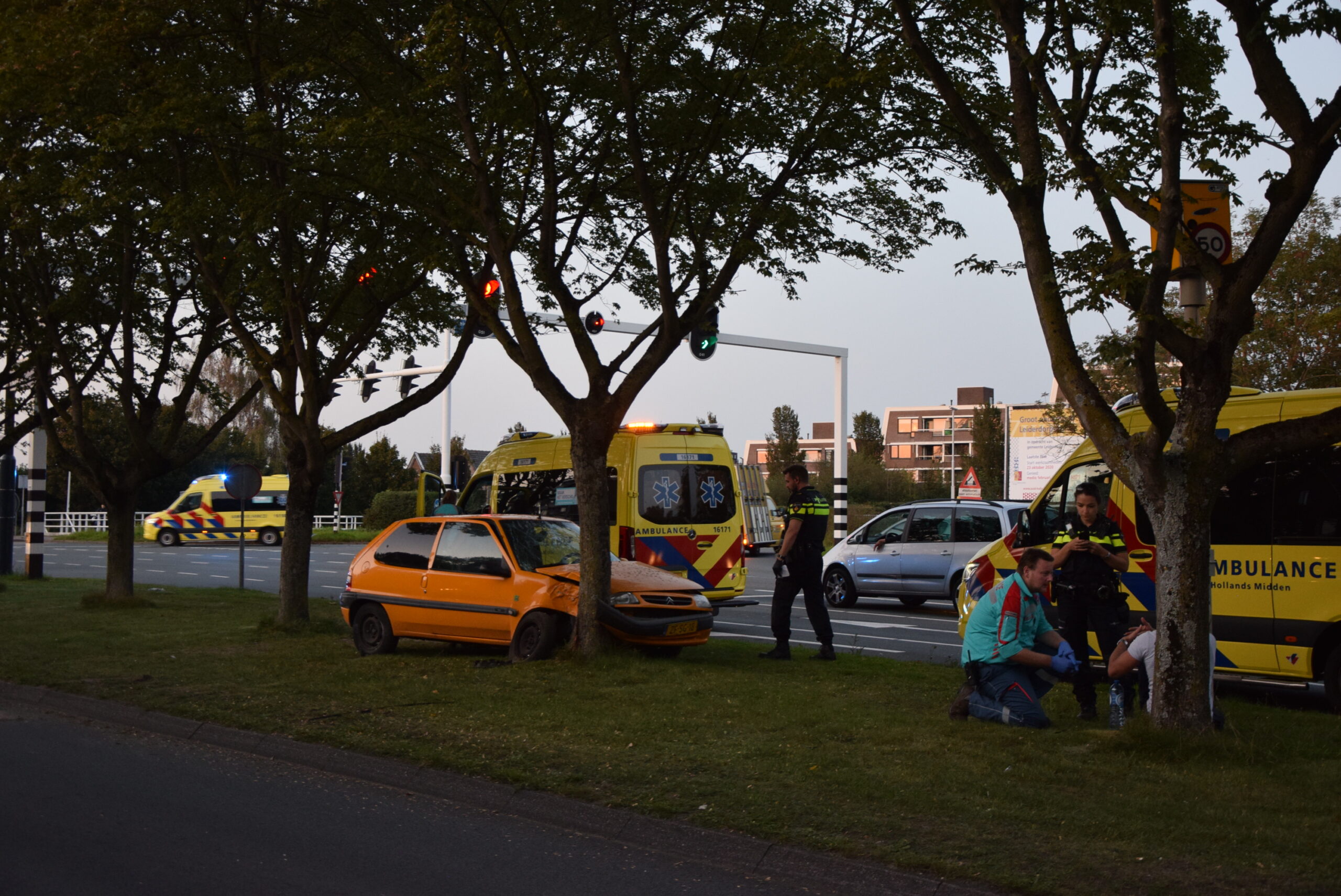 Een personenauto is zaterdagavond rond 19.30 uur tegen een boom geknald. Dat gebeurde op de Hoge Rijndijk ter hoogte van de Leiderdorpse brug. Daarbij raakte de bestuurder gewond. Hij is overgebracht naar het ziekenhuis.
