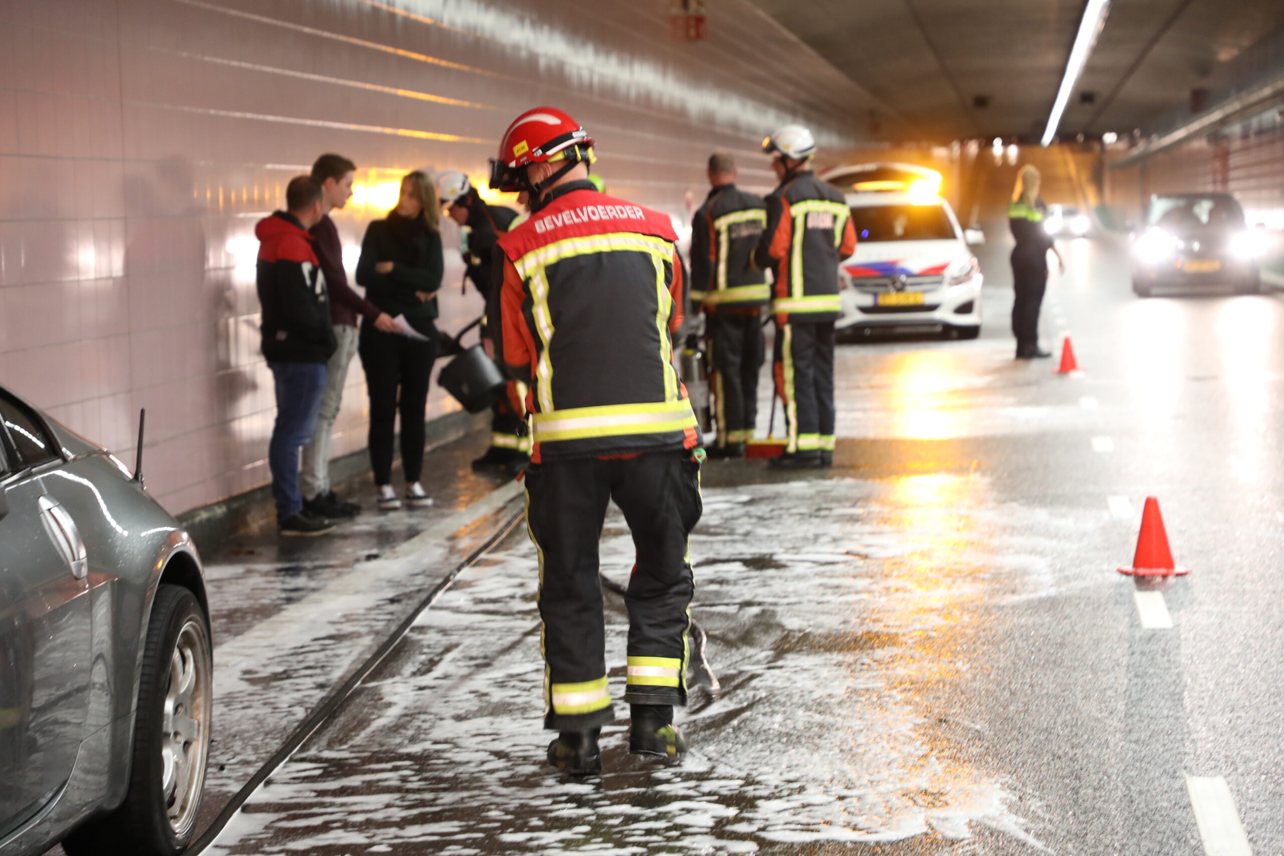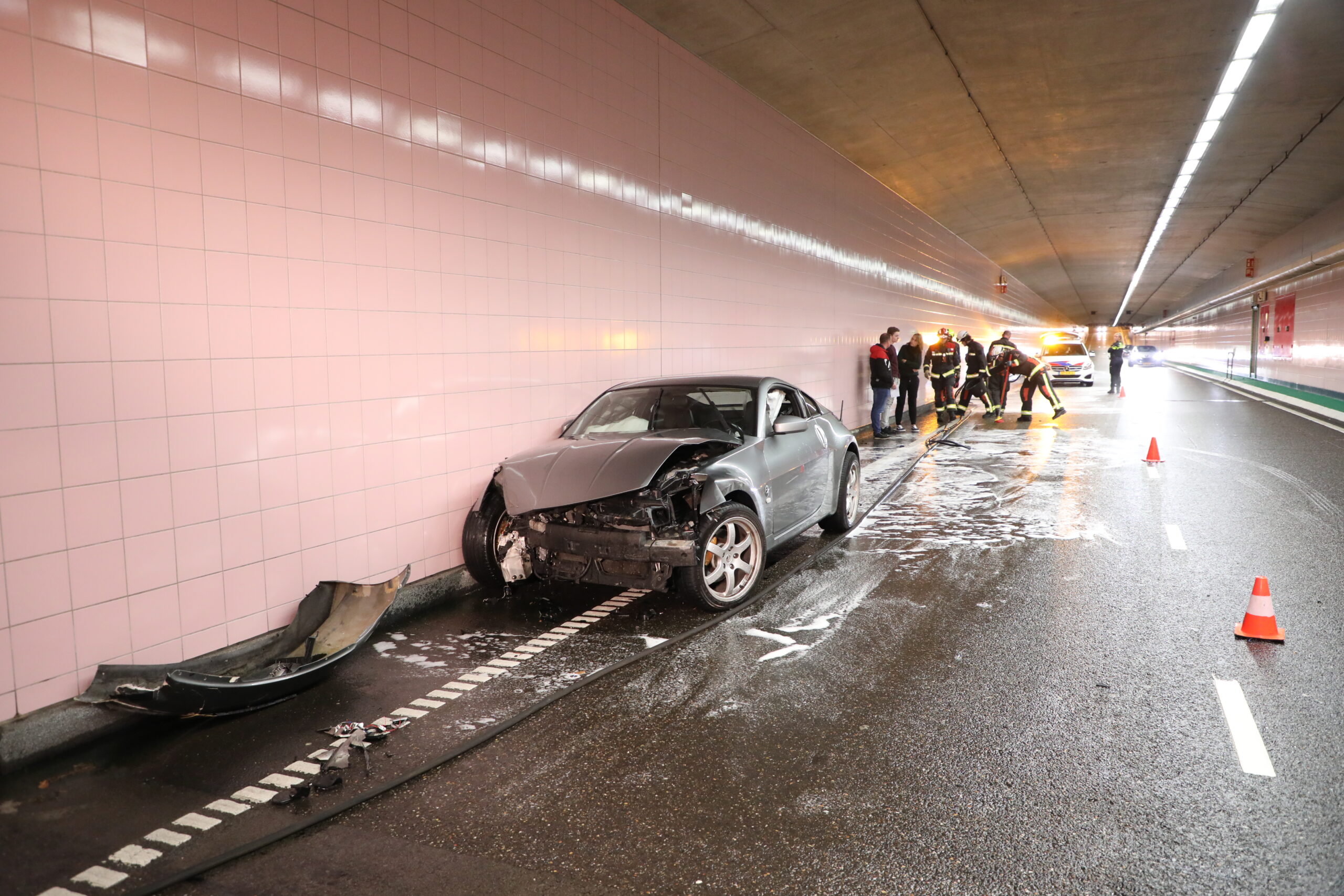 Een auto is vrijdagavond in de Stationspleintunnel tegen de wand gecrasht. Het voertuig raakte daarbij zwaar beschadigd.