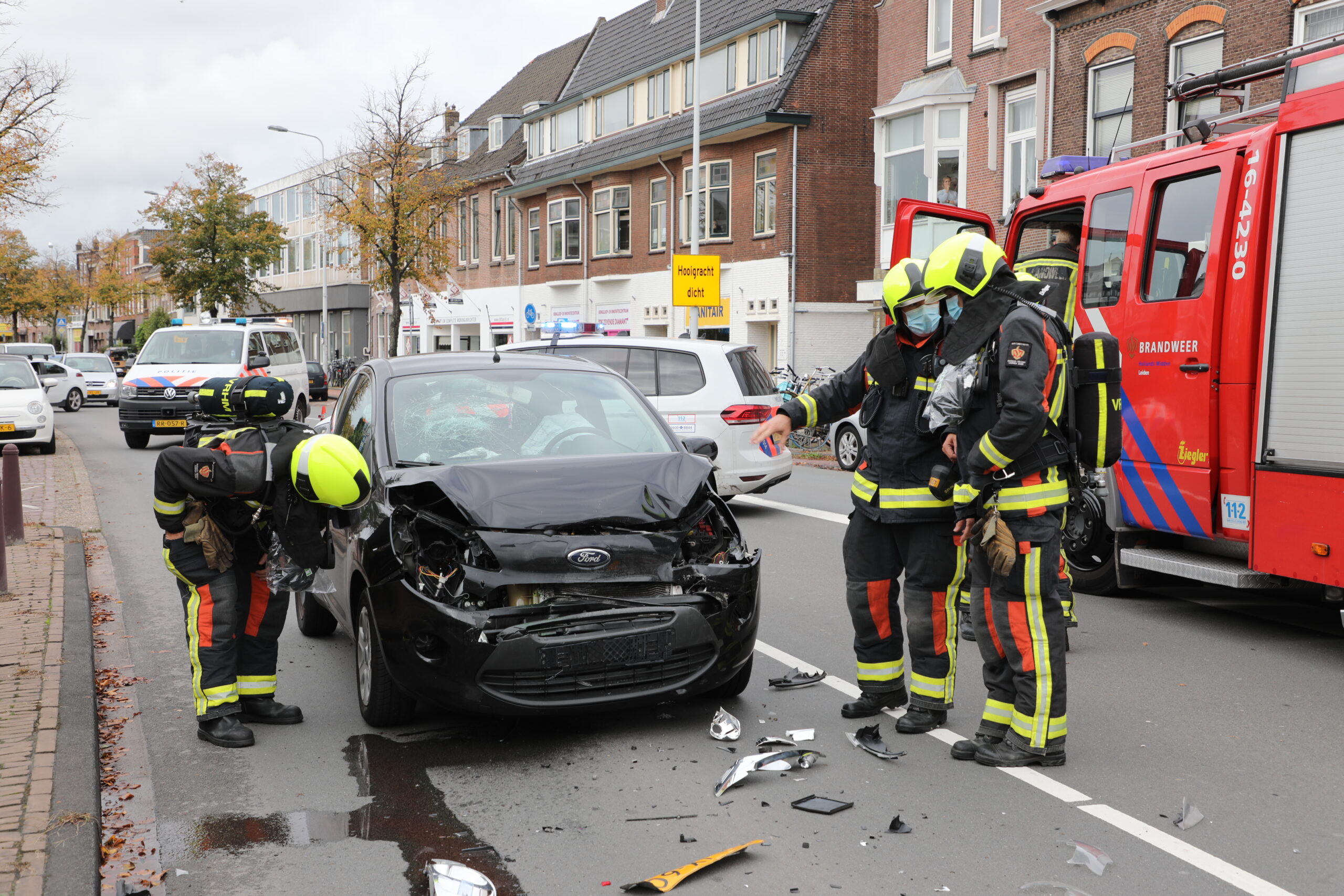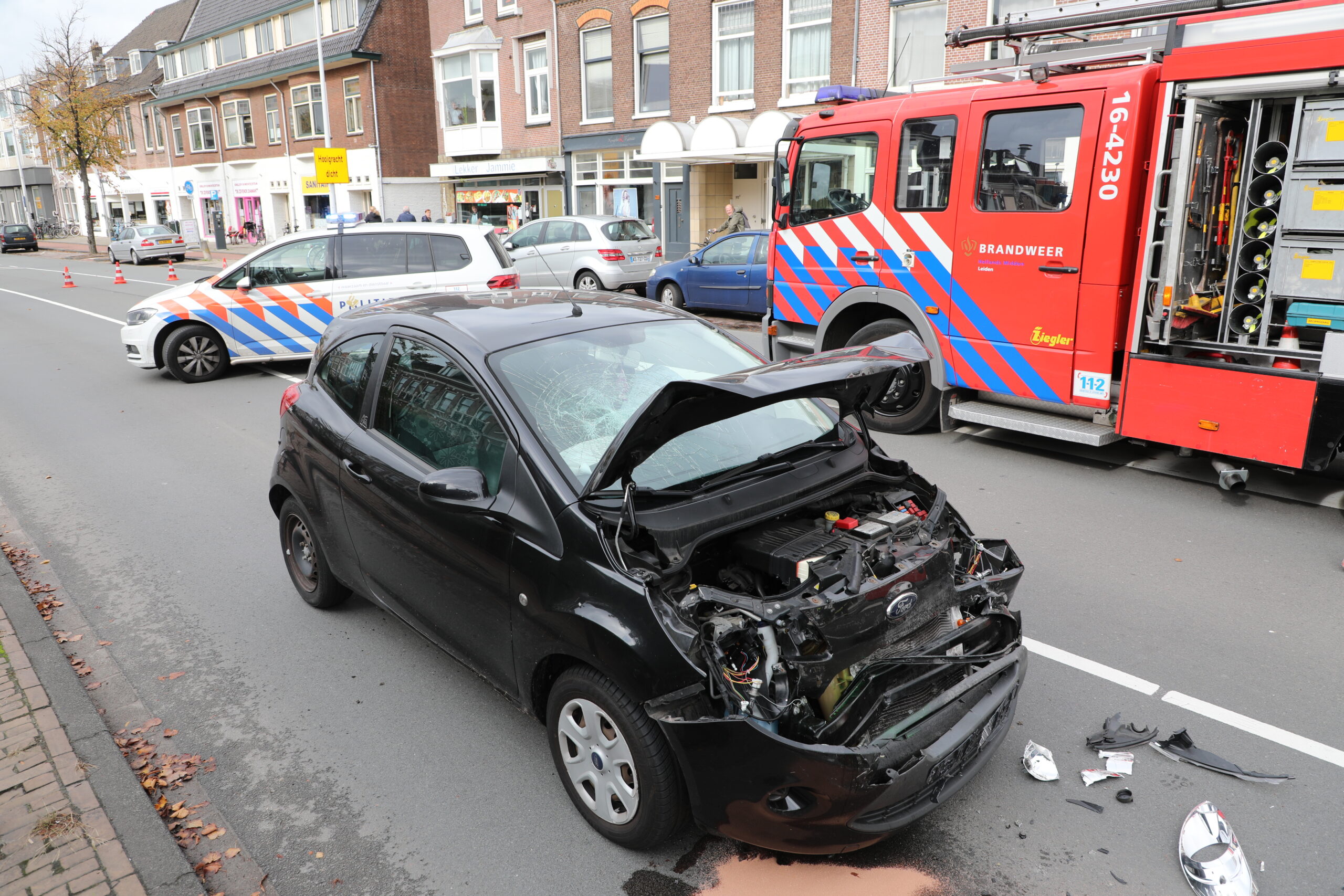 Bij een kop-staartaanrijding tussen twee personenauto’s op de Hoge Rijndijk in Leiden is woensdagmiddag een overstekende voetganger gewond geraakt. Het slachtoffer is per ambulance overgebracht naar het ziekenhuis. De bestuurders van de personenauto’s kwamen met de schrik vrij.