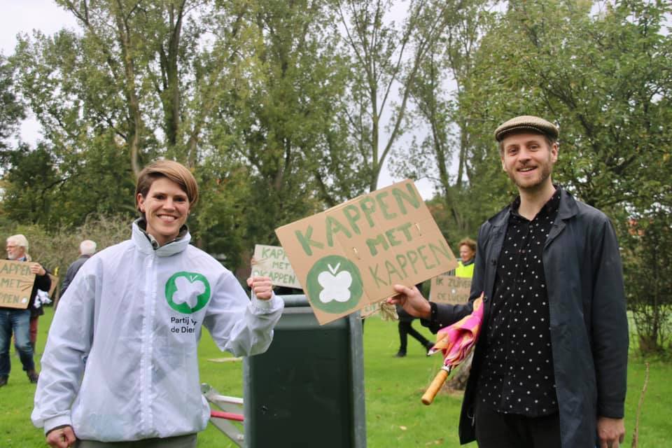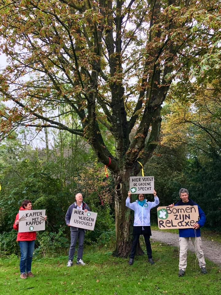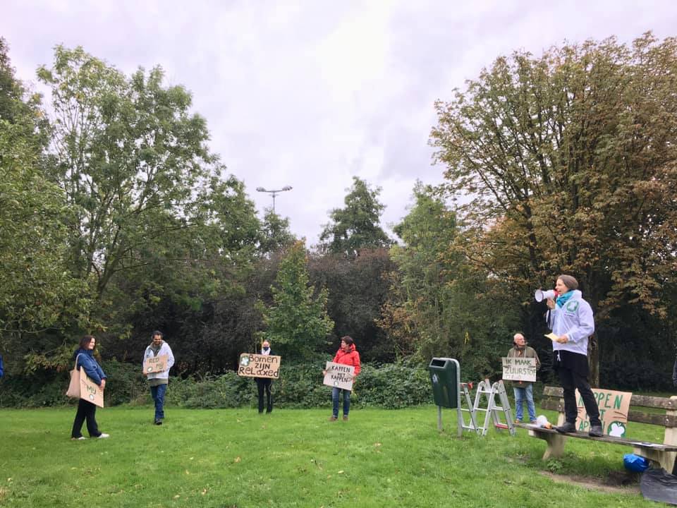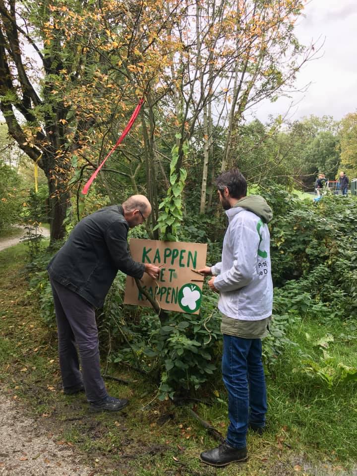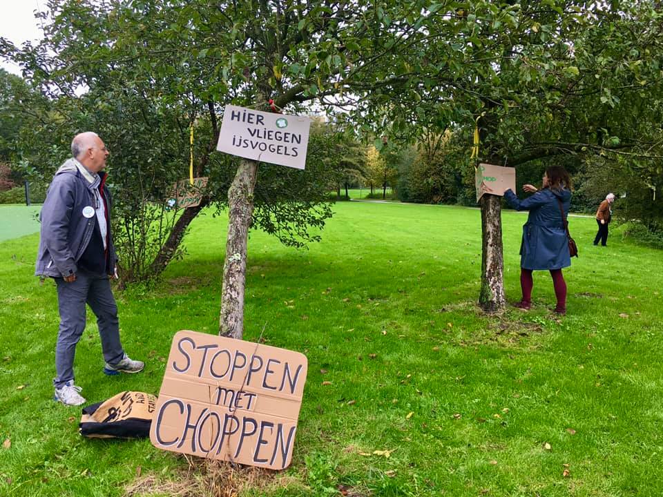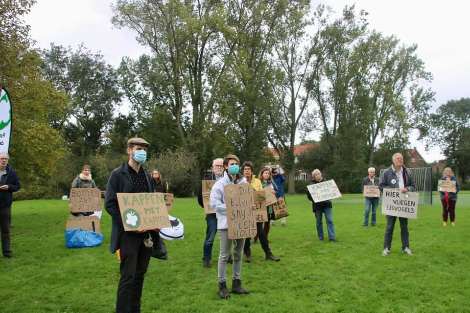 ‘Kappen met kappen in het Roomburgerpark’ luidt de oproep aan de Leidse politiek die binnenkort een besluit moet nemen over het plan. Er werd niet alleen gedemonstreerd met borden, maar ook de bomen die op de nominatie staan om omgezaagd te worden, werden gemarkeerd. In verband met de coronamaatregelen was vooraf geen ruchtbaarheid aan de actie gegeven.