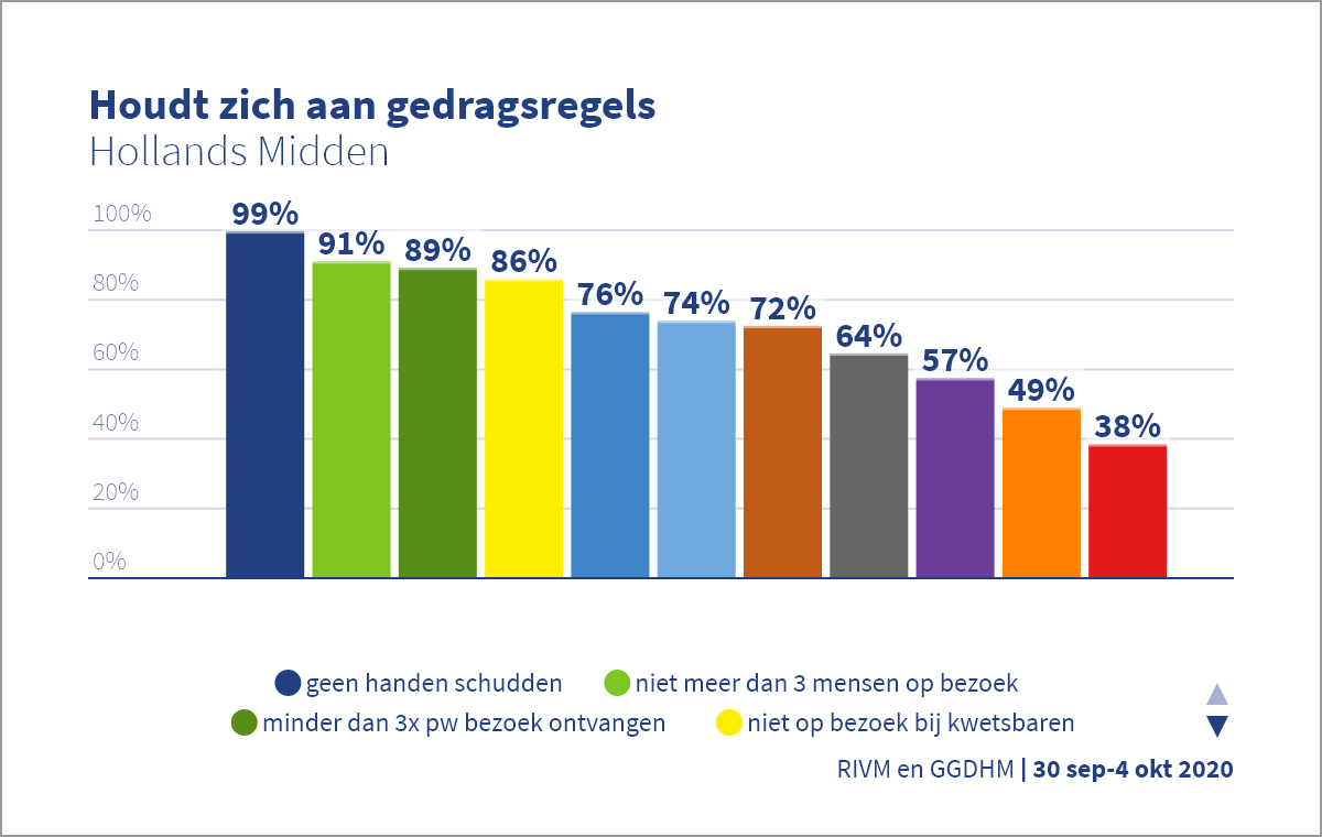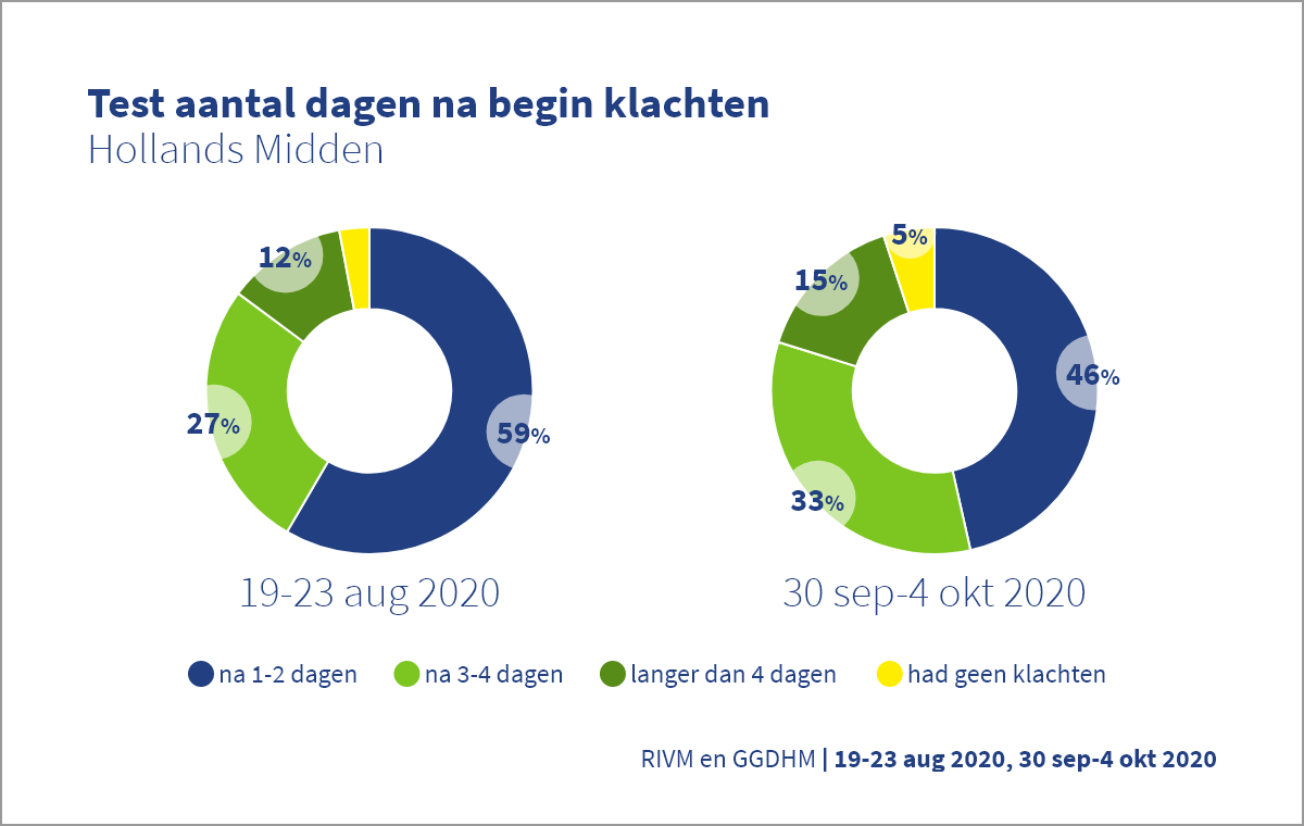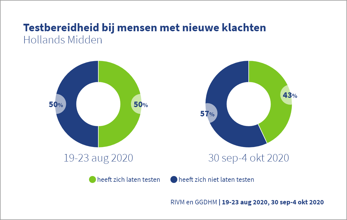 Uit het onderzoek, dat begin oktober is uitgevoerd, blijkt verder dat de bereidheid om je te laten testen bij klachten in praktijk lager ligt dan mensen vooraf over zichzelf zeggen. “Op de vraag of je je laat testen bij klachten zegt driekwart van de mensen dat te gaan doen. Maar als puntje bij paaltje komt en mensen klachten krijgen, haalt maar 43 procent daadwerkelijk een test”, aldus Hanning. Mogelijk komt dat door de lange wachttijd die voor een test gold begin oktober. Inmiddels is de testcapaciteit flink uitgebreid en zijn de wachttijden verkort.