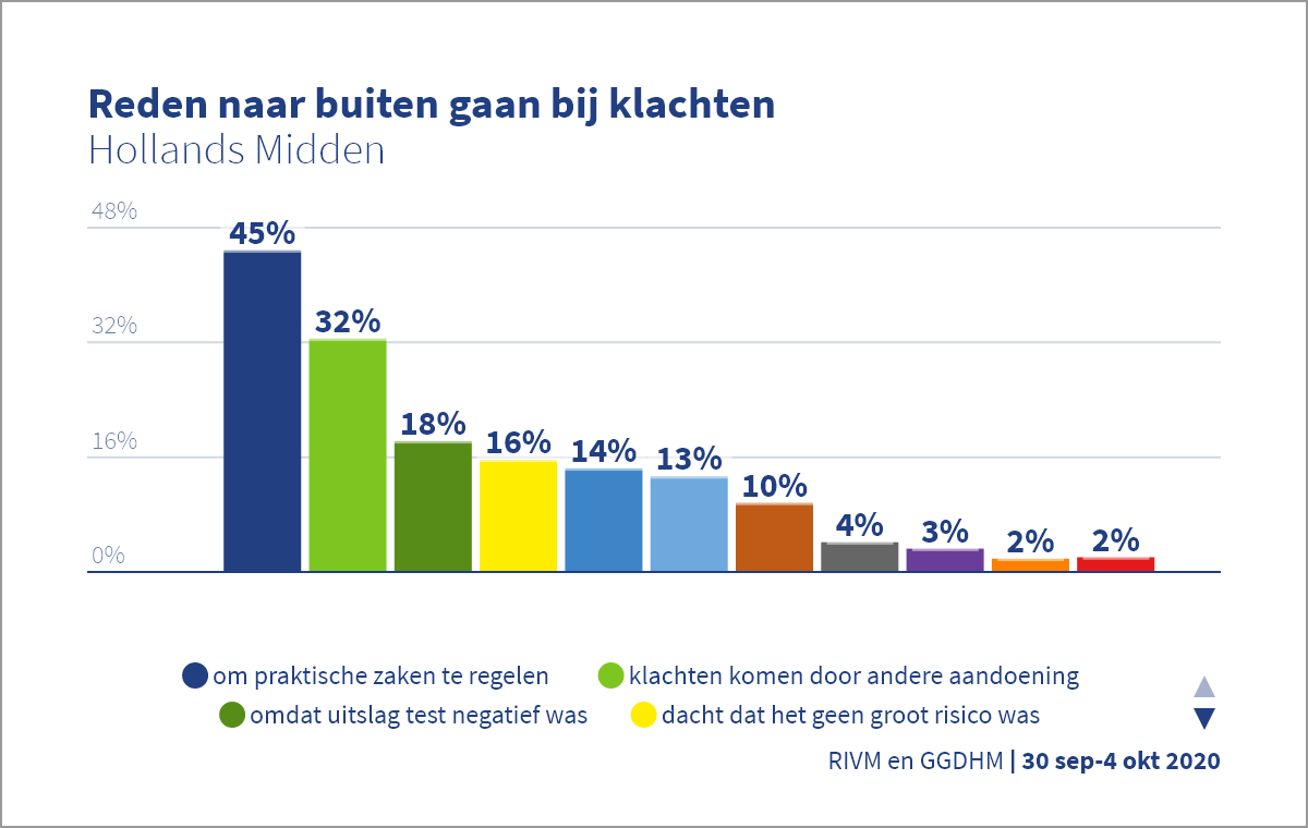 De belangrijkste reden voor het negeren van de landelijk opgelegde regels voor thuisblijven bij klachten, is dat mensen toch boodschappen willen doen of dat er werk is dat niet kan blijven liggen. Ook herkennen veel mensen de klachten bij zichzelf als normaal, waardoor de coronaregels voor hen niet zouden gelden. “Dat zijn mensen die bijvoorbeeld altijd een loopneus hebben en er daardoor vanuit gaan dat ze geen corona hebben”, zegt onderzoeker Christine Hanning van de GGD.