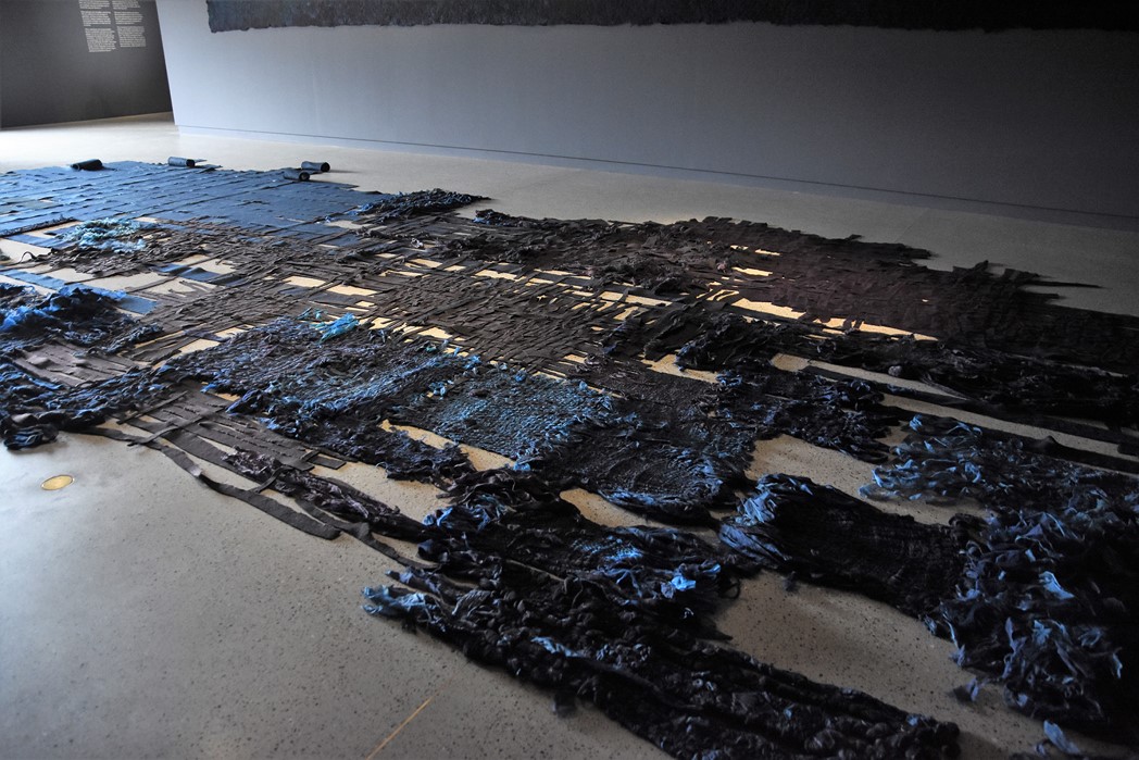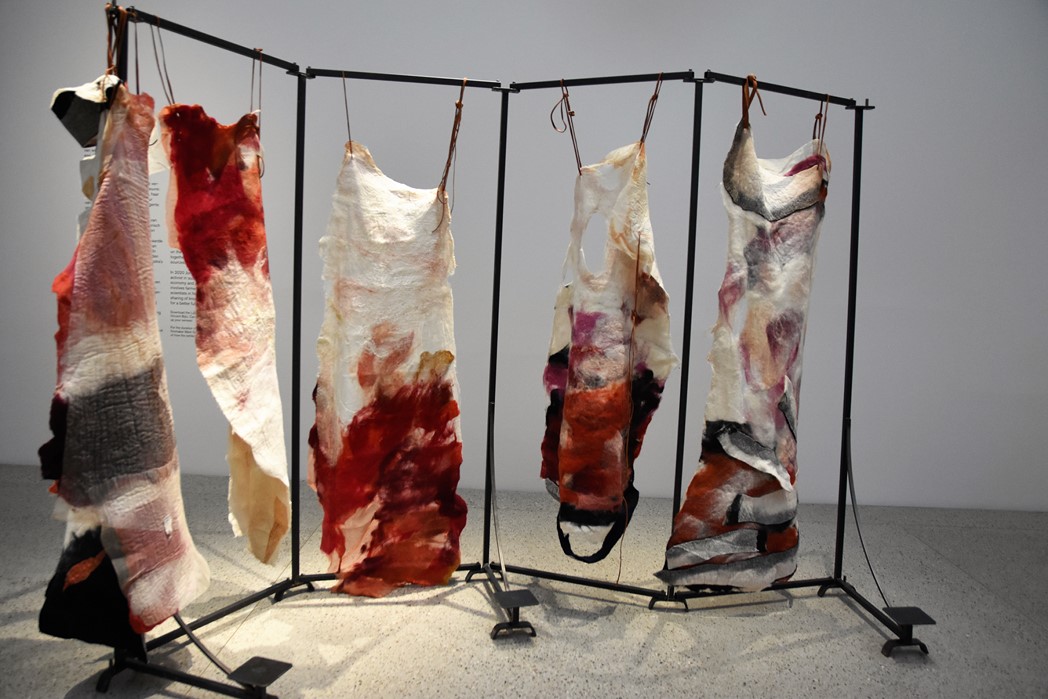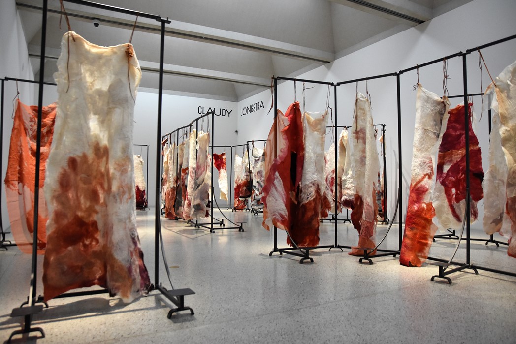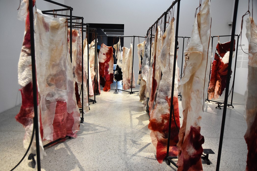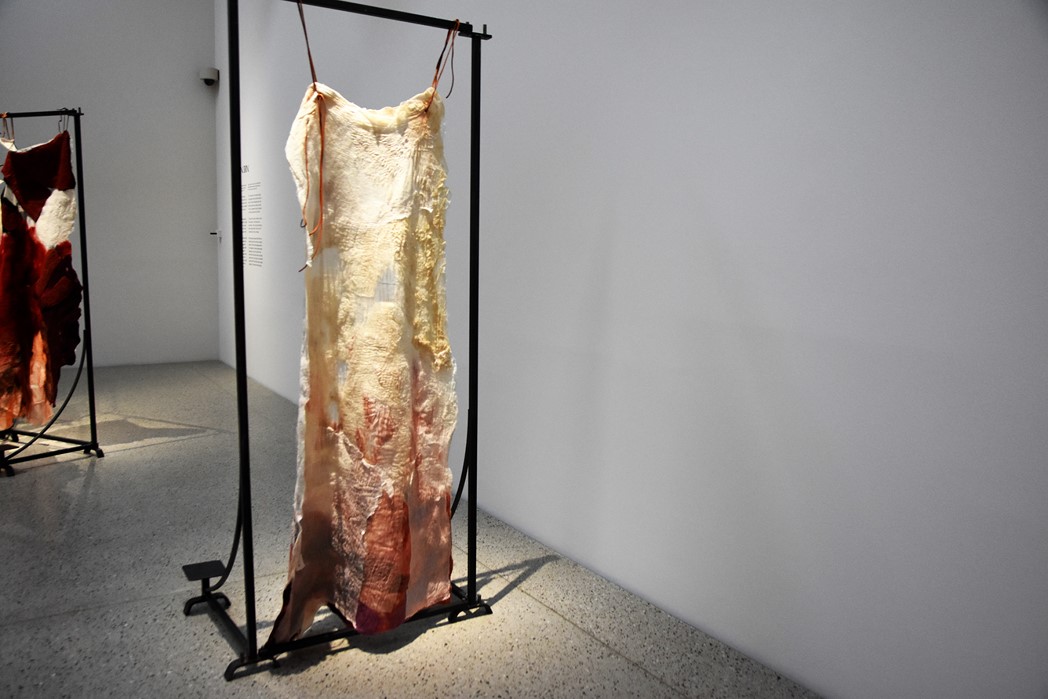 In de zaal op de begane grond kom je allereerst haar Woven Skins tegen. Wit met rood bevlekte lappen hangen in rijen. Het kan de associatie oproepen van een slachthuis waar ondefinieerbare huiden hangen. Maar als je er een ‘skin’ uitlicht, denk je wellicht eerder aan een trouwjurk.