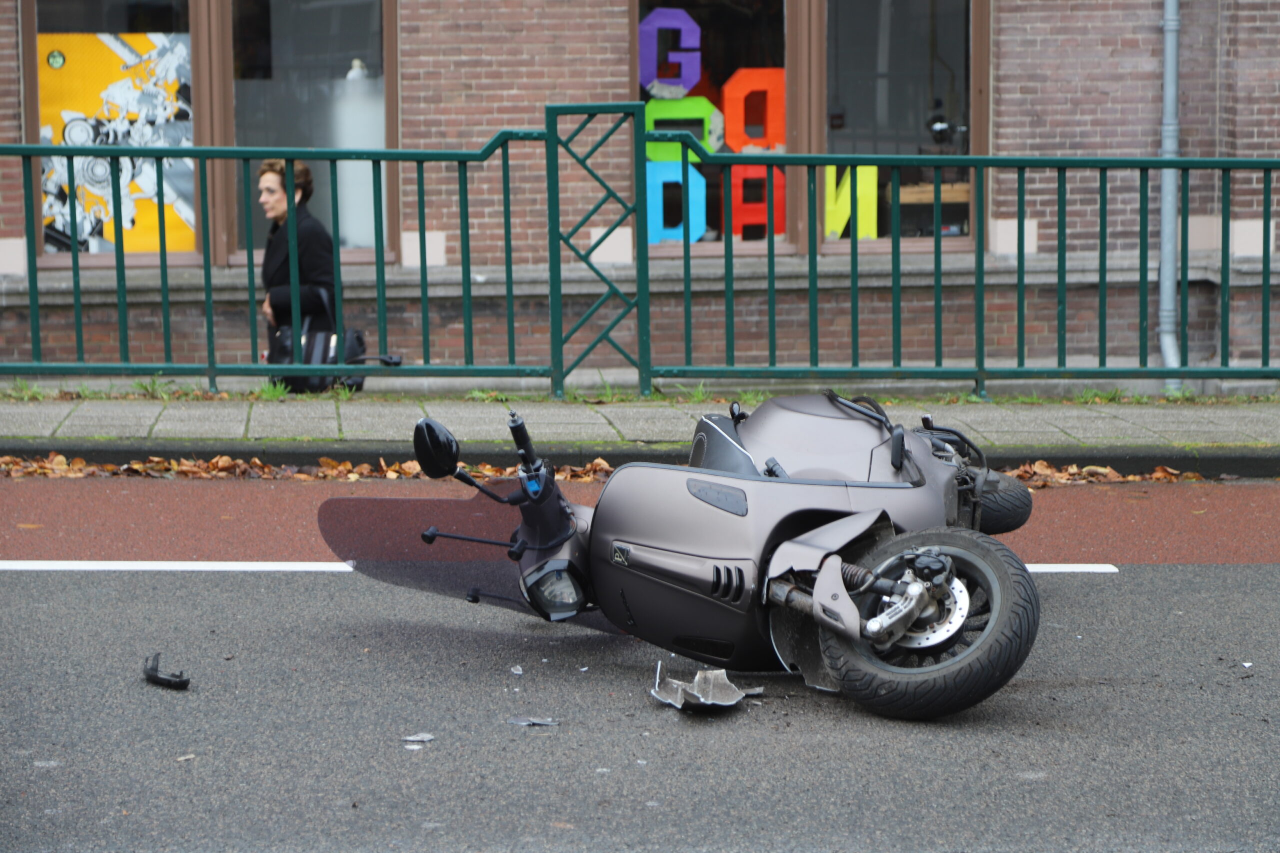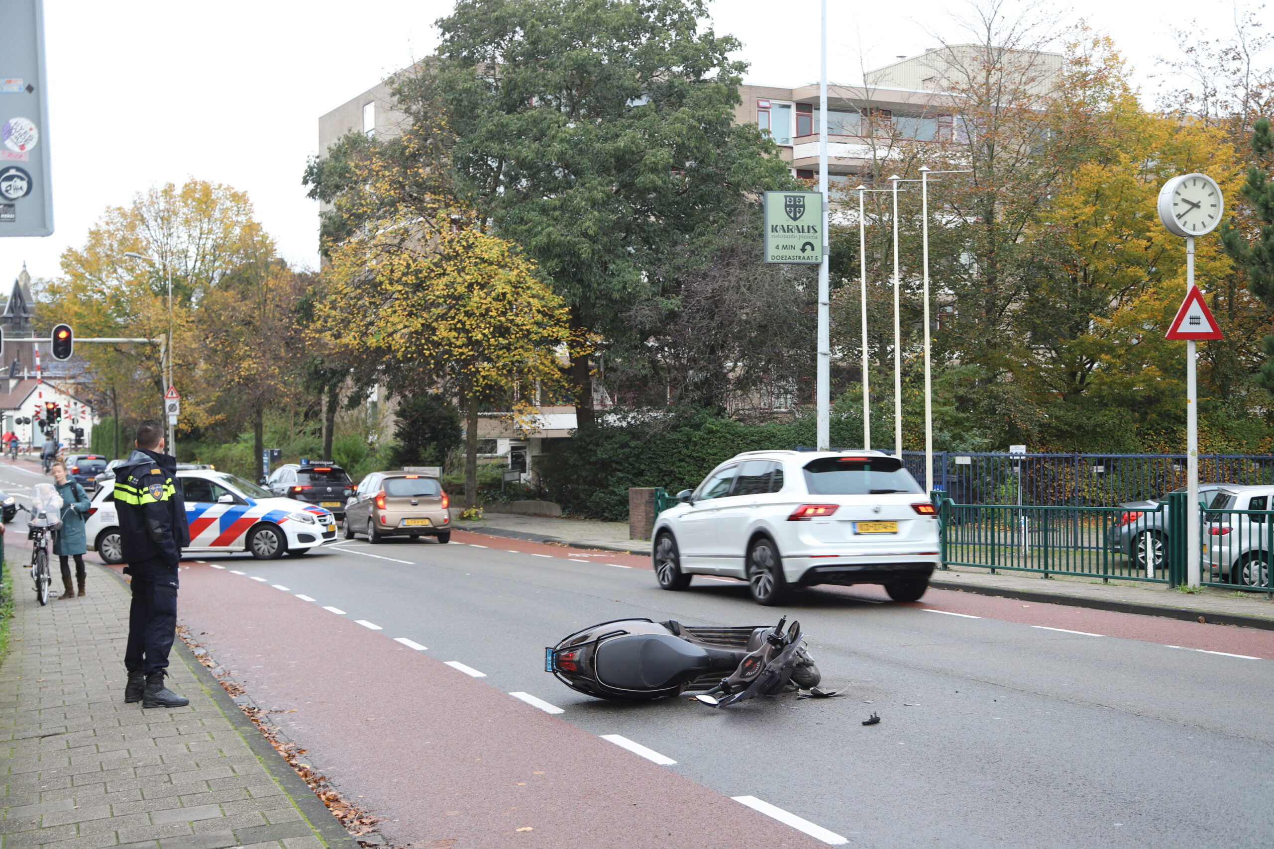 Mogelijk moest de auto remmen voor het zebrapad en is de scooterrijder daarna achterop de auto gekomen.