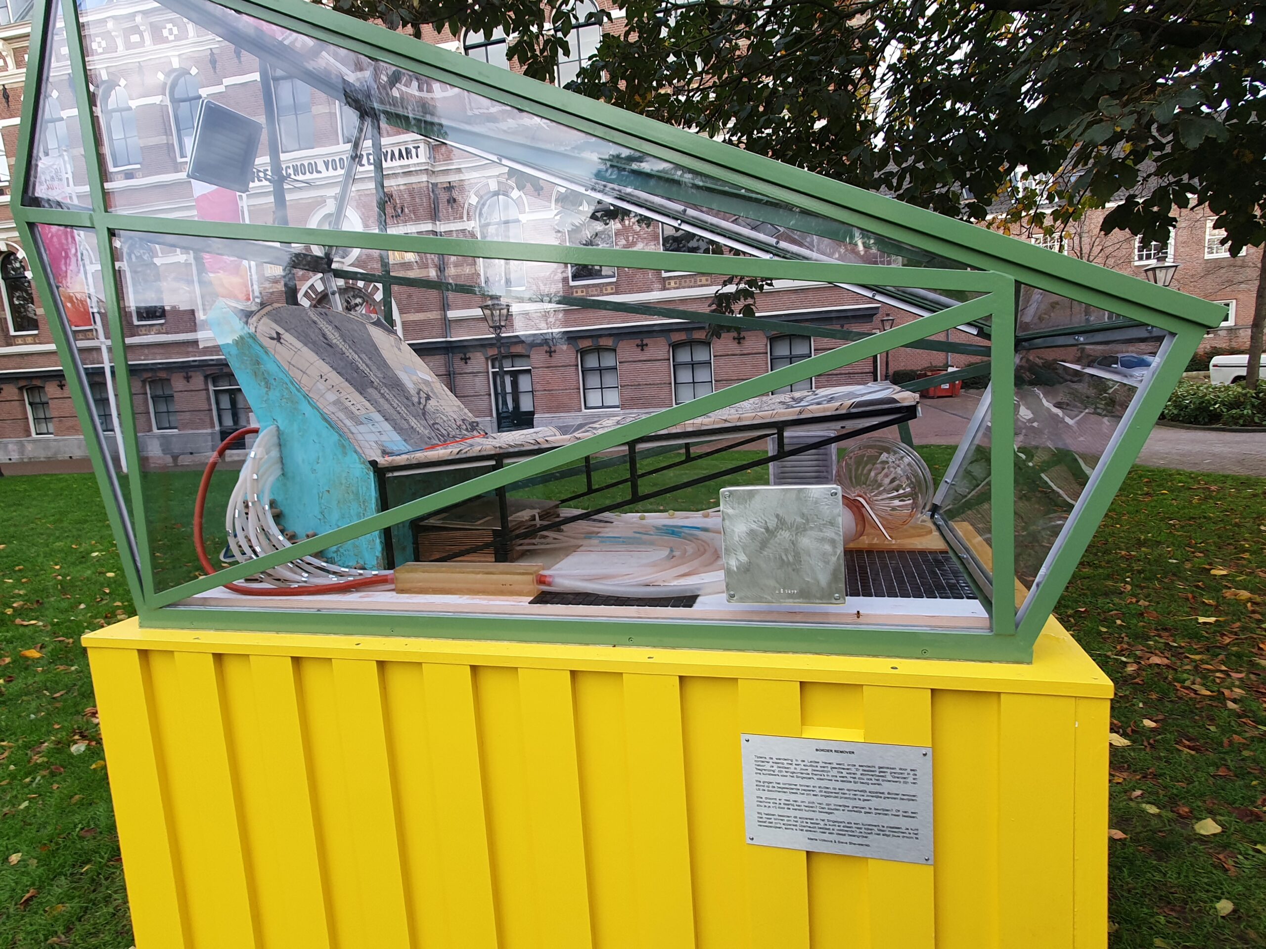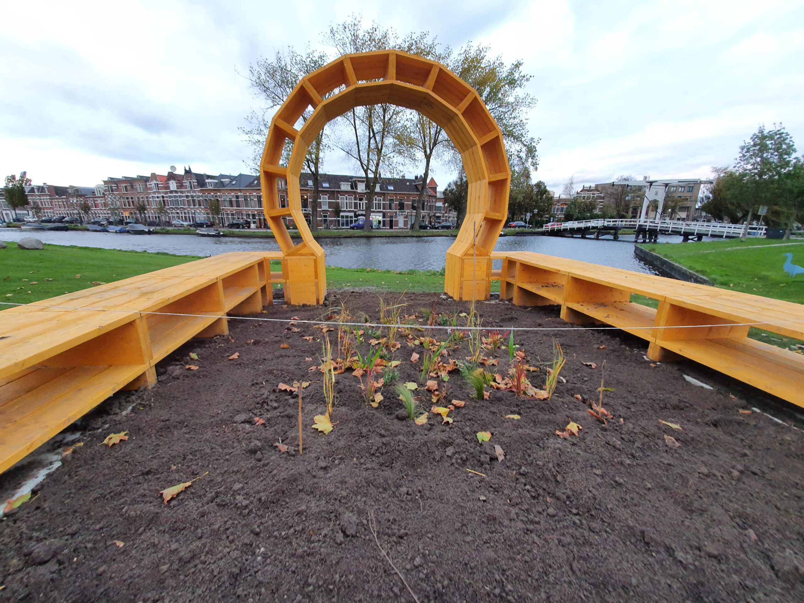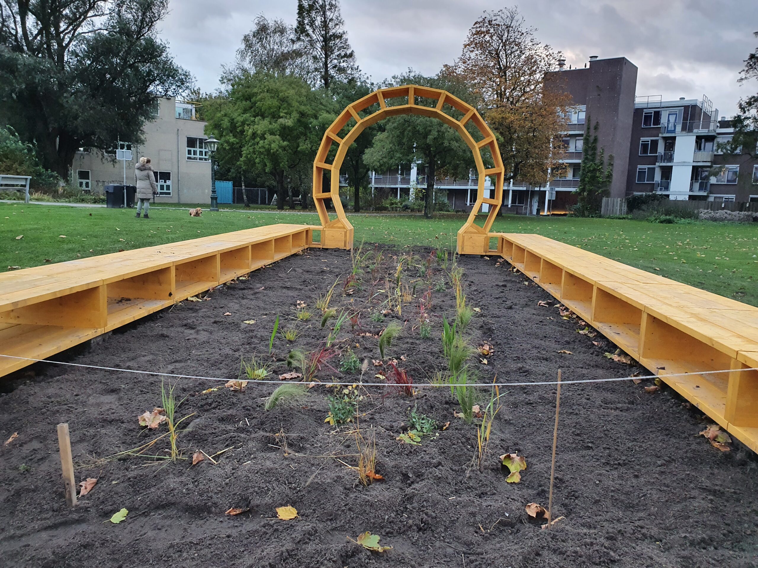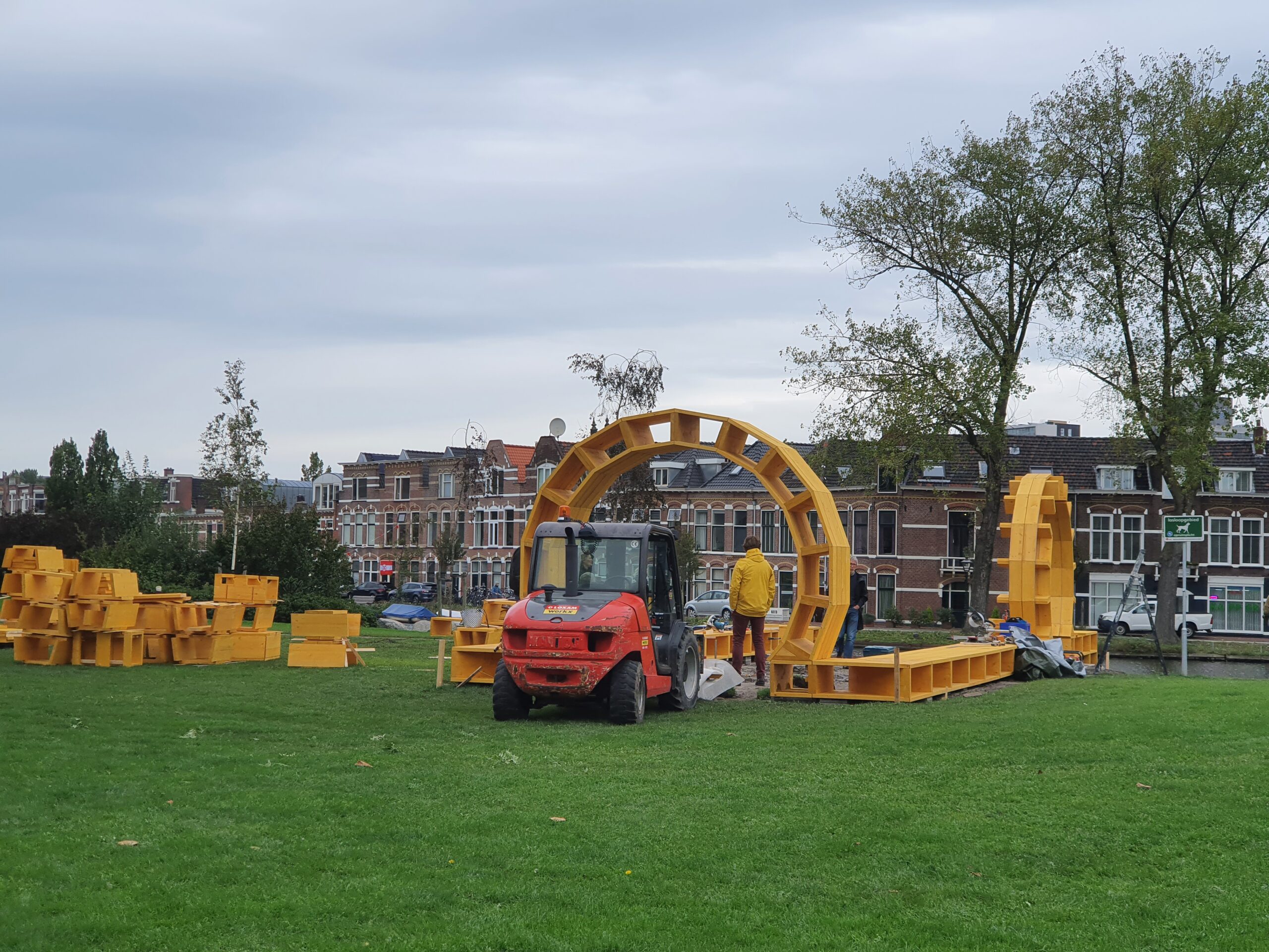 Het vijfde en laatste kunstwerk valt het meest op. Groot en geel heeft de ‘Tussentuin’ zich een plek verworven in het Huigpark. Gemaakt door kunstenaarscollectief Observatorium uit Rotterdam en in elkaar gezet door de vaste timmerman van het gezelschap. Binnen de gele cirkels groeit een tuin, Een tussentuin.