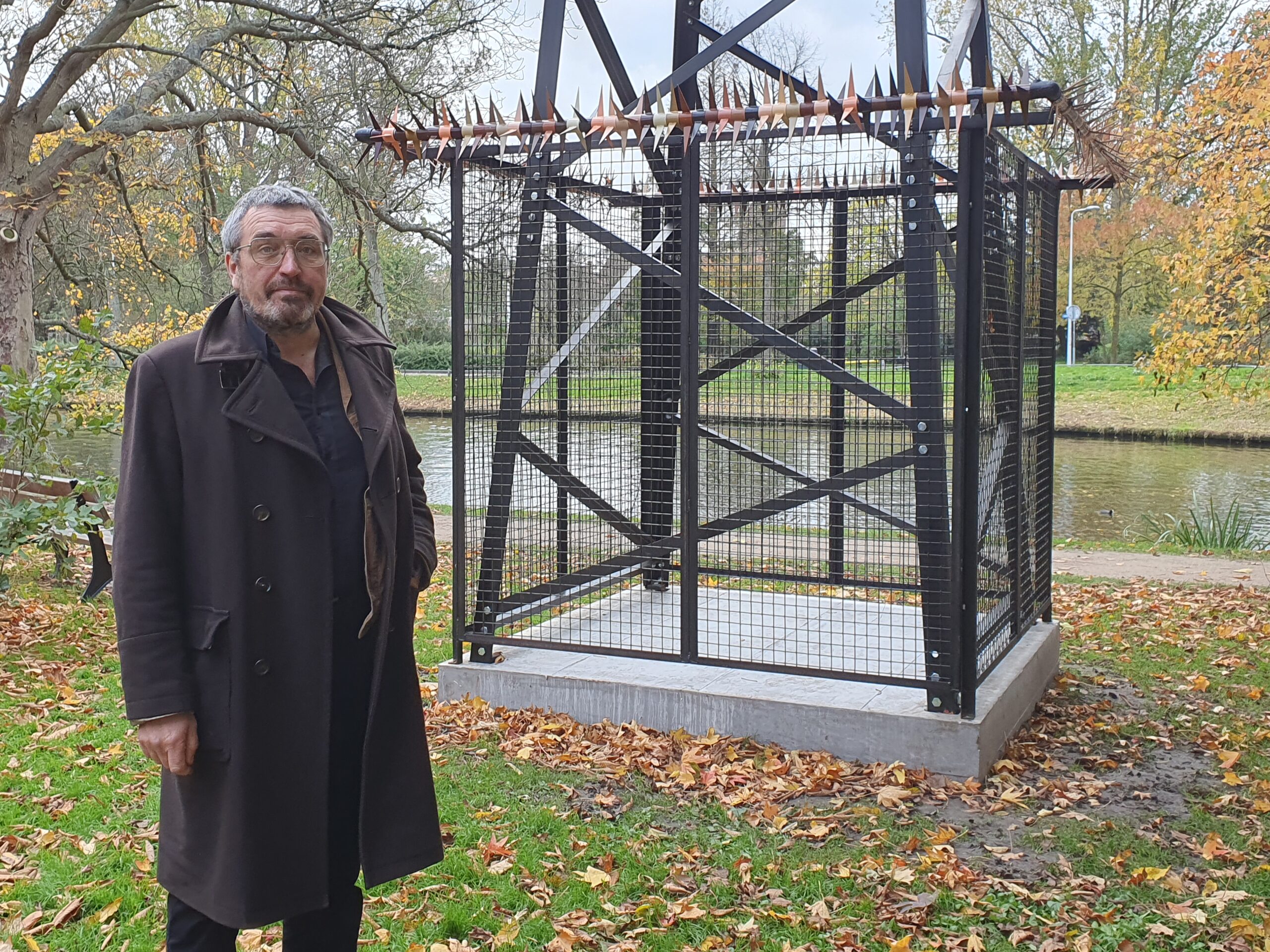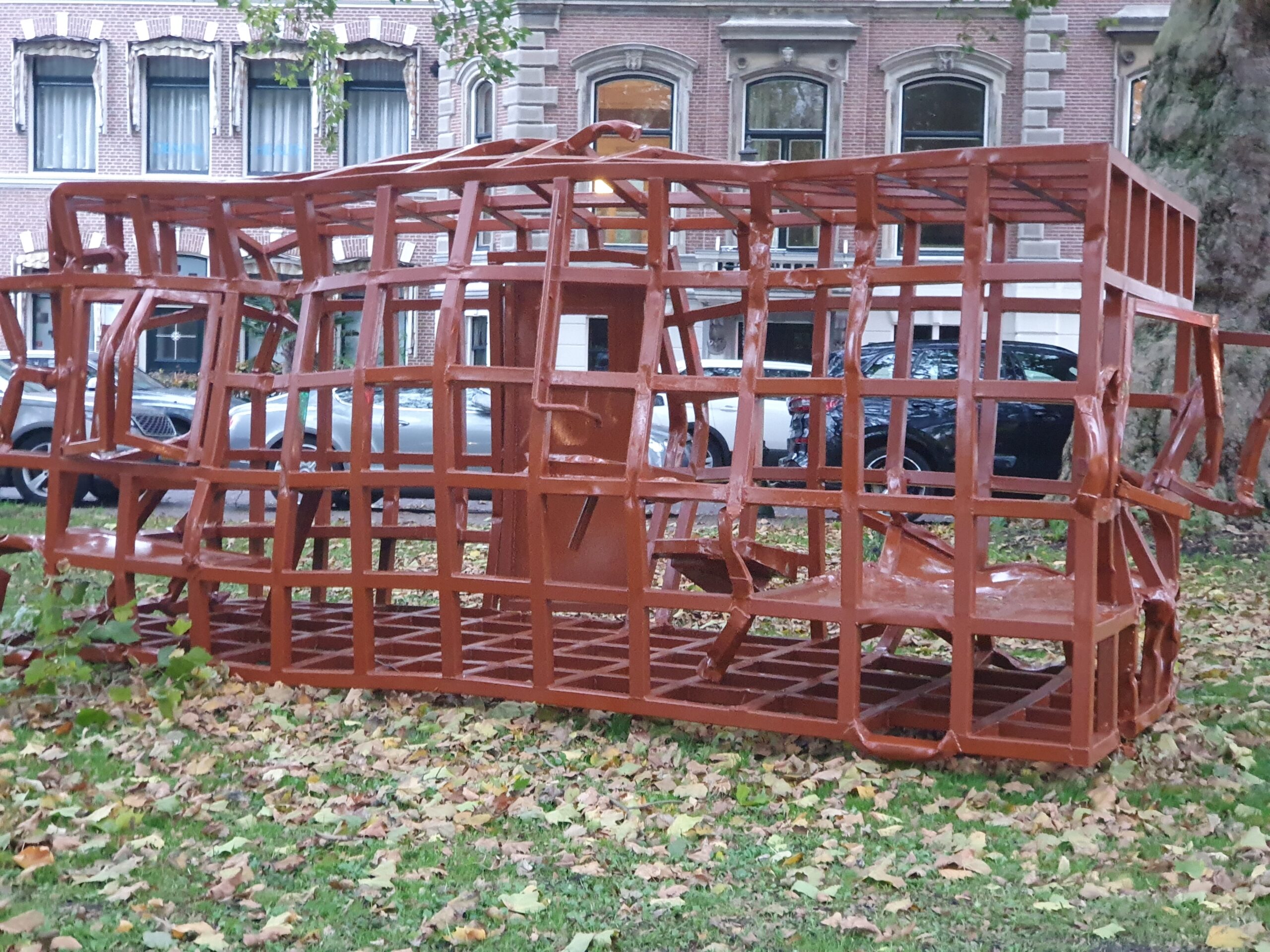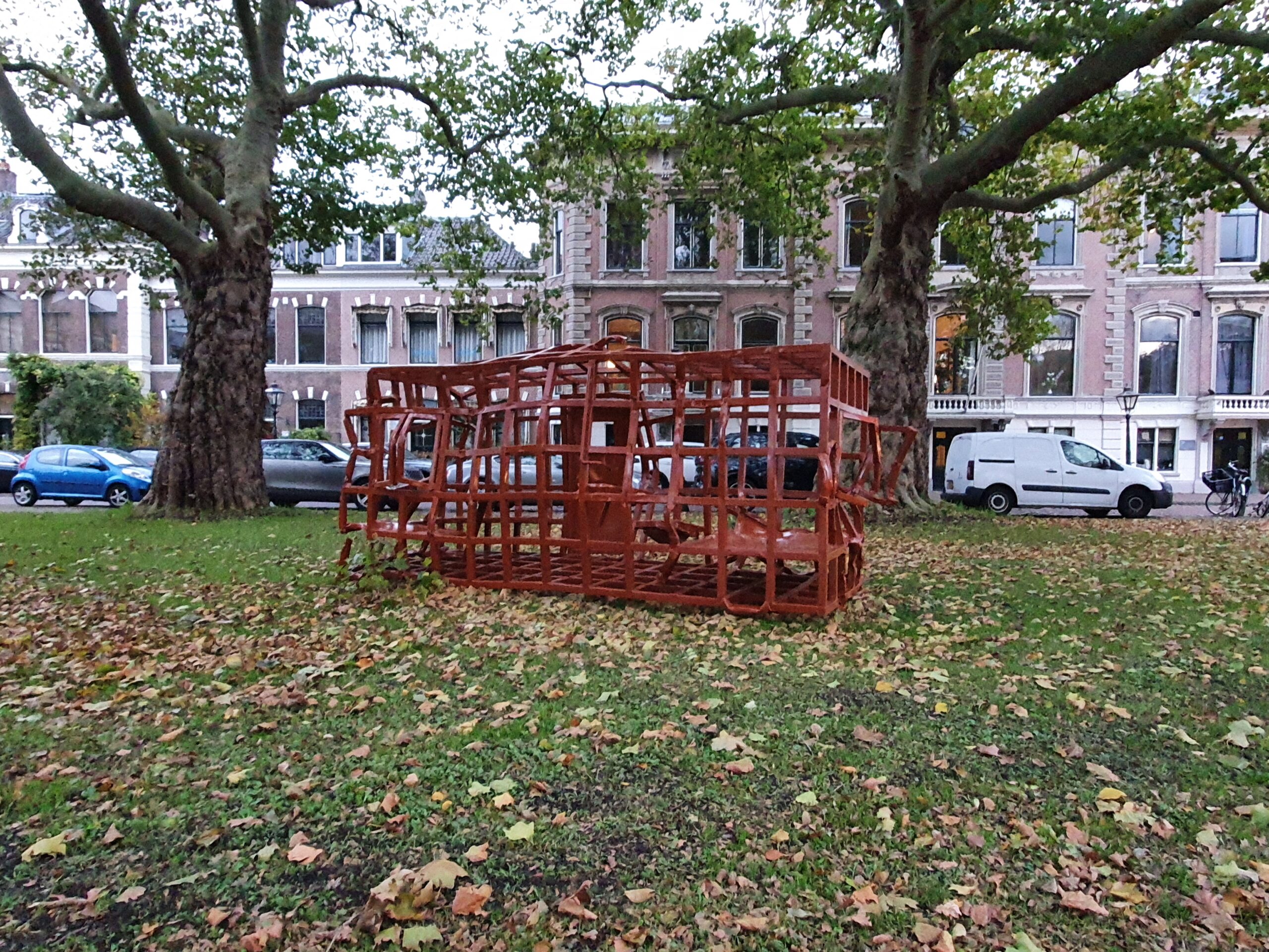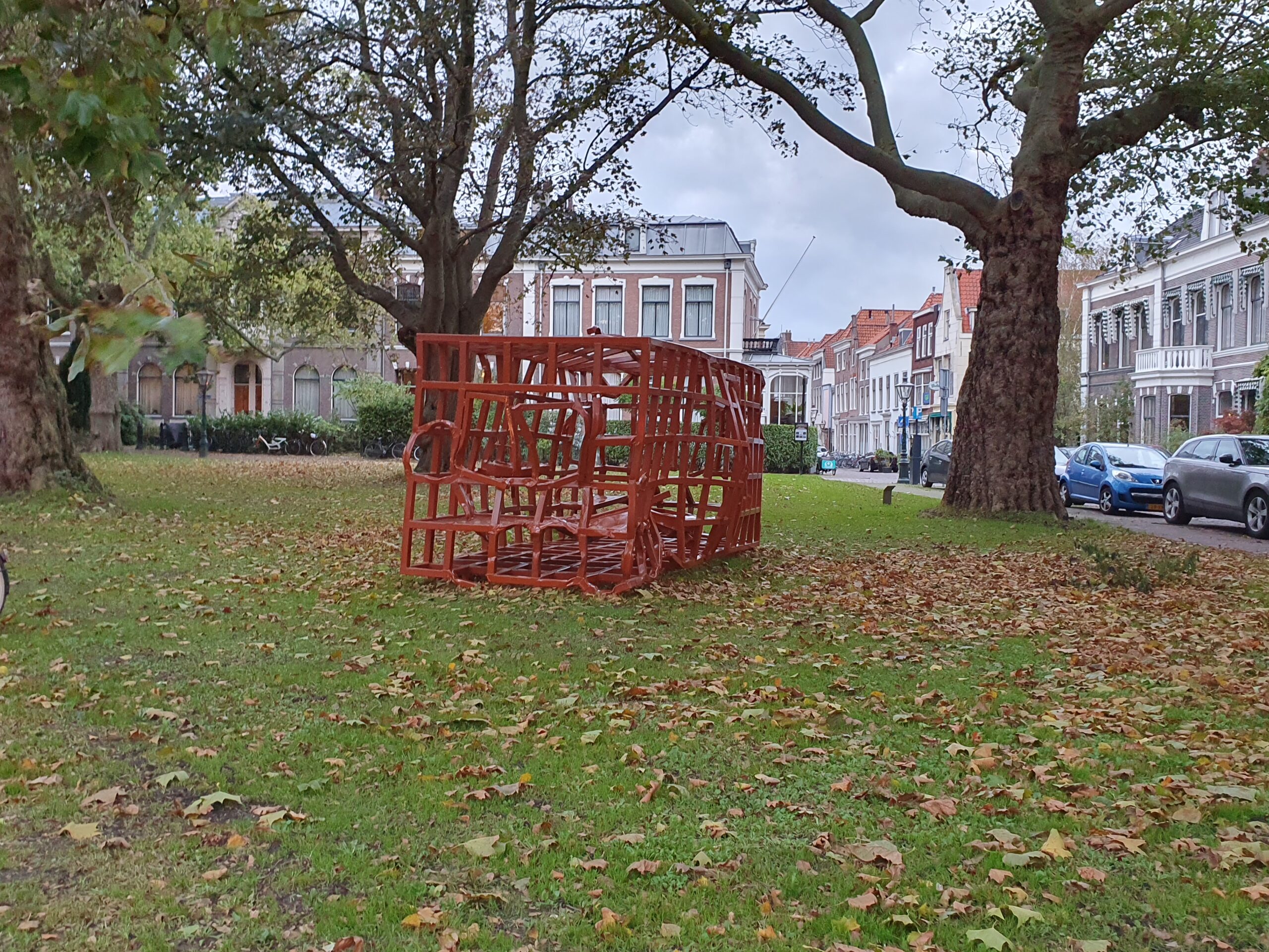 Op het grasveldje bij de Plantage ligt een kooi. Deze ‘Cage’ is gemaakt door Joep van Lieshout die begon met een strakke kooi met rechte lijnen. Daarna is het werk met groot geweld verwrongen tot het werk dat de komende jaren in Leiden te zien is. Het is een van de twee bestaande werken die deel uitmaken van de tentoonstelling.