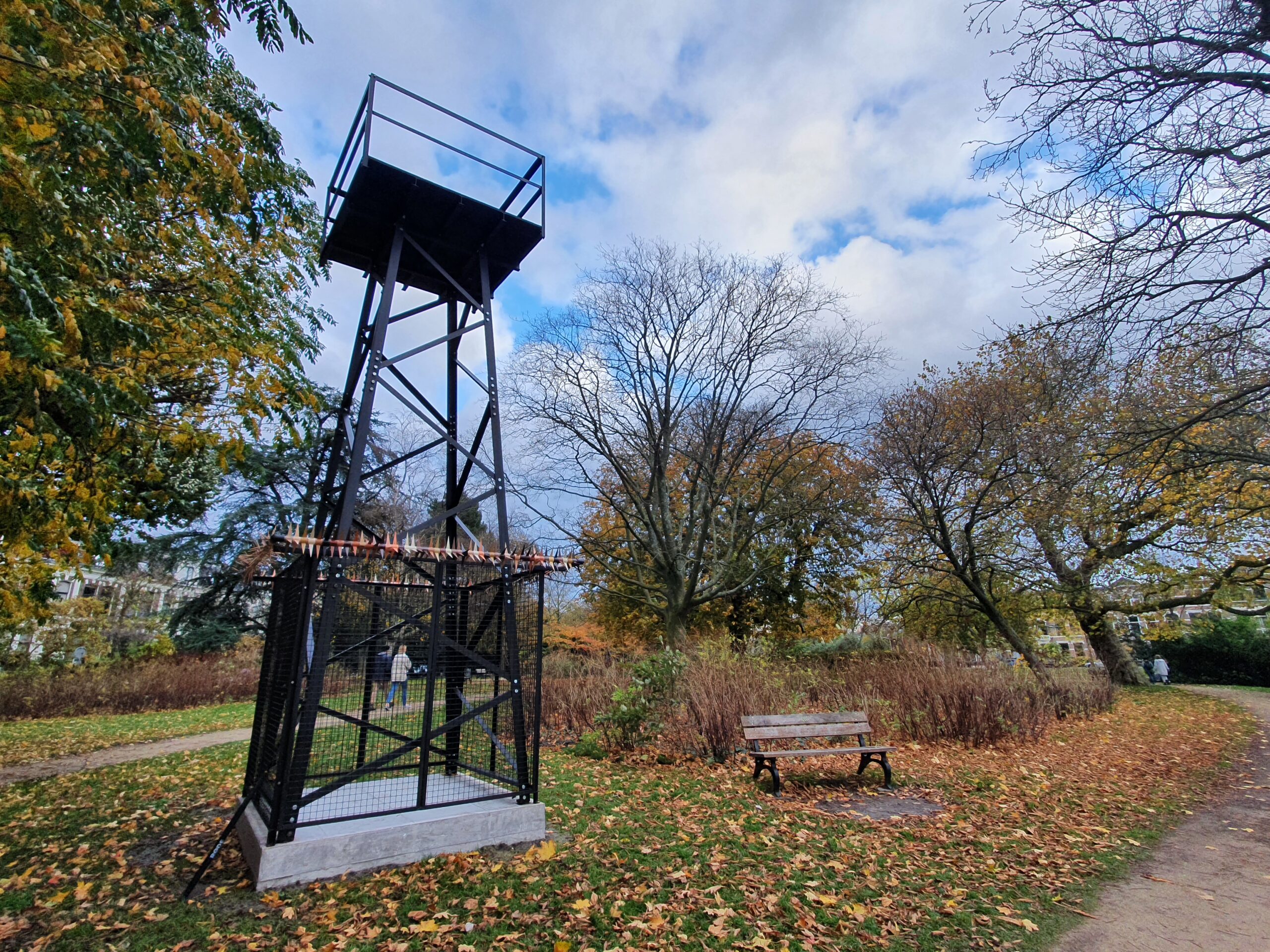 In het plantsoen staat vlakbij de fontein ‘Human Boundaries’. Een metershoge wachttoren. Dergelijke torens, maar dan dertig meter hoog, stonden vroeger in Oost-Berlijn langs de Berlijnse Muur. Kunstenaar Harold van Bree groeide op in Voorschoten en speelde in zijn jeugd vaak op de plek waar nu zijn kunstwerk staat. Erin klimmen kan niet. De toren staat binnen een omheining met aan de rand driehoekige metalen punten. Deze hebben de kleuren van menselijke huid.