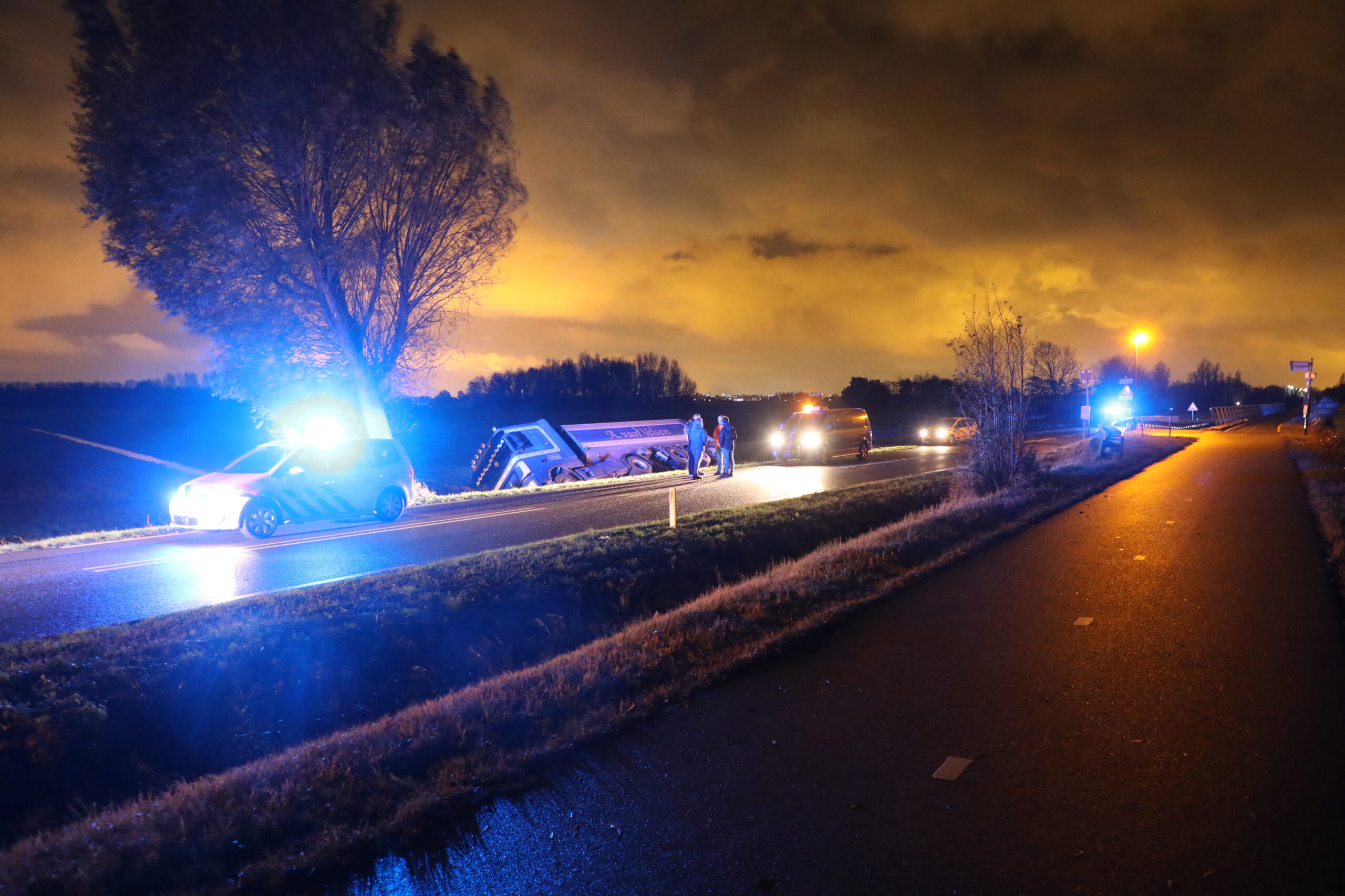De vrachtwagen raakte rond 5.15 uur van de weg en kwam deels in de naastgelegen sloot terecht. Bij het ongeval raakte niemand gewond. Om het zware voertuig weer op de weg te krijgen, moest de weg wel in beide richtingen worden afgesloten.