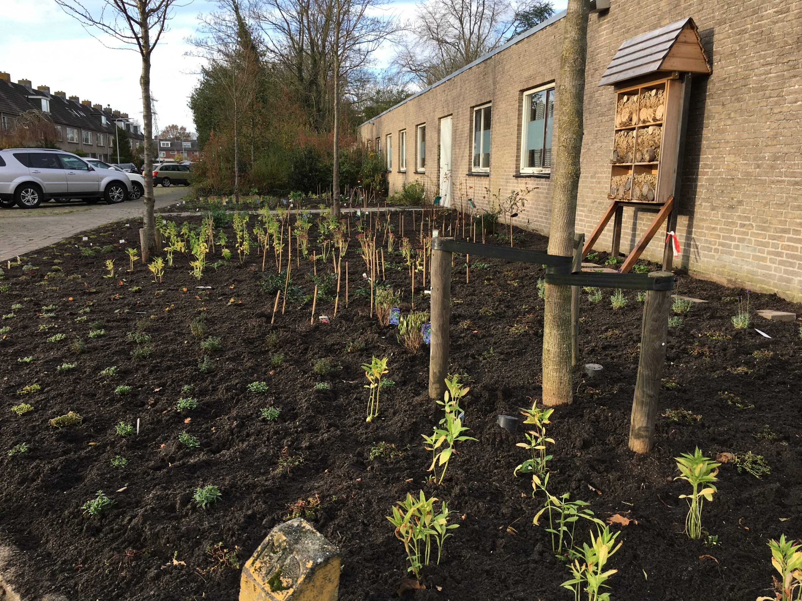 Op een ‘saai’ grasveldje bij het GOD Centre in Voorschoten staat sinds zaterdag een bed en breakfast voor bijen. Voor hommels, honingbijen en zweefvliegen is er nestgelegenheid en voedsel. Vrijwilligers van de groep ‘Voorschoten voor de Bijen’ plantten dit weekend een grote hoeveelheid bloemen.