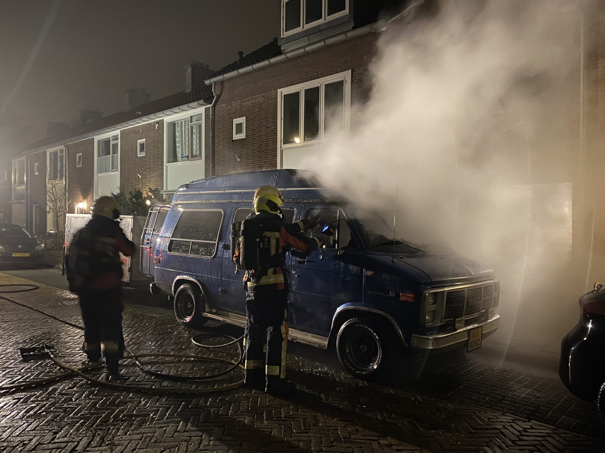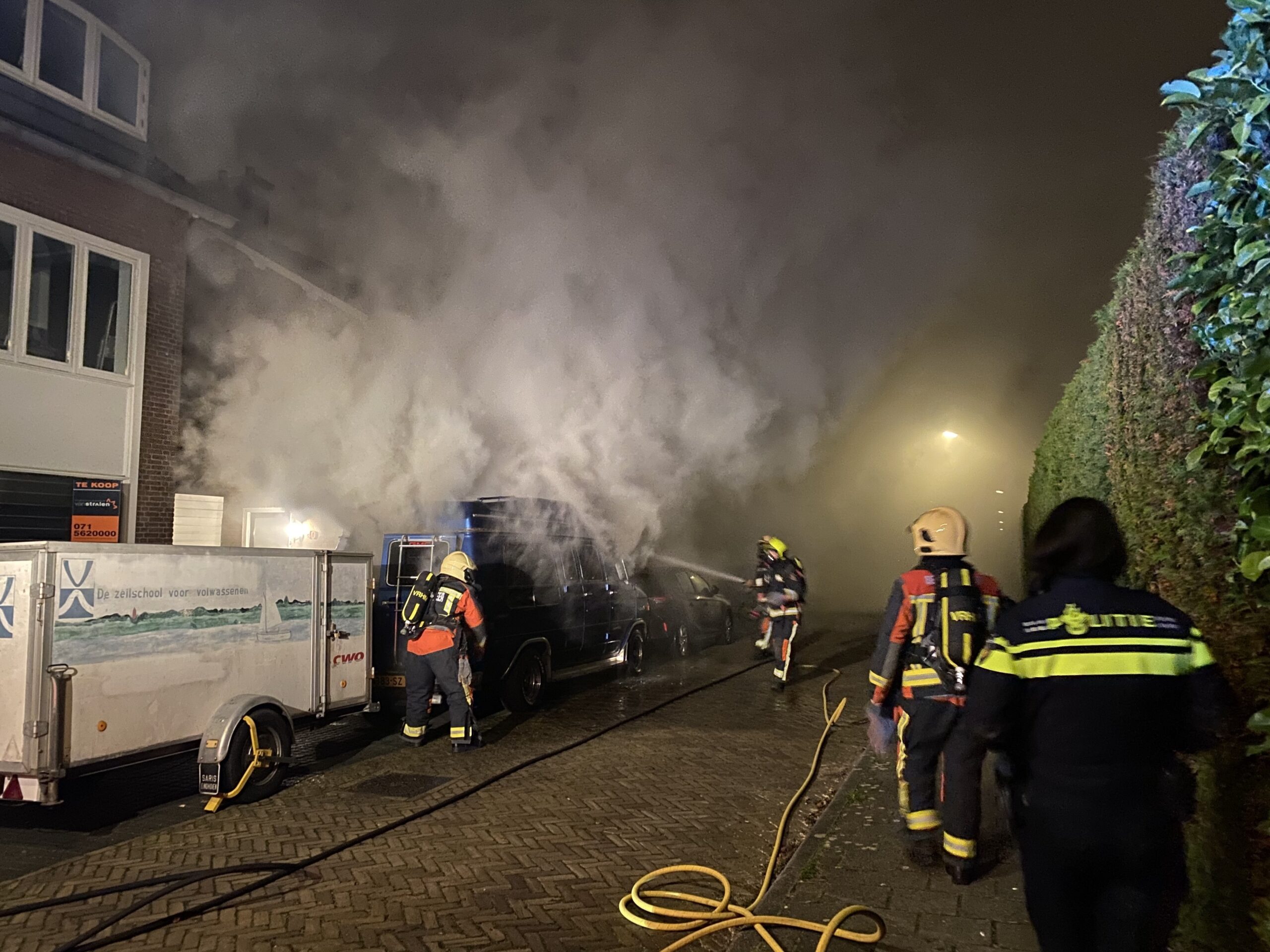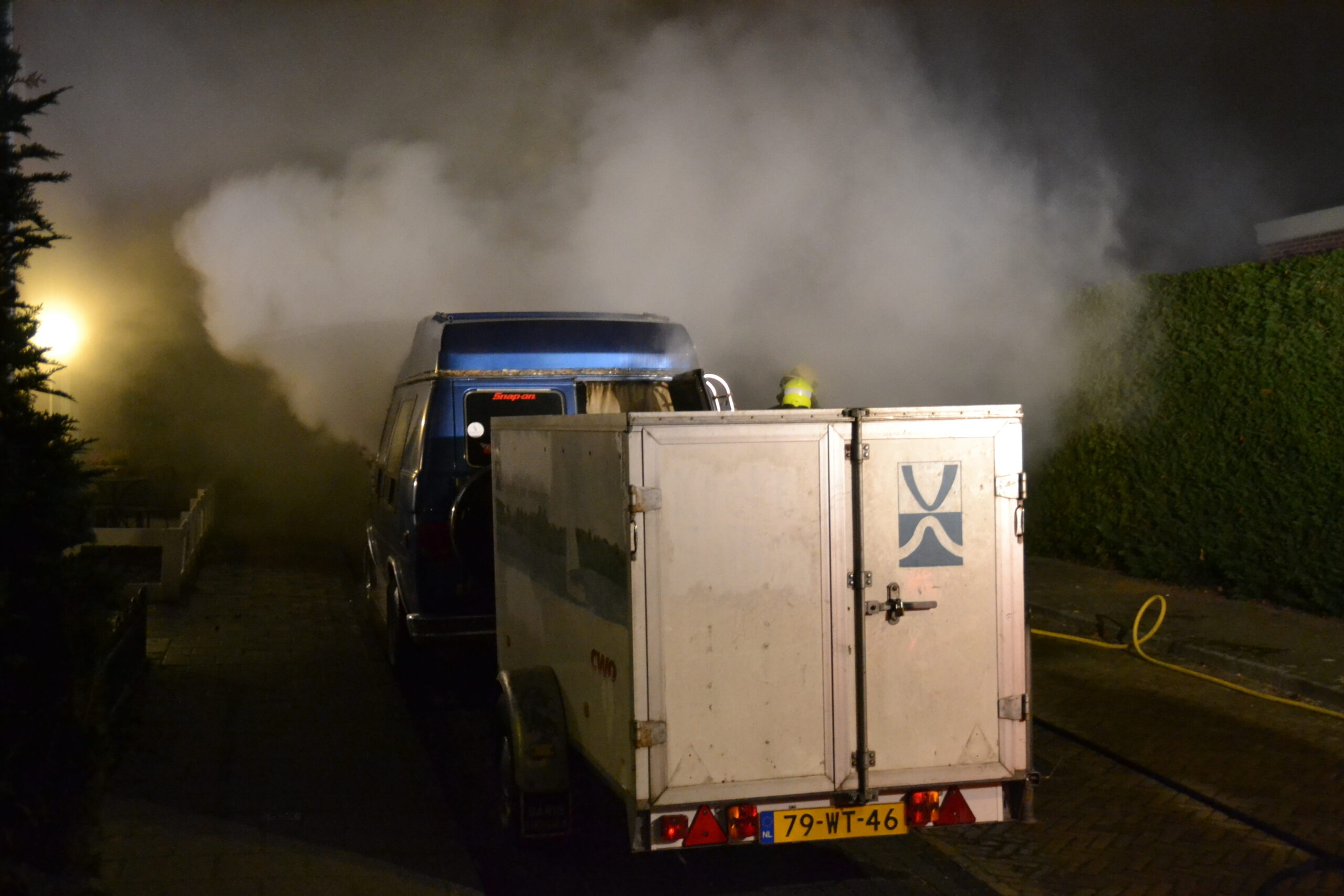 Een Amerikaanse bestelbus is zaterdagavond rond 21.45 uur door nog onbekende oorzaak uitgebrand. De bus met aanhanger stonden geparkeerd in de Voorschotense Vredenhoeffstraat.