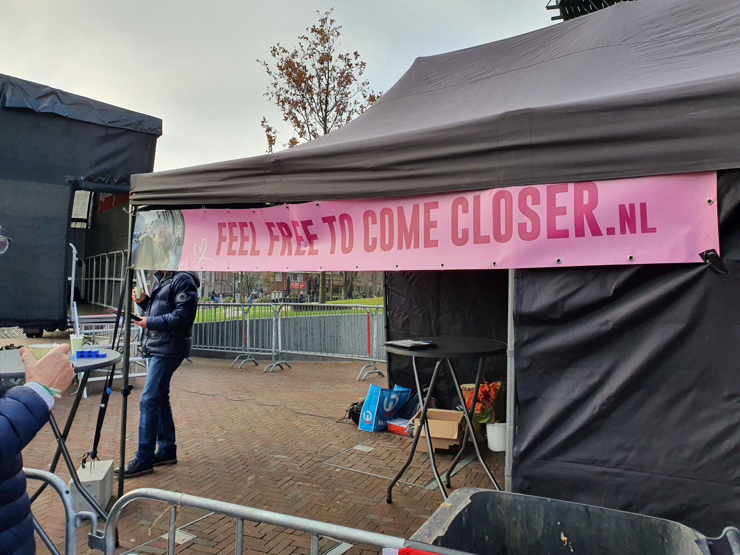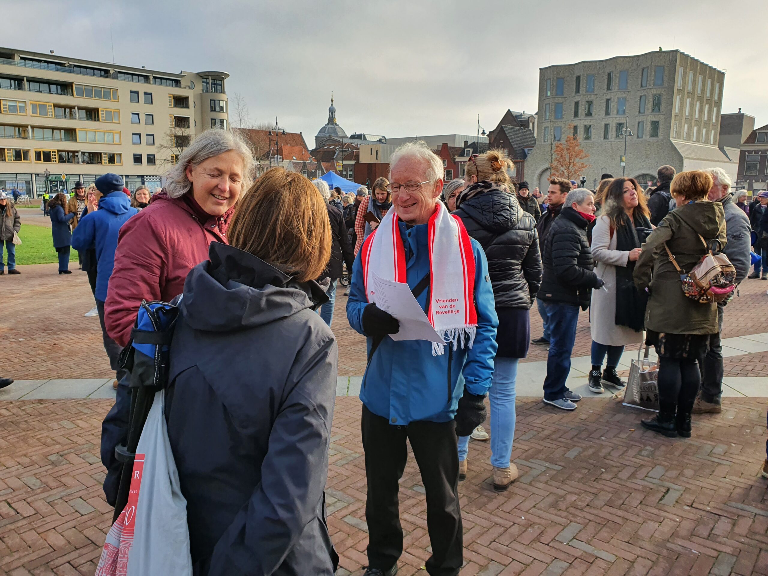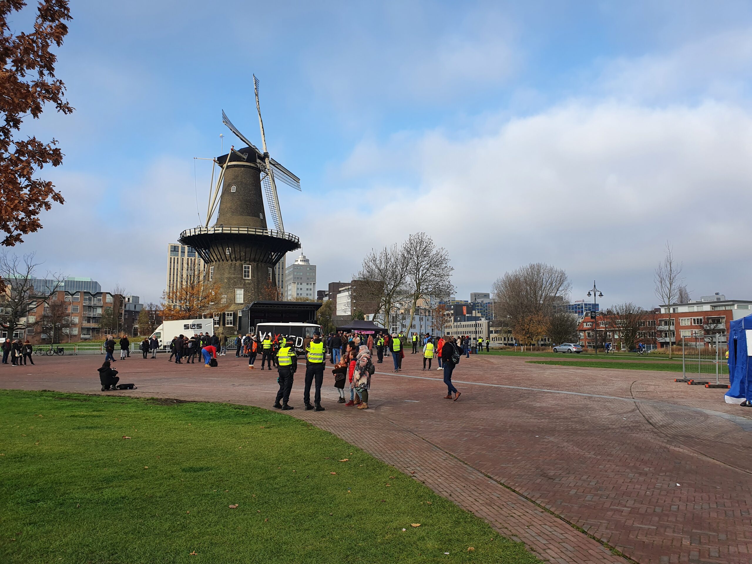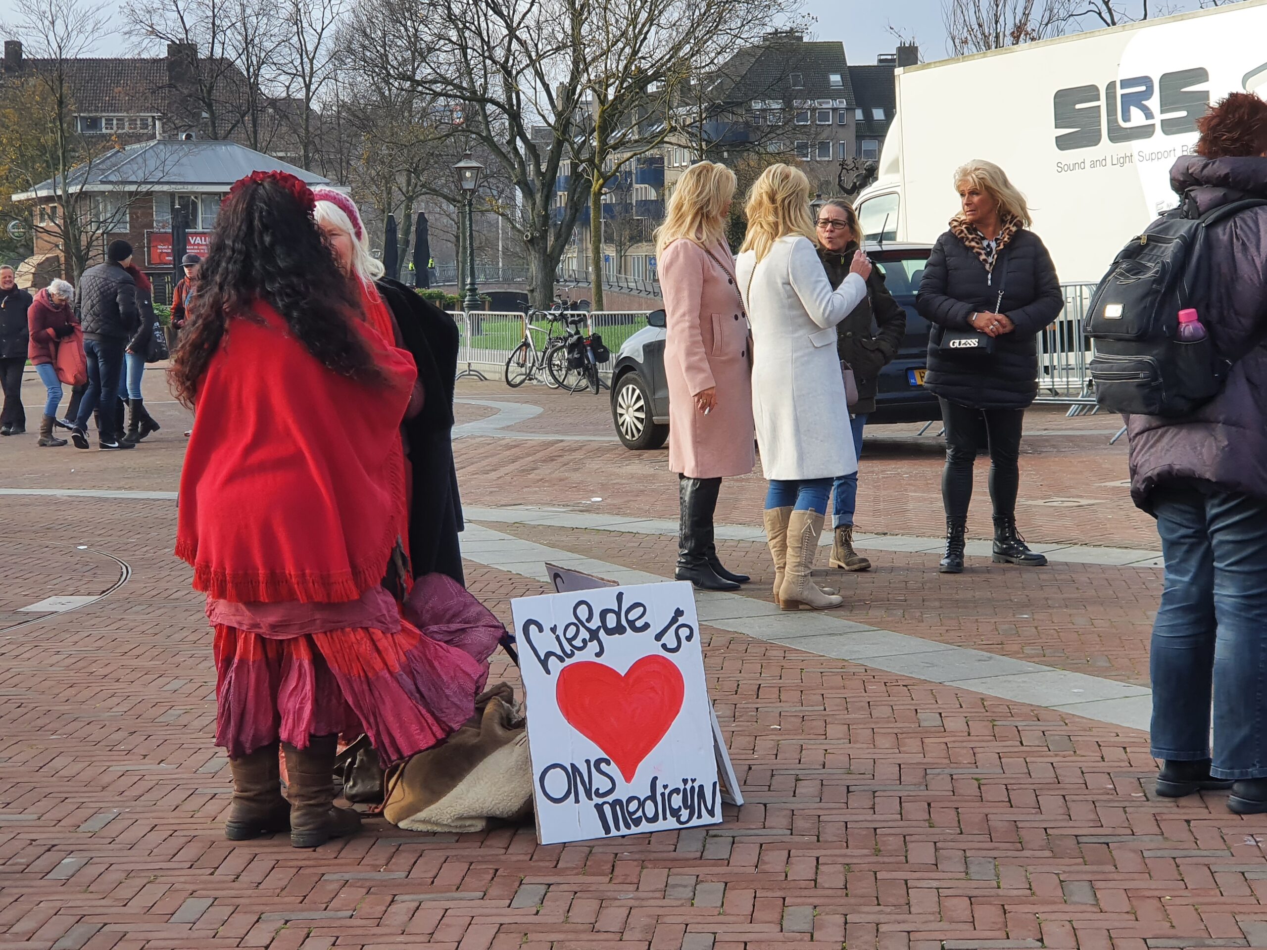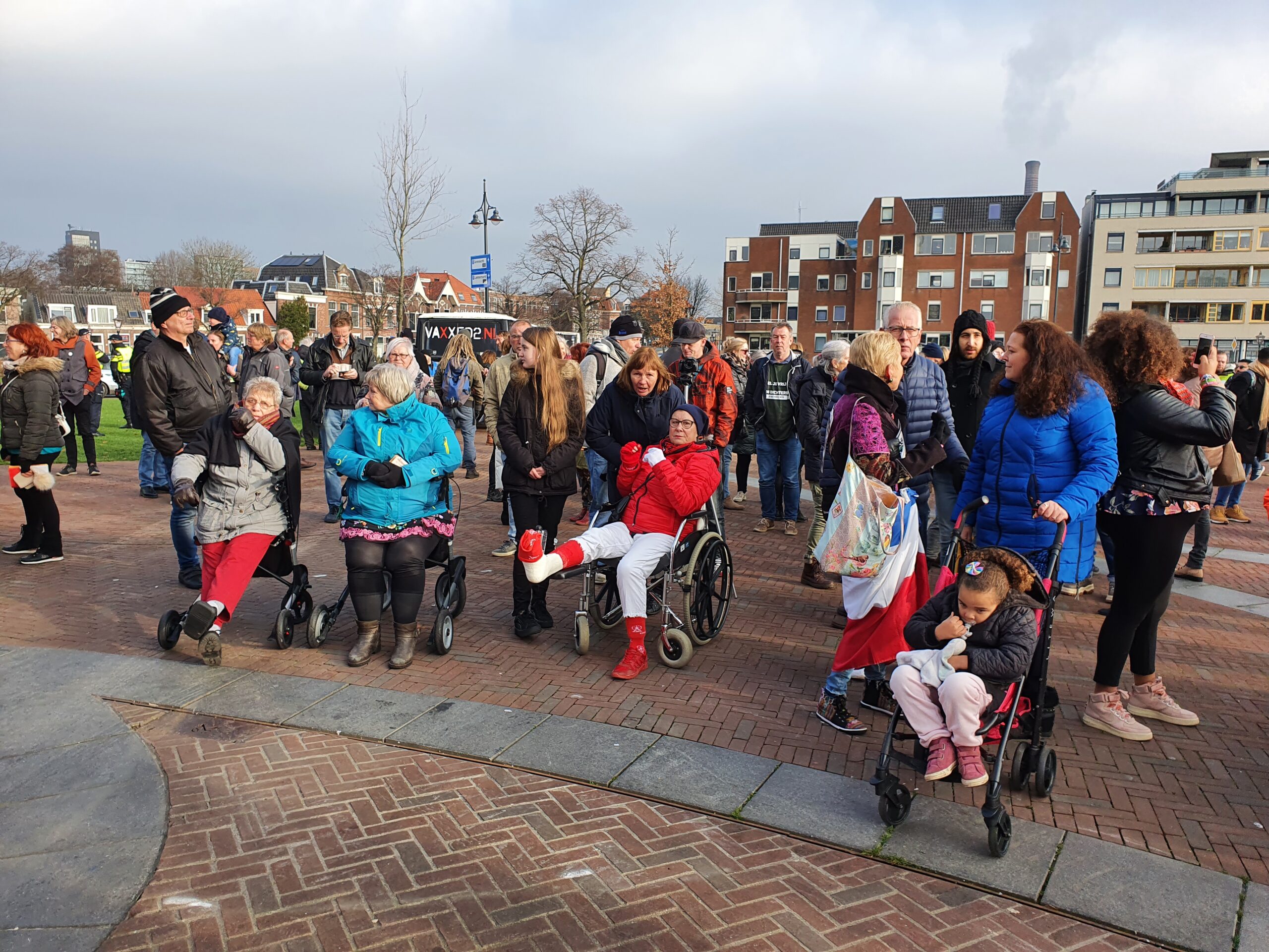 “Ik krijg het niet uit mijn mond om jullie te vragen anderhalve meter afstand van elkaar te houden”, roept Ruesink in de microfoon. “Maar we kunnen wel met z’n allen het plein helemaal vullen.” Schoorvoetend geeft een deel van de aanwezigen gehoor aan dat verzoek. Het dient twee doelen. Ten eerste voorkomen dat de manifestatie alsnog wordt verboden. “We hebben te horen gekregen dat de politie na twee waarschuwingen zal optreden.” Ook richting de ‘mainstream media’ is een gevuld plein volgens de organisatie van belang. “De NOS probeert ons keer op keer weg te zetten als een handjevol wappies.”