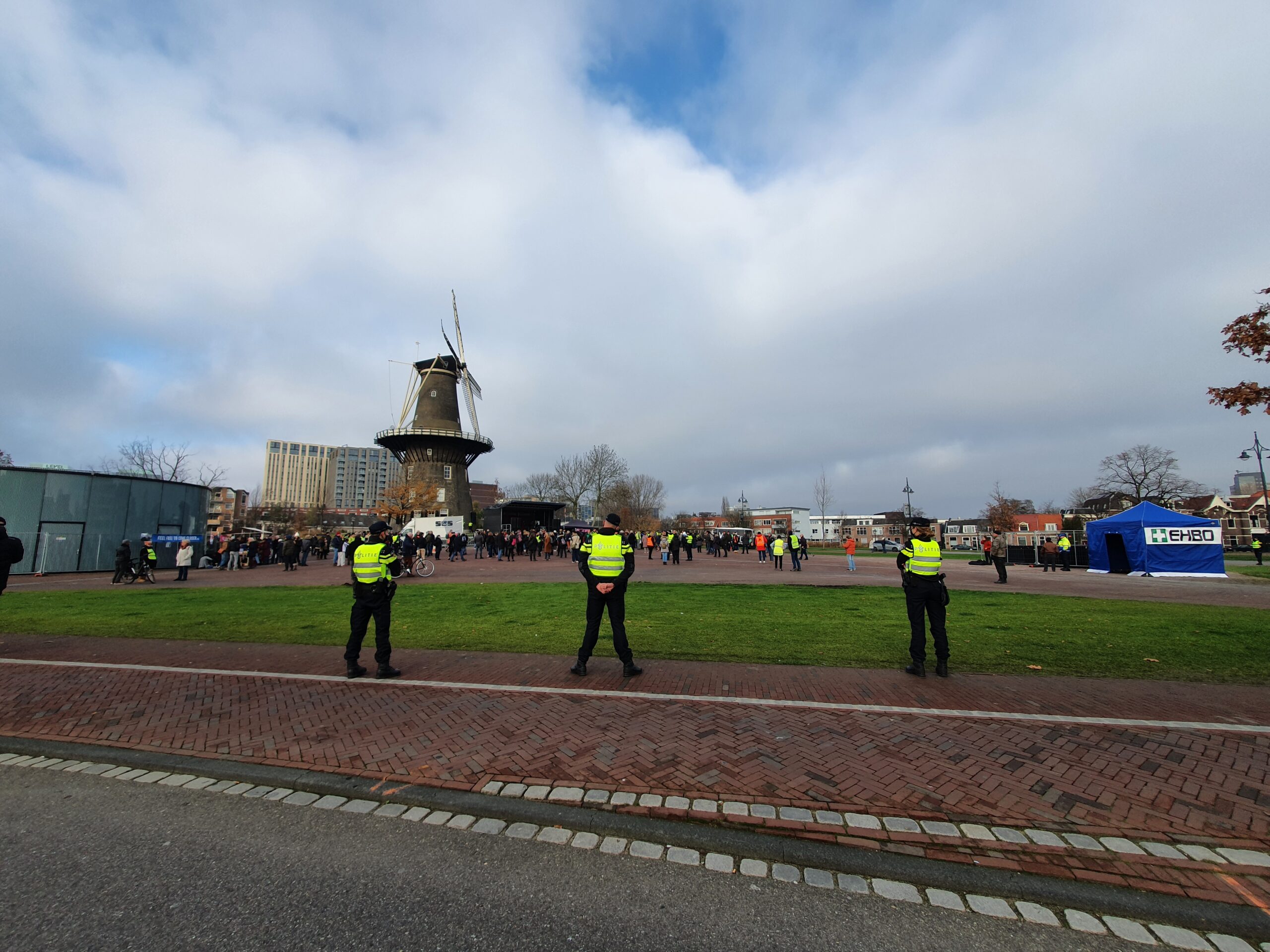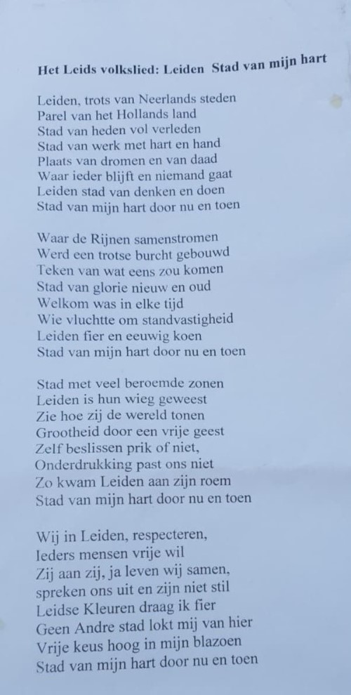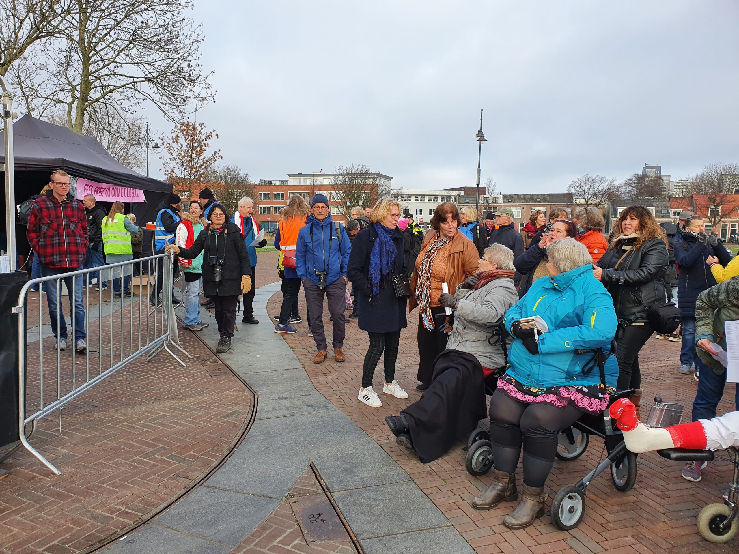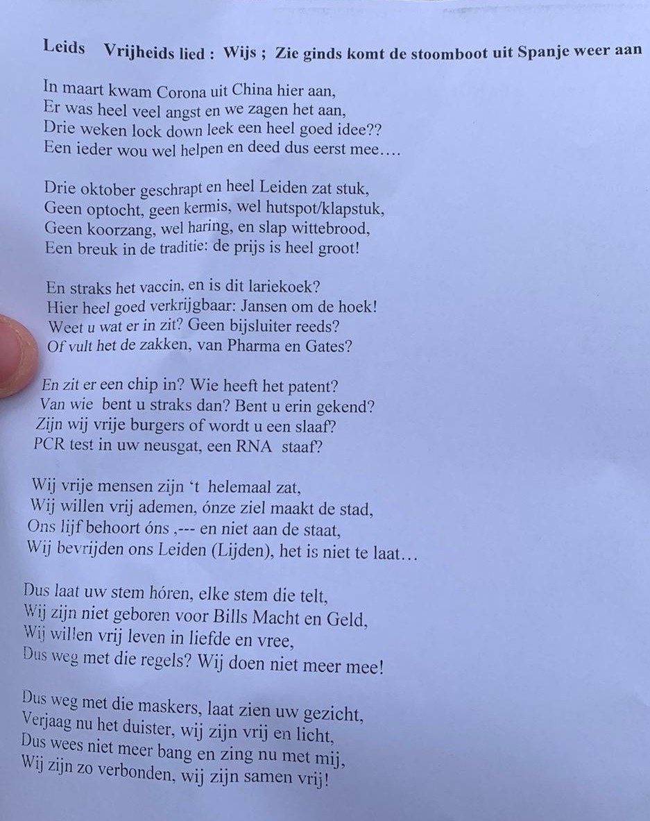 Hij heeft eigenhandig het Leids Volkslied herschreven en dus klinkt het even later uit een paar honderd monden, op de toezicht houdende agenten na, draagt niemand een mondkapje. “Wij in Leiden respecteren, ieders mensen vrije wil. Zij aan Zij, ja leven wij samen, spreken ons uit en zijn niet stil.” En “Zelf beslissen prik of niet, onderdrukking past ons niet”, zingen de demonstranten. Dat laatste is overigens een aanname, er is geen sprake van verplichting bij vaccinatie.