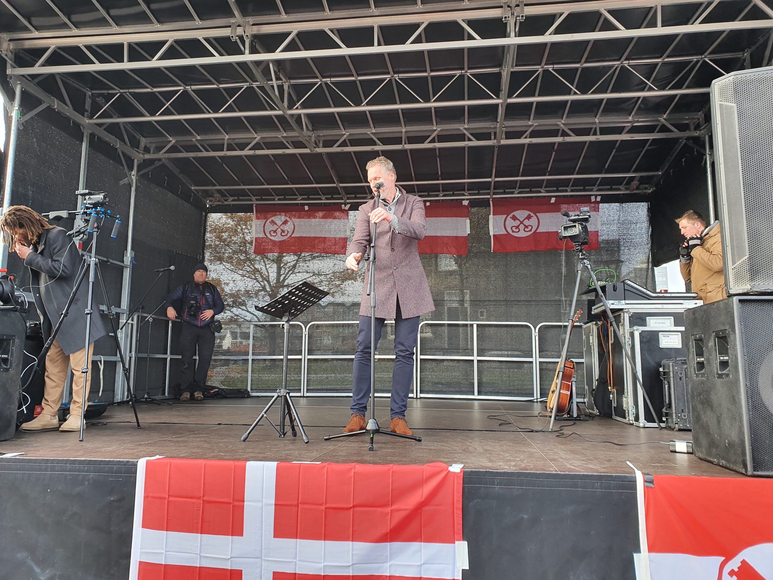 De ene spreker na de andere komt vanaf het podium aan het woord. Ook de nog jonge kinderen van de actievoerders worden ingezet. “De restaurants moeten weer open”, vindt de elfjarige Marlijn. Een trotse moeder mag daarna nog wat zeggen. Dan is het tijd voor een bekende Leidenaar. 3 Oktoberdirigent Wim de Ru betreedt het podium. Hij blijkt niks te moeten hebben van mondkapjes en ook het advies om niet te zingen vindt de muziekleraar van BplusC belachelijk.