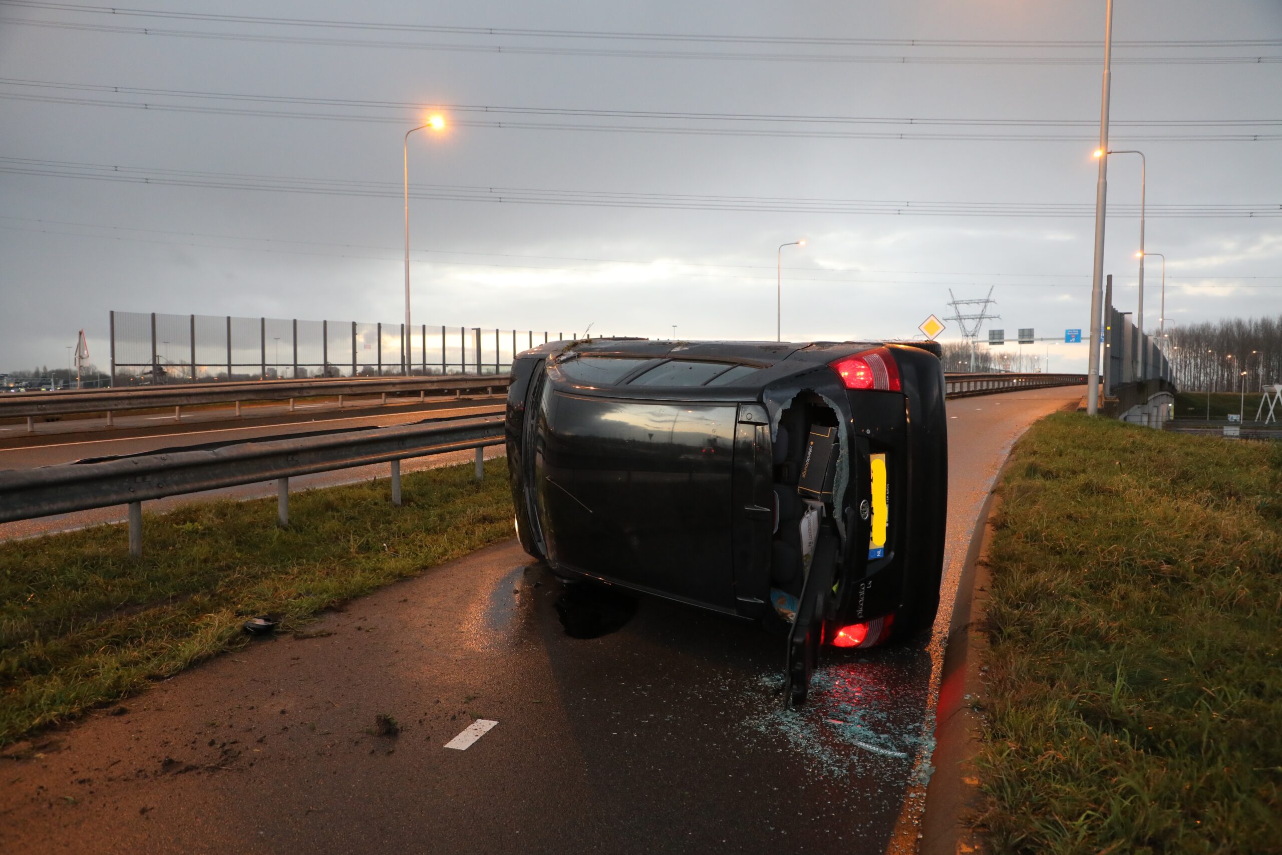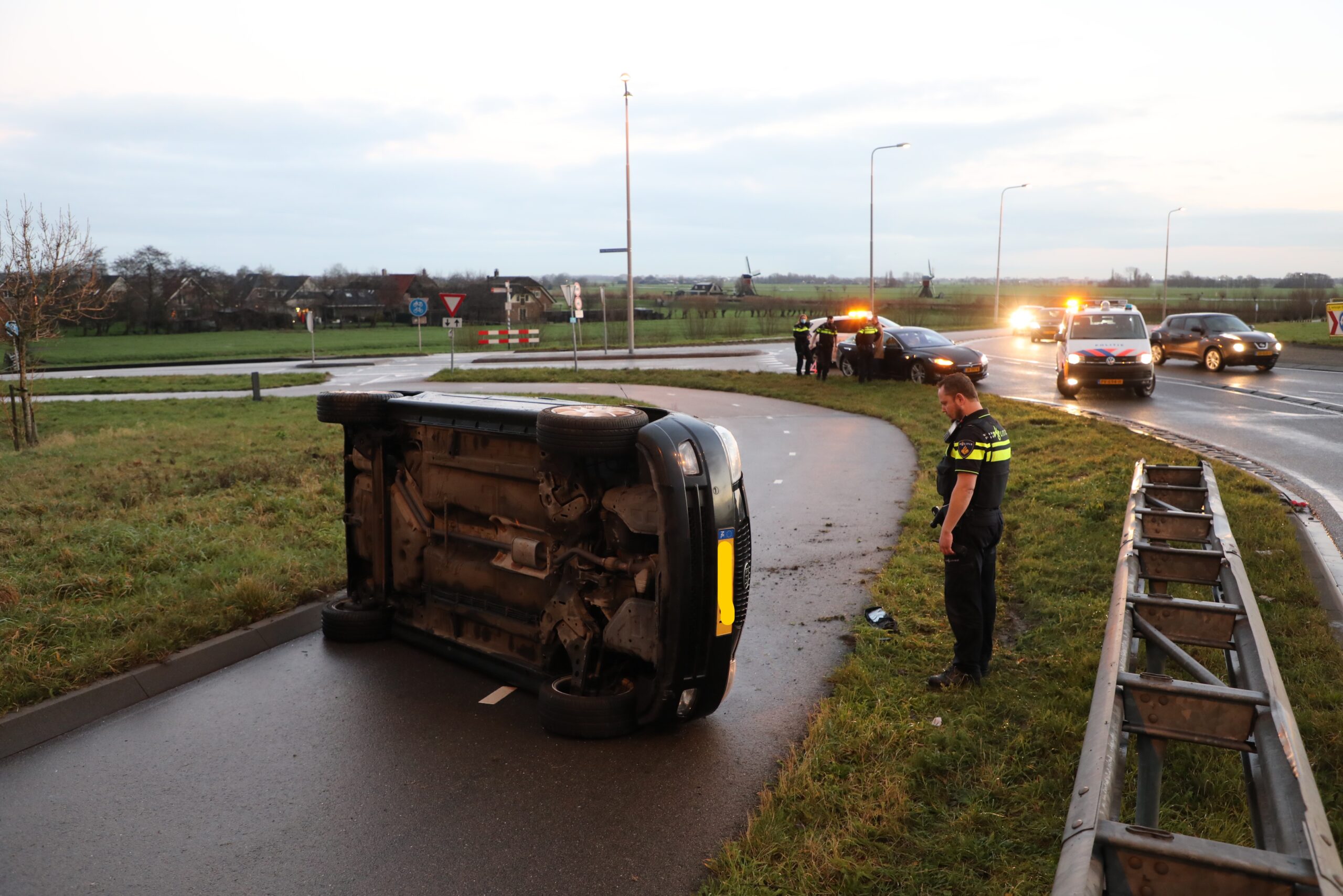 Bij een eenzijdig ongeval op de N446 bij Leiderdorp is vanmiddag een auto op zijn kant op het fietspad beland. De bestuurster raakte hierbij niet gewond.
