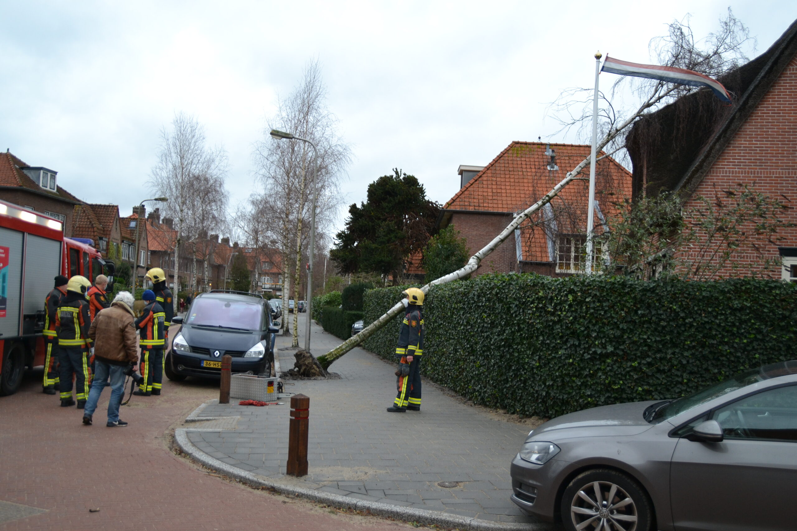 De brandweer is ter plaatse en wil de boom in stukken zagen. Ze wachten daarvoor nog op een autoladder.
