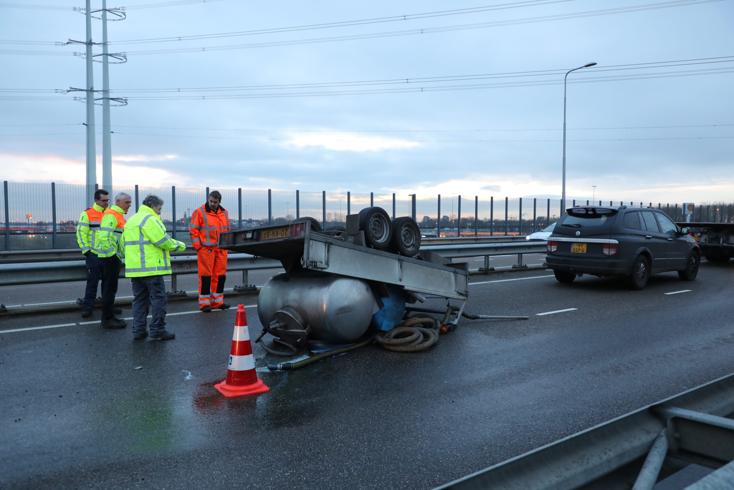 Vanmiddag ging het weer mis. Dit keer kwam een aanhanger met daarop een tank met onbekende inhoud ondersteboven op de weg terecht. Er raakte niemand gewond, wel lekt er een onbekende vloeistof weg. Een bergingsbedrijf is ter plaatse om de aanhanger mee te nemen. Het wegdek zal ook gereinigd moeten worden.
