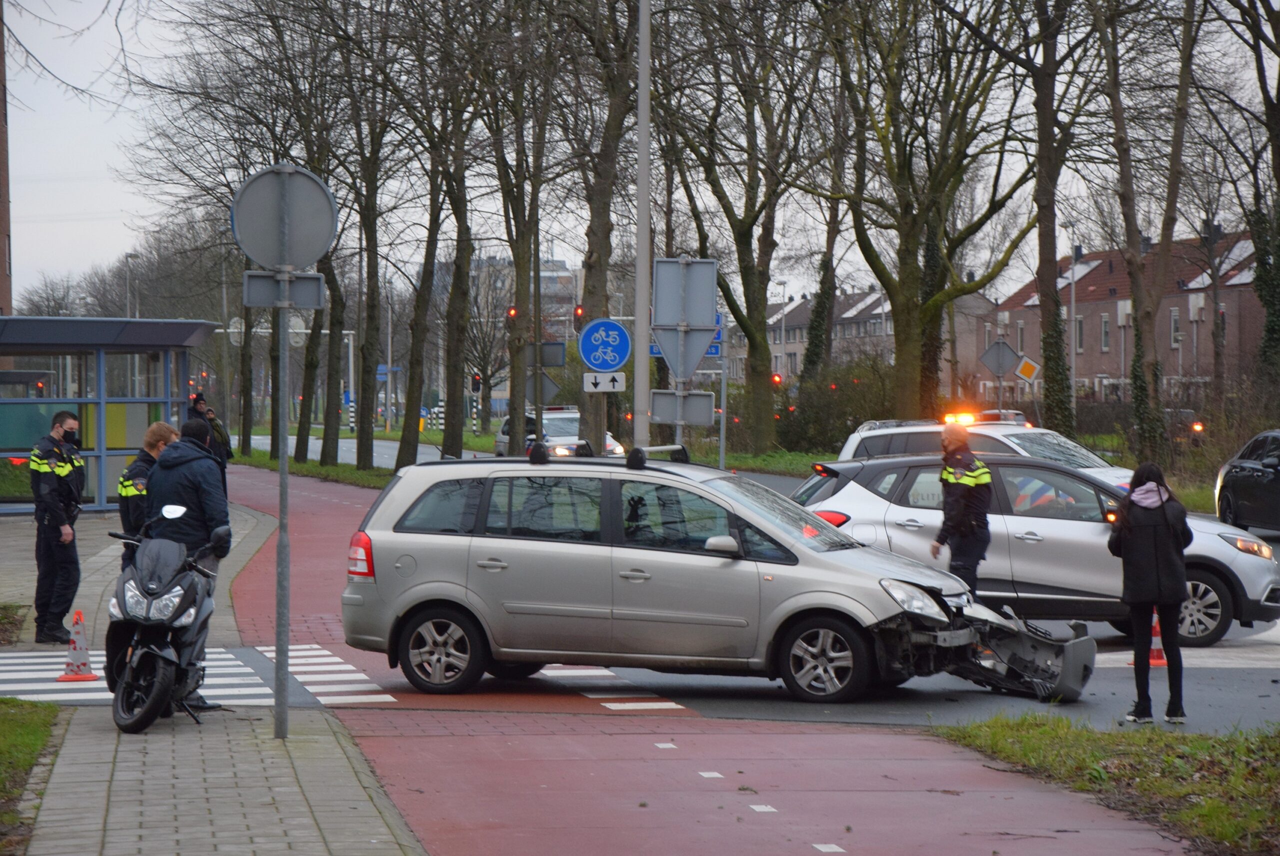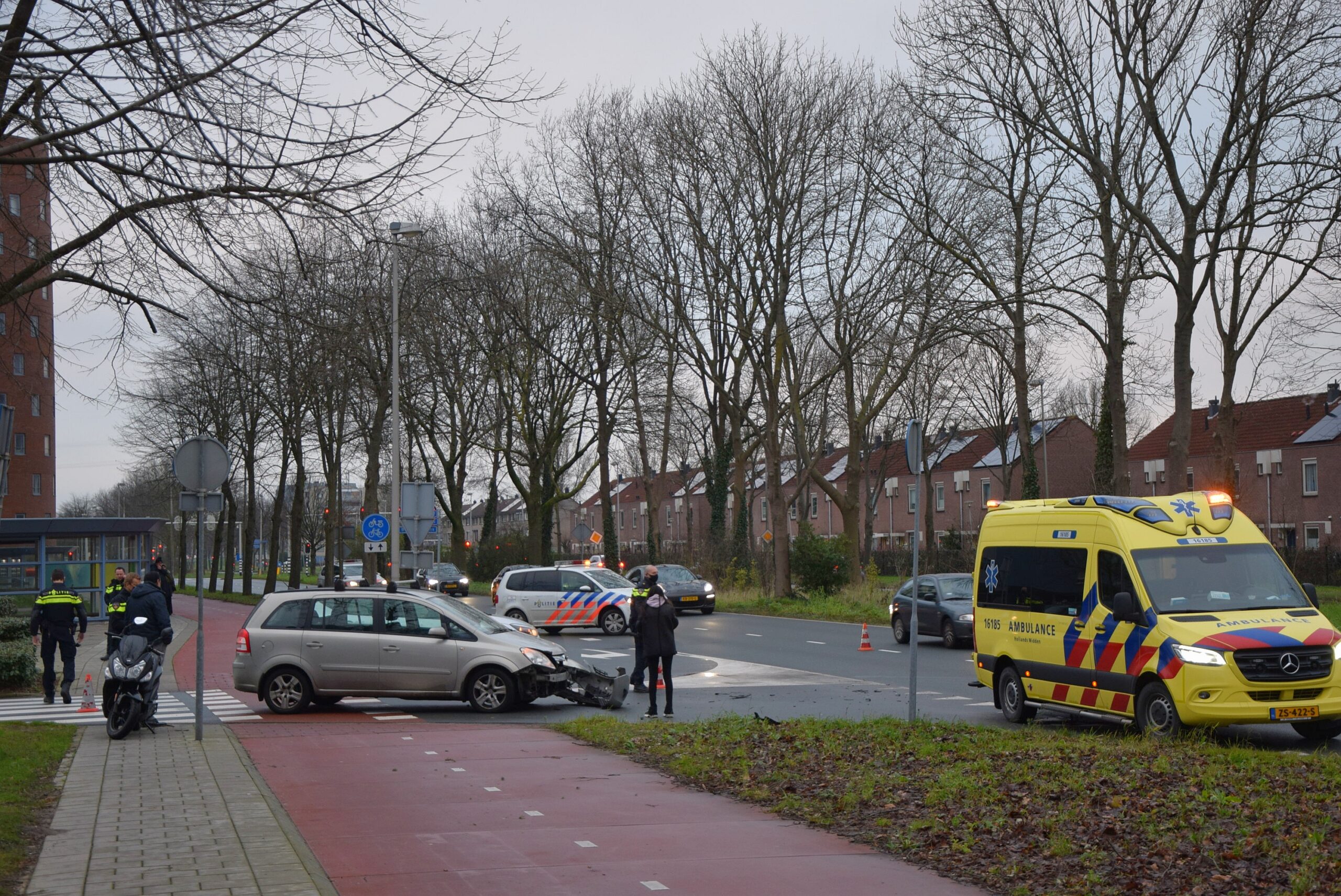 Een personenauto en scooter zijn vanmiddag met elkaar in botsing gekomen op de kruising van de Houtschans met het Engenlendaal in Leiderdorp. De jongeman op de scooter is door het ambulancepersoneel nagekeken maar hoefde niet naar het ziekenhuis. De auto liep flinke schade op en is afgevoerd.