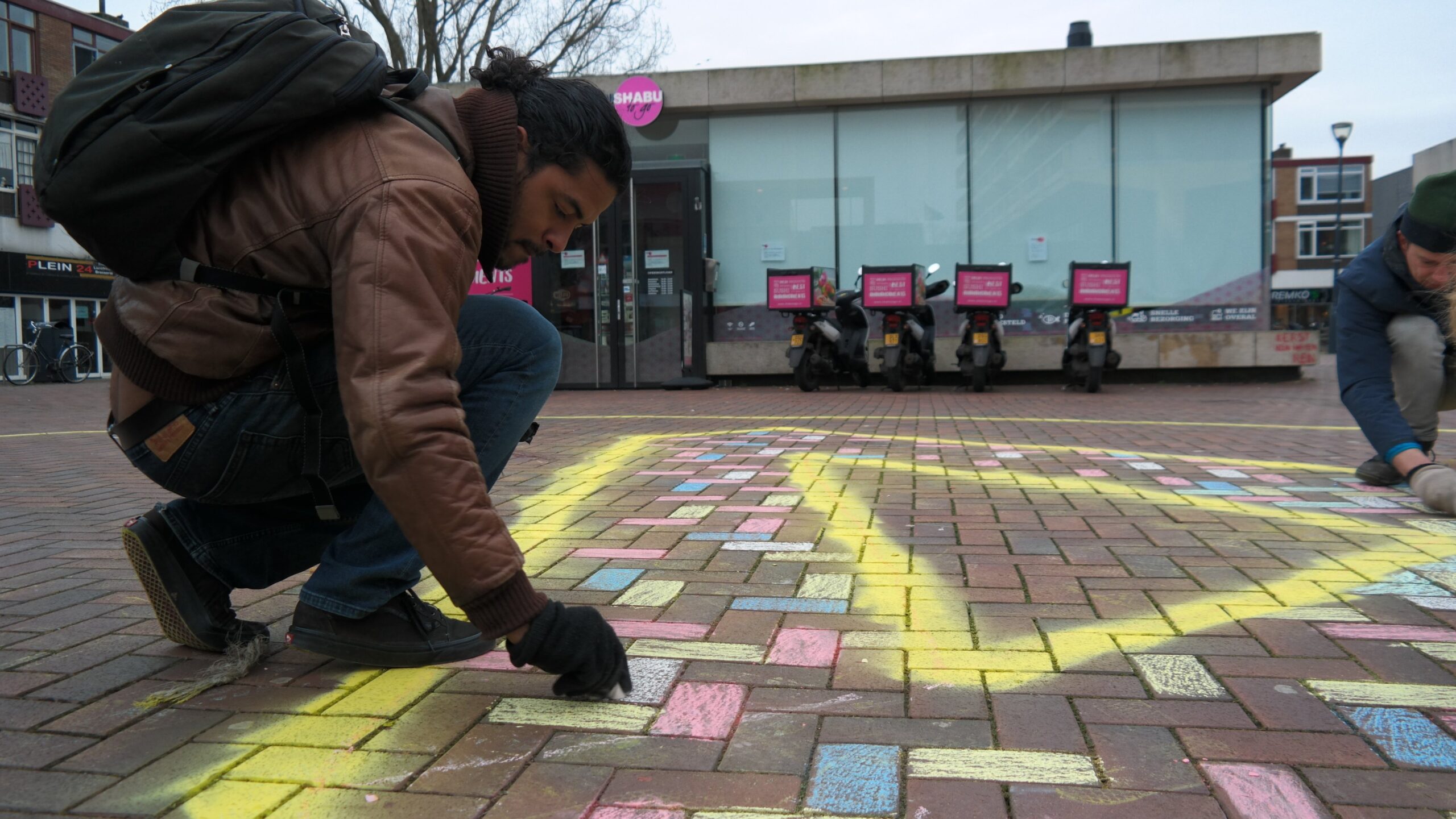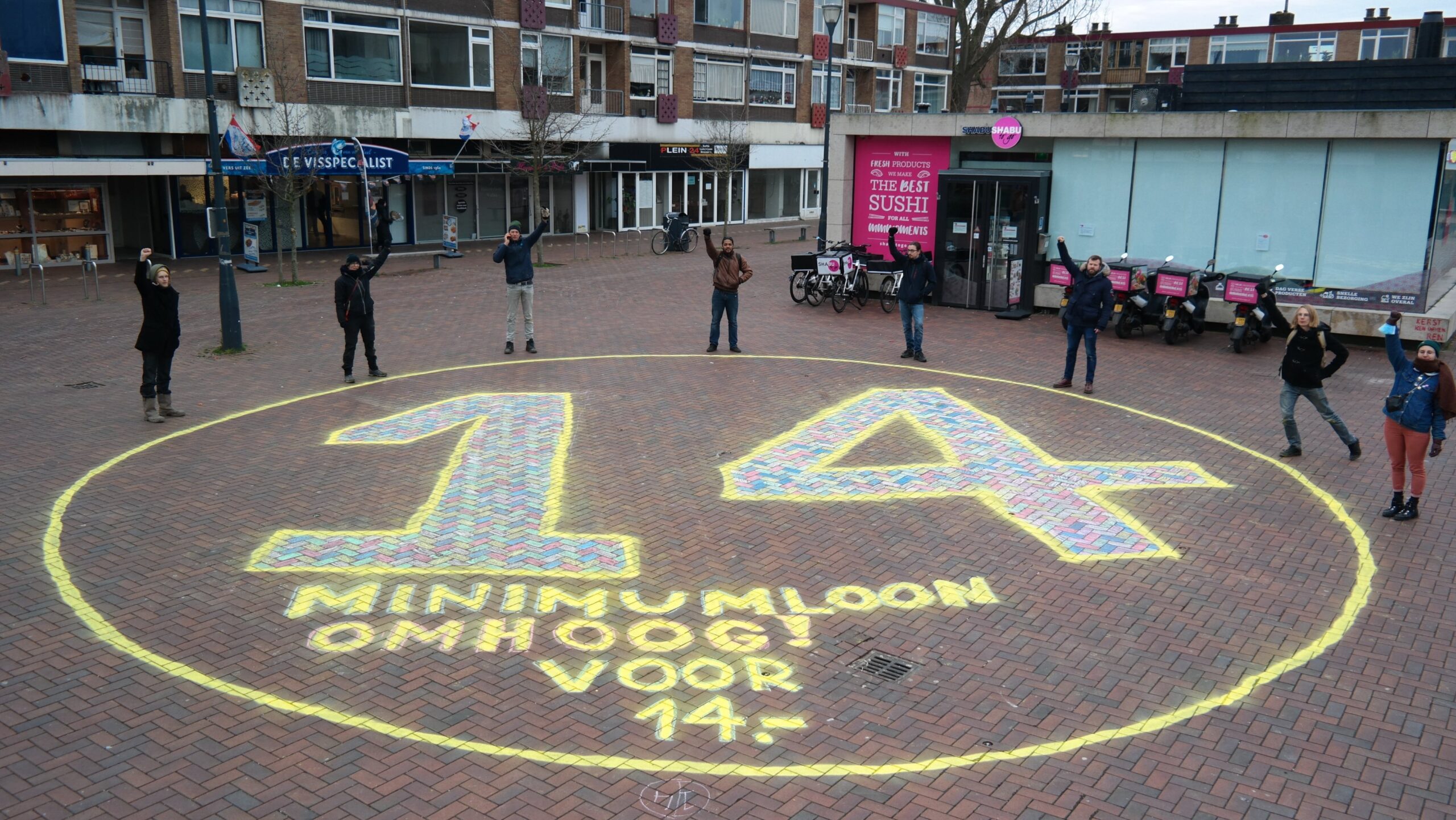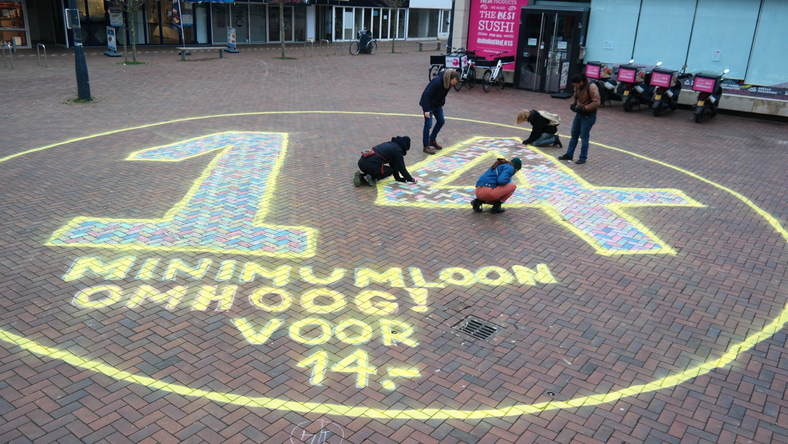 De actiegroep ‘Leiden voor 14’ die zich inzet voor een hoger minimumloon heeft zaterdag een krijtactie gehouden voor de deur van de Albert Heijn XL vestiging aan het Bevrijdingsplein in Leiden Zuidwest. De activisten hebben met krijt een enorme 14 op het plein getekend.