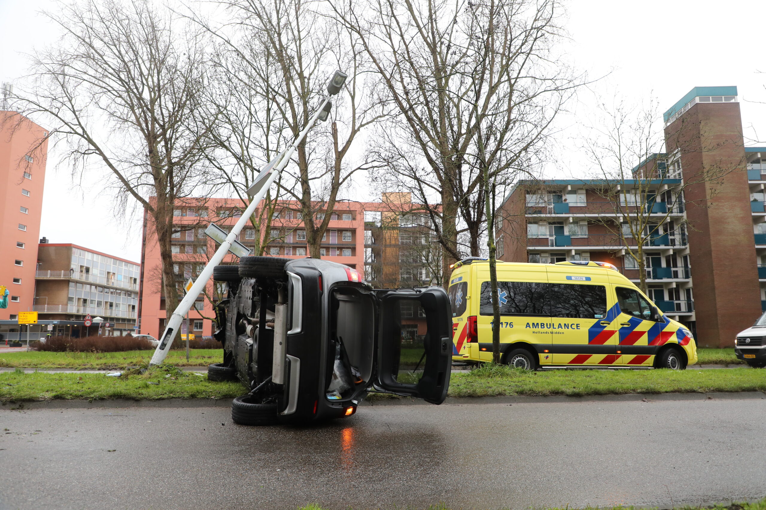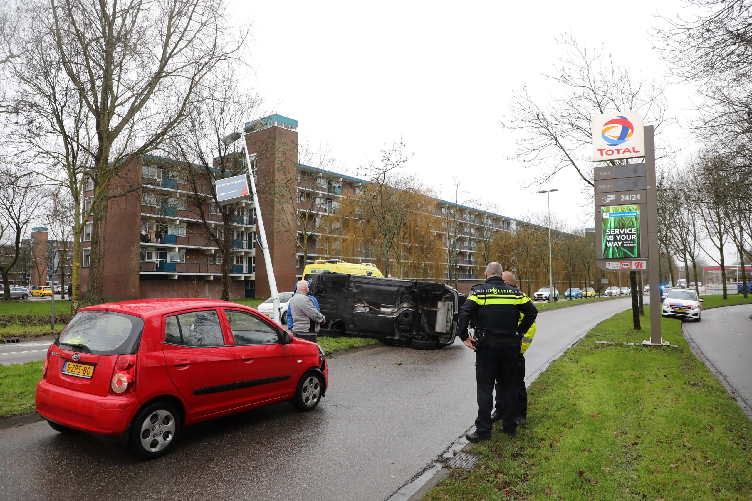 Bij een aanrijding op de Doctor Lelylaan in Leiden Zuidwest is dinsdagochtend een enorme ravage ontstaan. Twee voertuigen botsten op elkaar bij de kruising met de Barnsteenstraat. Een auto kwam op z’n kant terecht en ramde daarbij ook een lantaarnpaal.