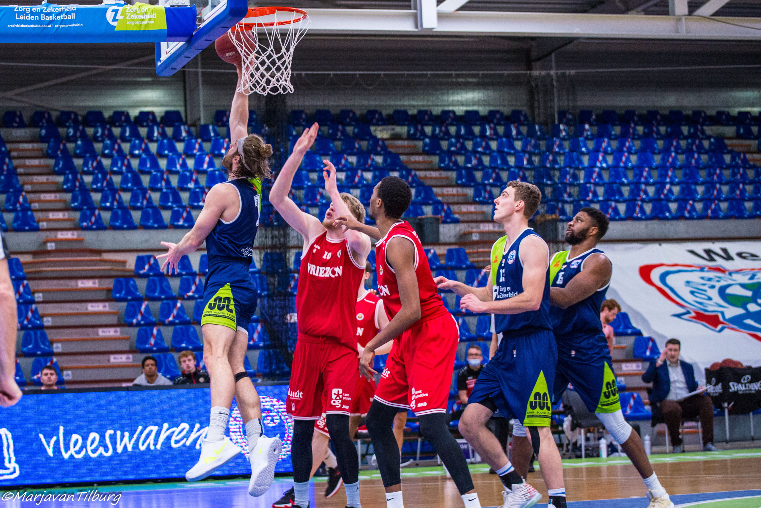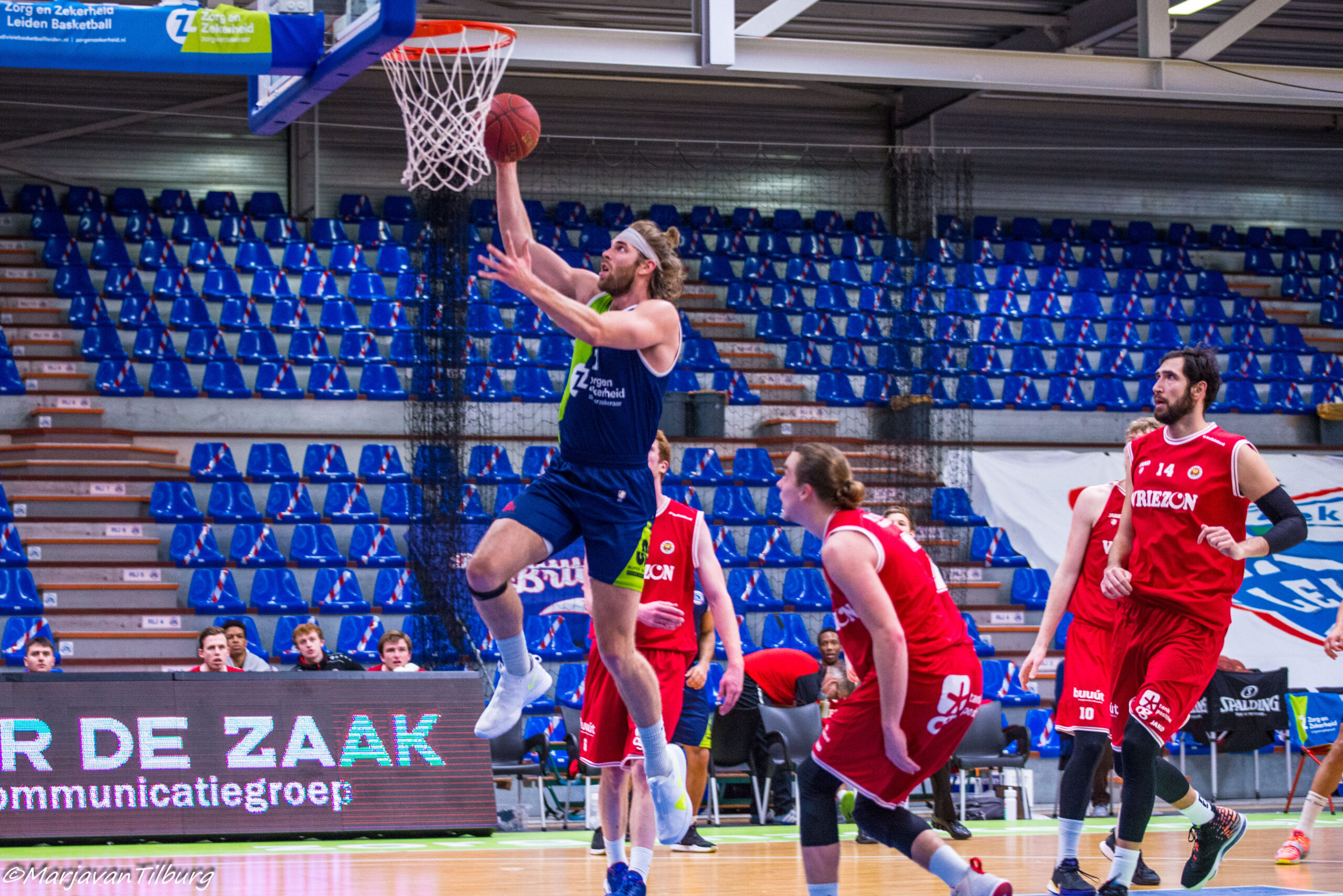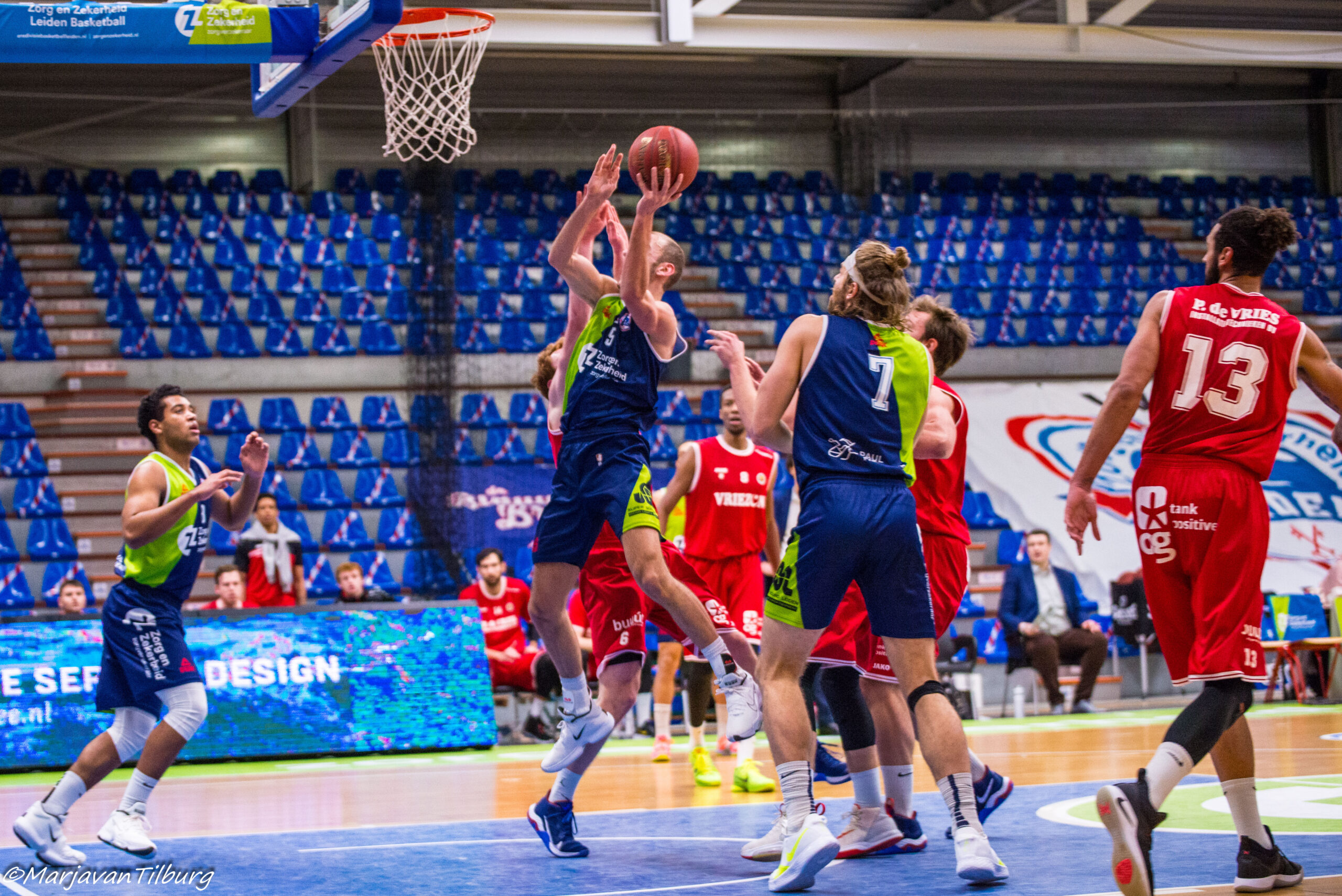 Zorg en Zekerheid Leiden Basketball heeft de ongeslagen status zaterdagavond tegen Aris Leeuwarden kunnen behouden, maar makkelijk ging dat niet. De Friezen boden de gehandicapte Leidse thuisploeg (geen Carrington Love, geen Giddy Potts, geen Troy Koehler) veel tegenstand. Bij rust stonden beide ploegen naast elkaar (33-33), na drie kwarten was het pas 50-47 en moest Zorg en Zekerheid Leiden zonder Worthy de Jong verder. In laatste kwart vonden de Leidenaren uiteindelijk de weg naar de winst: 75-63.