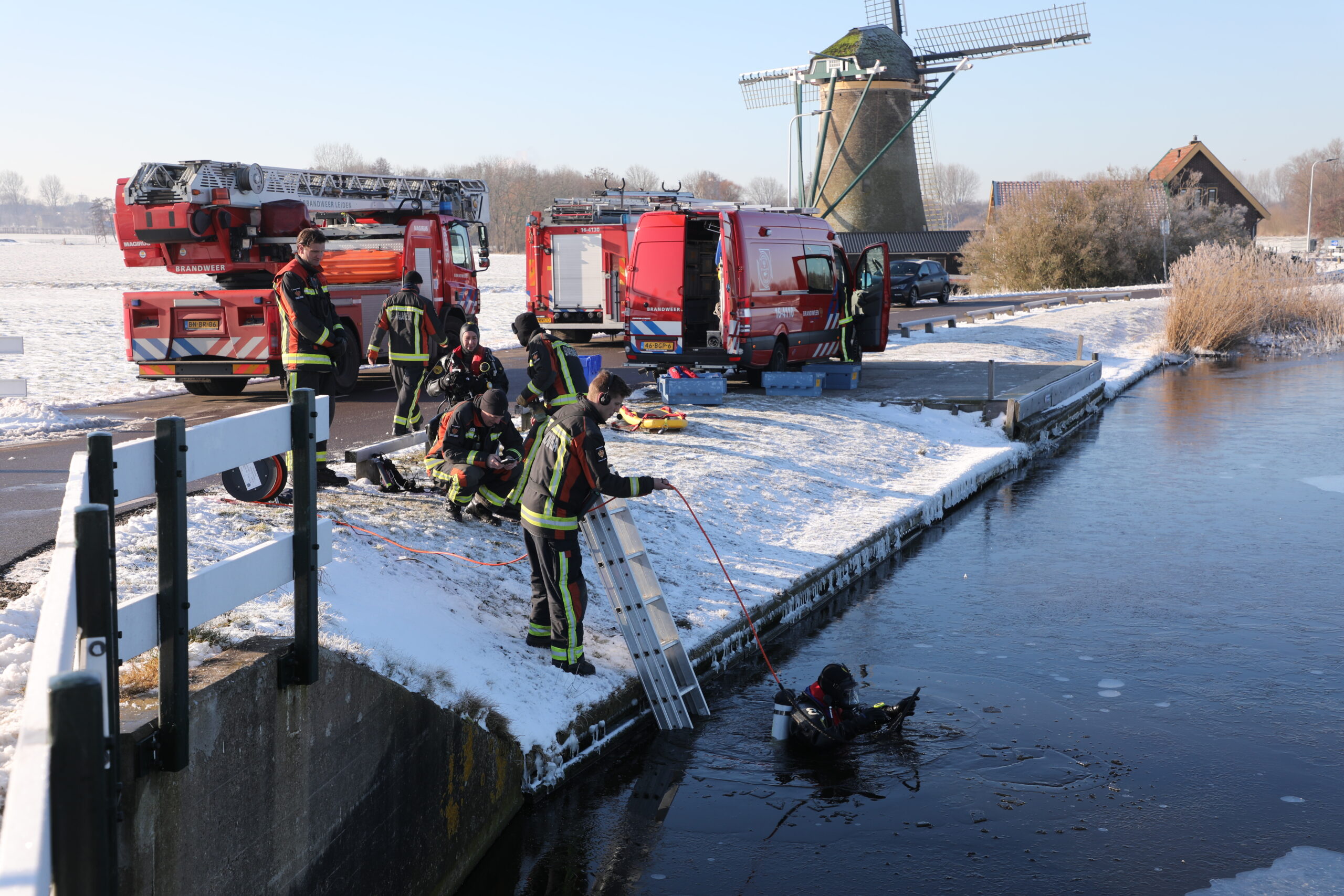 De Leidse brandweer heeft vanmorgen een bijzondere oefening gehouden in de Zijl. Aan de Zijldijk maakte het korps gebruik van de ijzige omstandigheden om te oefenen met duiken onder het ijs. Onder toeziend oog van een zwanenfamilie gingen twee duikers het ijskoude water in.