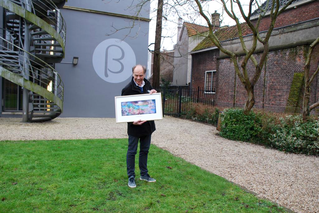 Een reproductie van het kunstwerk werd aangeboden aan Carel Stolker, die eerder deze week afscheid nam als rector van de Leidse universiteit.