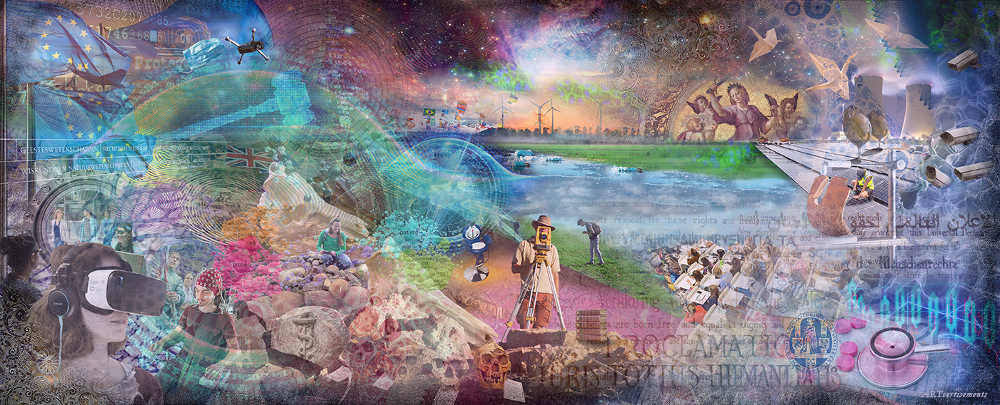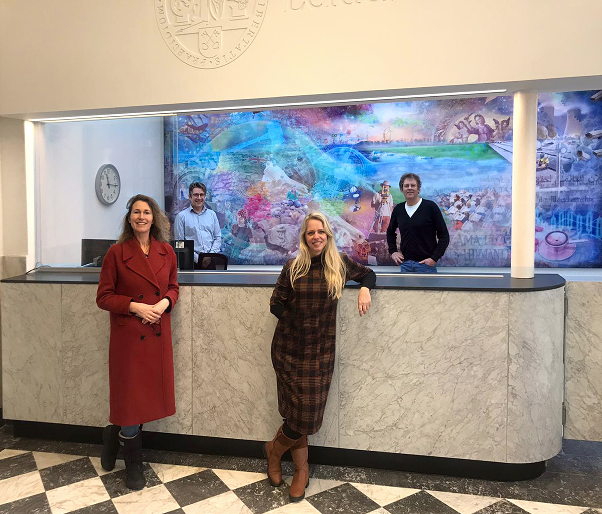 Koutouras: “De samenwerking met de decanen was heel constructief. Ook het contact met voormalig rector magnificus Douwe Breimer leverde een belangrijke toegevoegde waarde.” Van Druten heeft vervolgens van de aangeleverde beeldenselectie een kunstuiting gemaakt waarin zij zich onbewust liet leiden door de emoties die voor haar kenmerkend zijn in deze tijd.