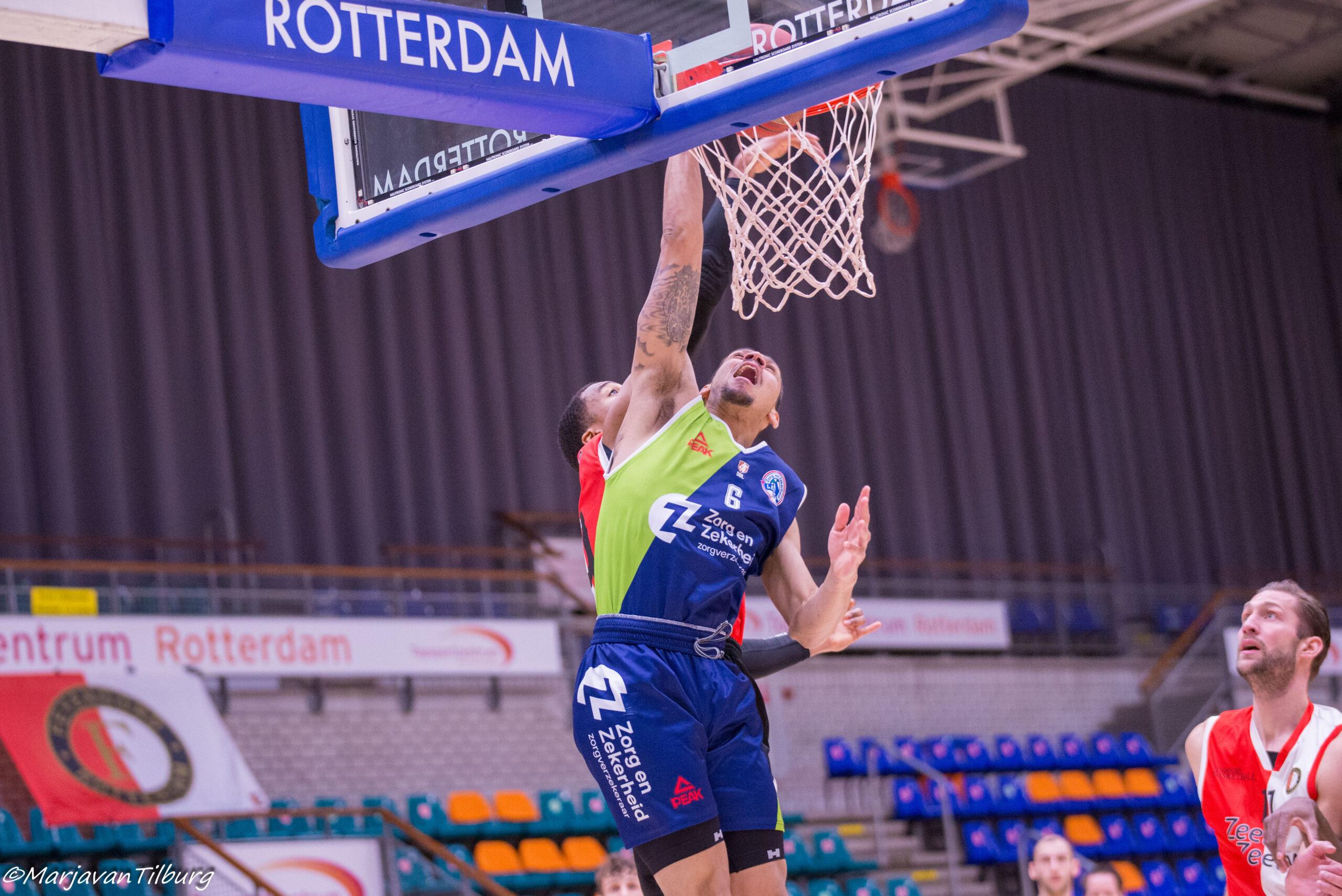 Zorg en Zekerheid Leiden dendert nog steeds door in de competitie, al hapert de trein wel af en toe. Maar ook in Rotterdam kreeg het team van coach Geert Hammink op tijd alles op rails en stelde ZZ Leiden de eindzege veilig met 87 tegen 84. Daarmee staat ZZ Leiden soeverein bovenaan.