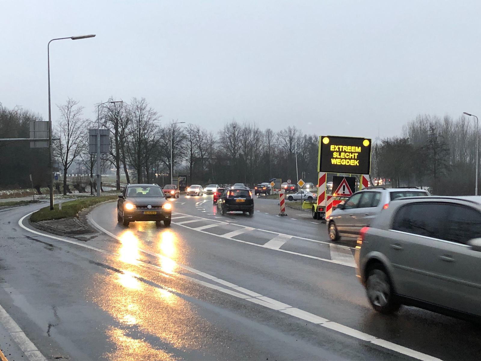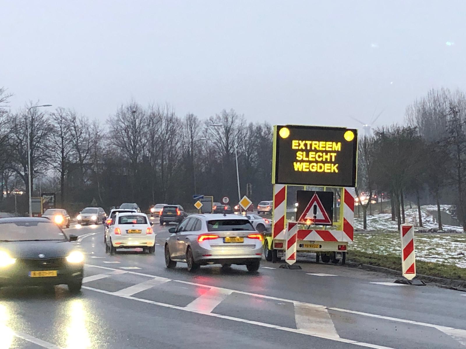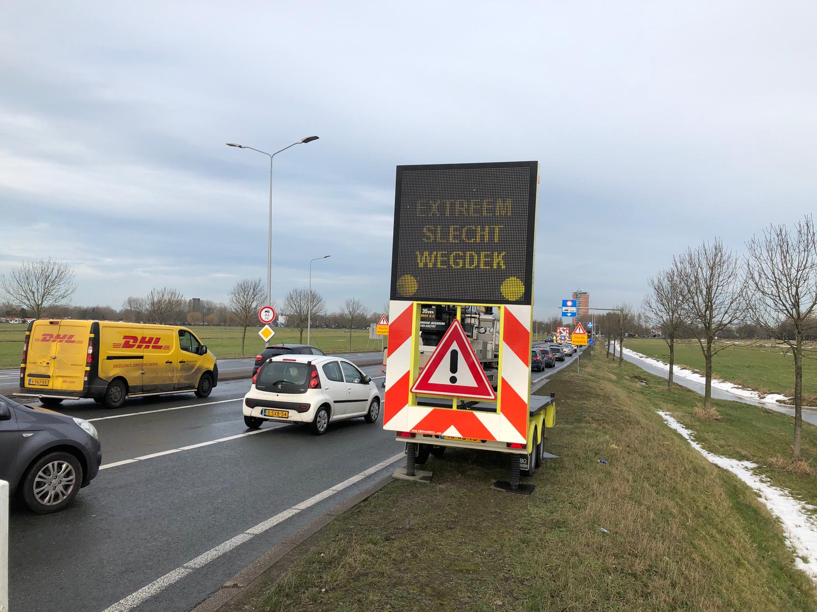 De Provincie Zuid-Holland is bezig met herstelwerkzaamheden op de Europaweg. Nadat de vorst wegtrok, ontstonden er gaten in het wegdek. Er staan borden met ‘extreem slecht wegdek’.