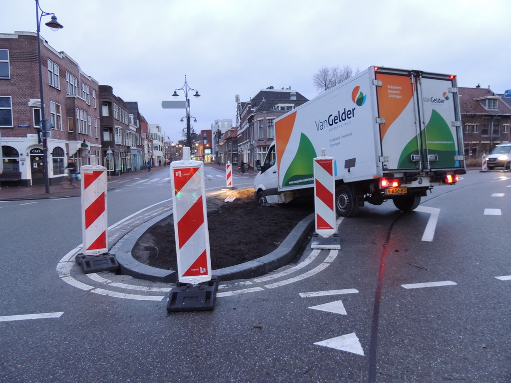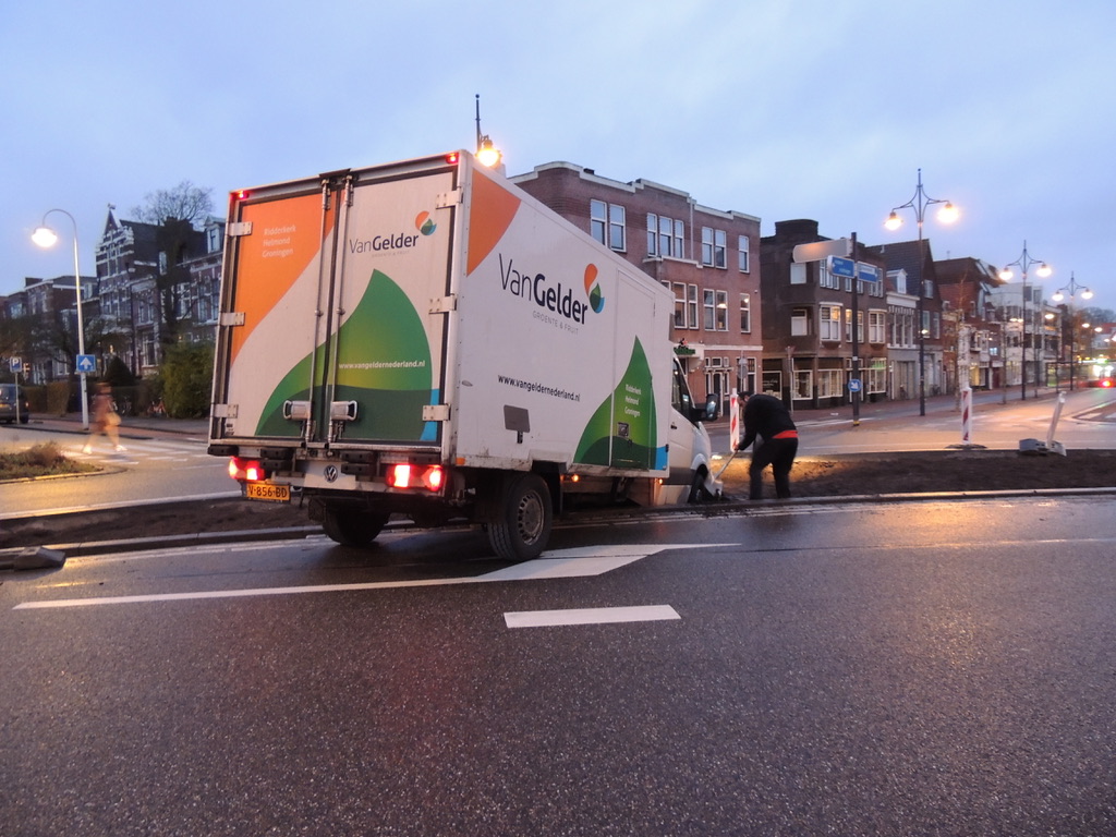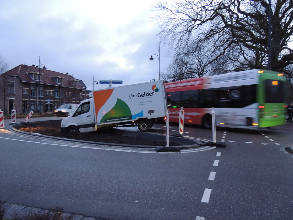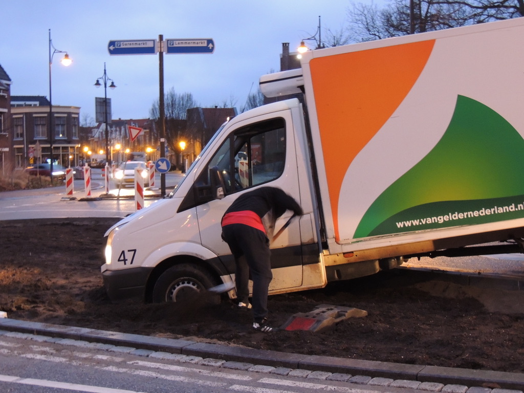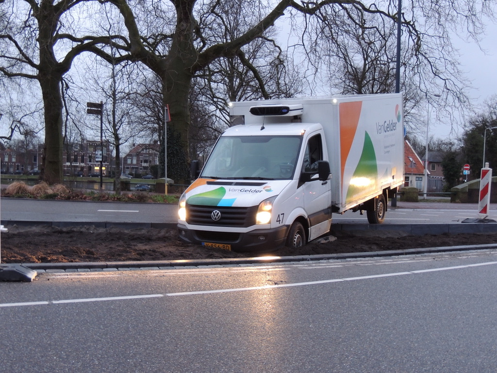 Een bestelbusje met groente en fruit is vanochtend om 6.00 uur vast komen te zitten in de ovale rotonde bij de Jan van Houtbrug. Chauffeur Fouad volgde de aanwijzingen van zijn navigatiesysteem iets te gretig op en probeerde linksaf te slaan. Door de hoge stoepranden kon de chauffeur de auto er niet meer zelf uit krijgen en moest wachten op een collega om hem eruit te slepen.