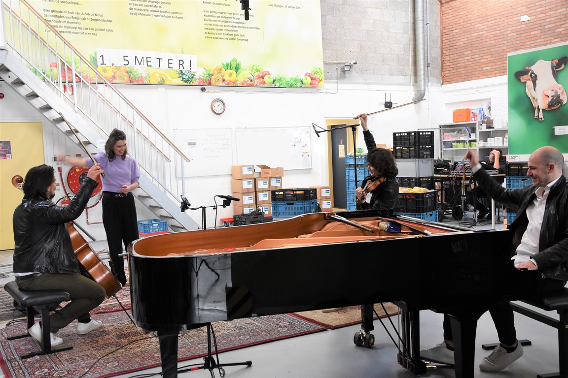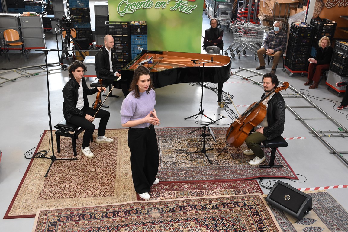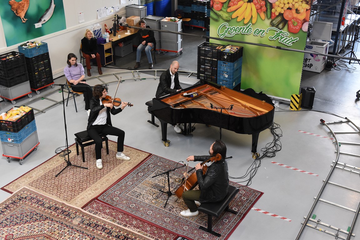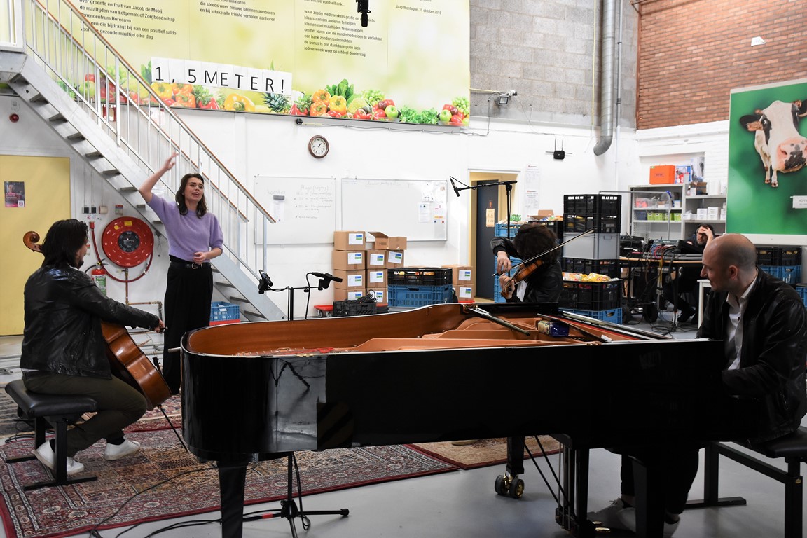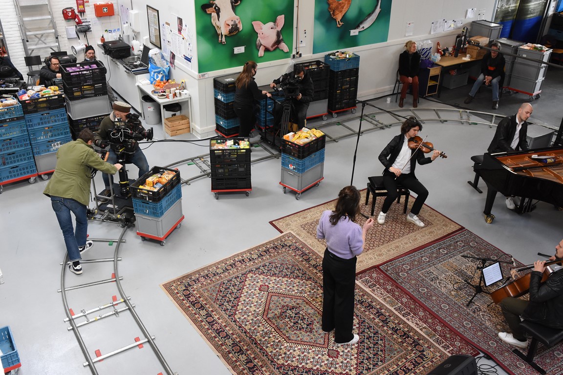 Zodoende klinkt op de laatste zaterdag van februari een Zweeds lied in de hal aan de Willem Barentzstraat. Rondom het geïmproviseerde podium – er liggen een paar vloerkleden met daarop de piano, stoelen voor de cellist en de violist, en ruimte voor de zangeres, is een rails aangelegd voor twee camera’s. Daarom heen zitten een paar vrijwilligers van de voedselbank. Netjes op anderhalve meter afstand.