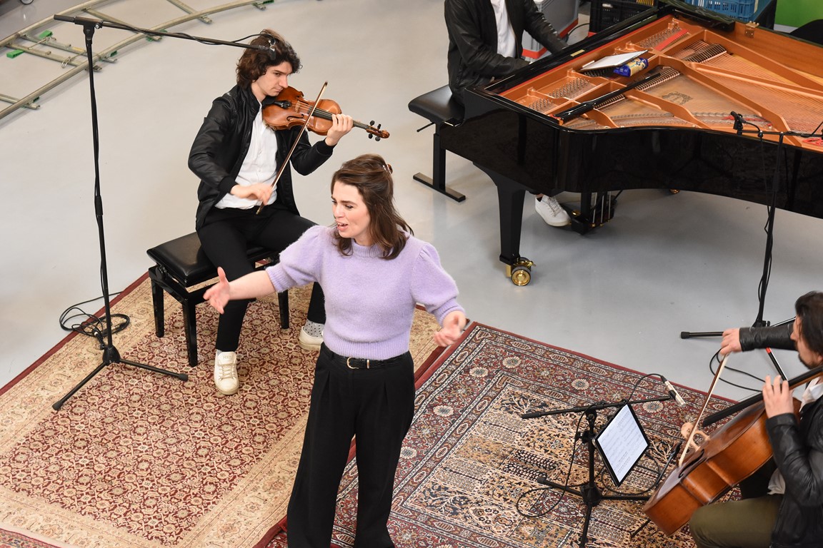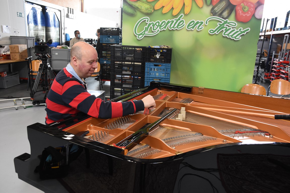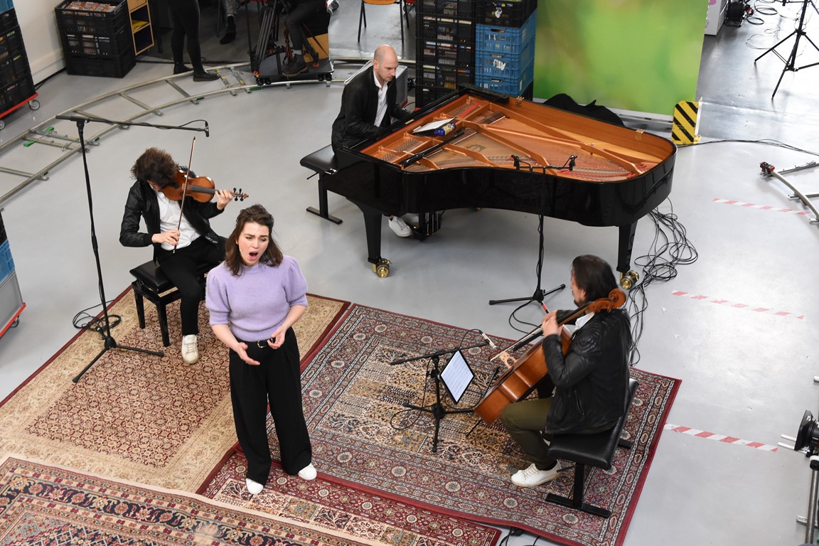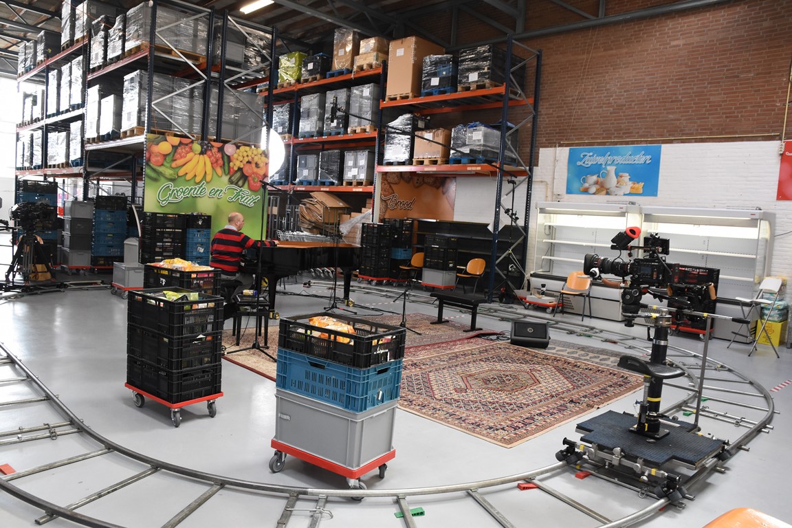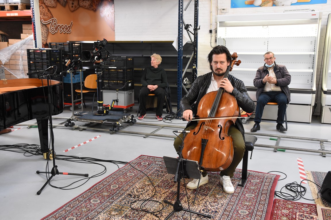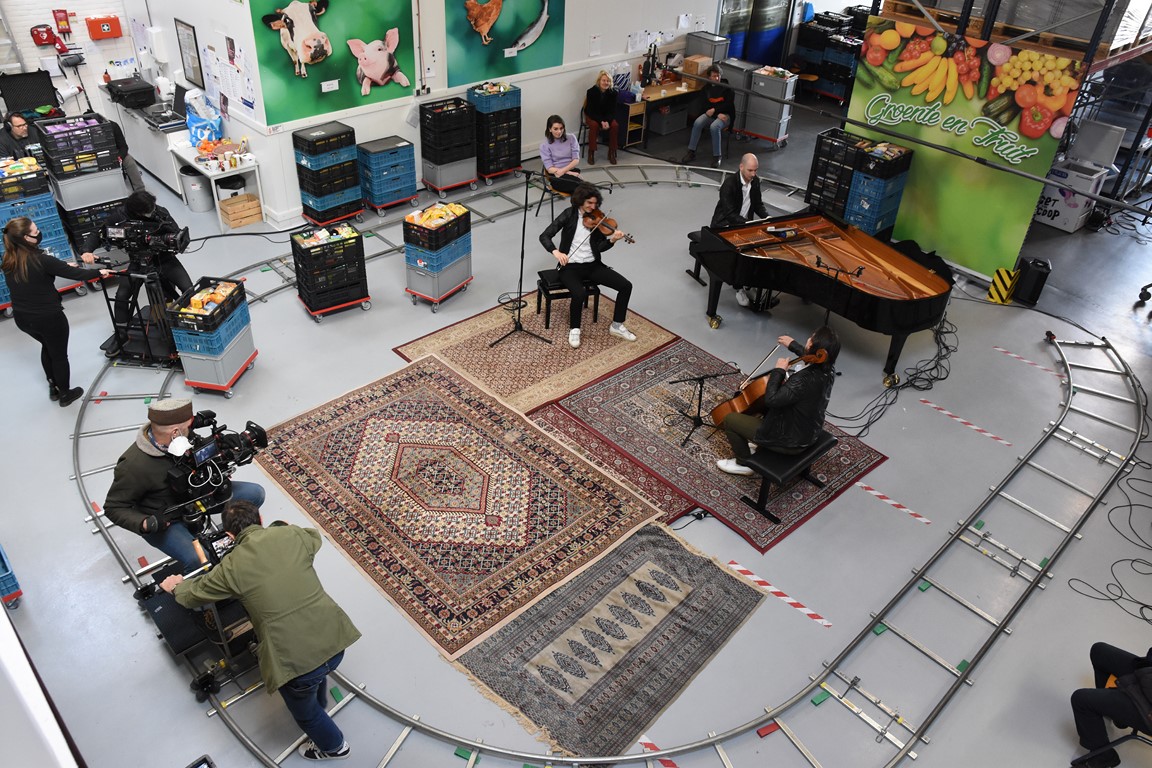 Zodoende klinkt op de laatste zaterdag van februari een Zweeds lied in de hal aan de Willem Barentzstraat. Rondom het geïmproviseerde podium – er liggen een paar vloerkleden met daarop de piano, stoelen voor de cellist en de violist, en ruimte voor de zangeres, is een rails aangelegd voor twee camera’s. Daarom heen zitten een paar vrijwilligers van de voedselbank. Netjes op anderhalve meter afstand.