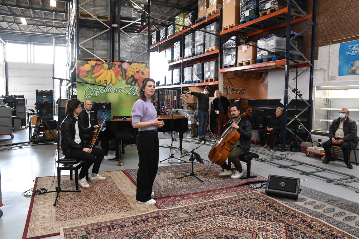 Overal in de maatschappij piept en kraakt het van de coronamoeheid. Zo ook onder musici, zangers en andere podiumkunstenaars. Om elkaar te ondersteunen brengt NPO Cultuurplan elke zaterdag artiesten bij elkaar op een bijzondere locatie voor een miniconcert. Afgelopen zaterdag was dat de loods van de Voedselbank Leiden.