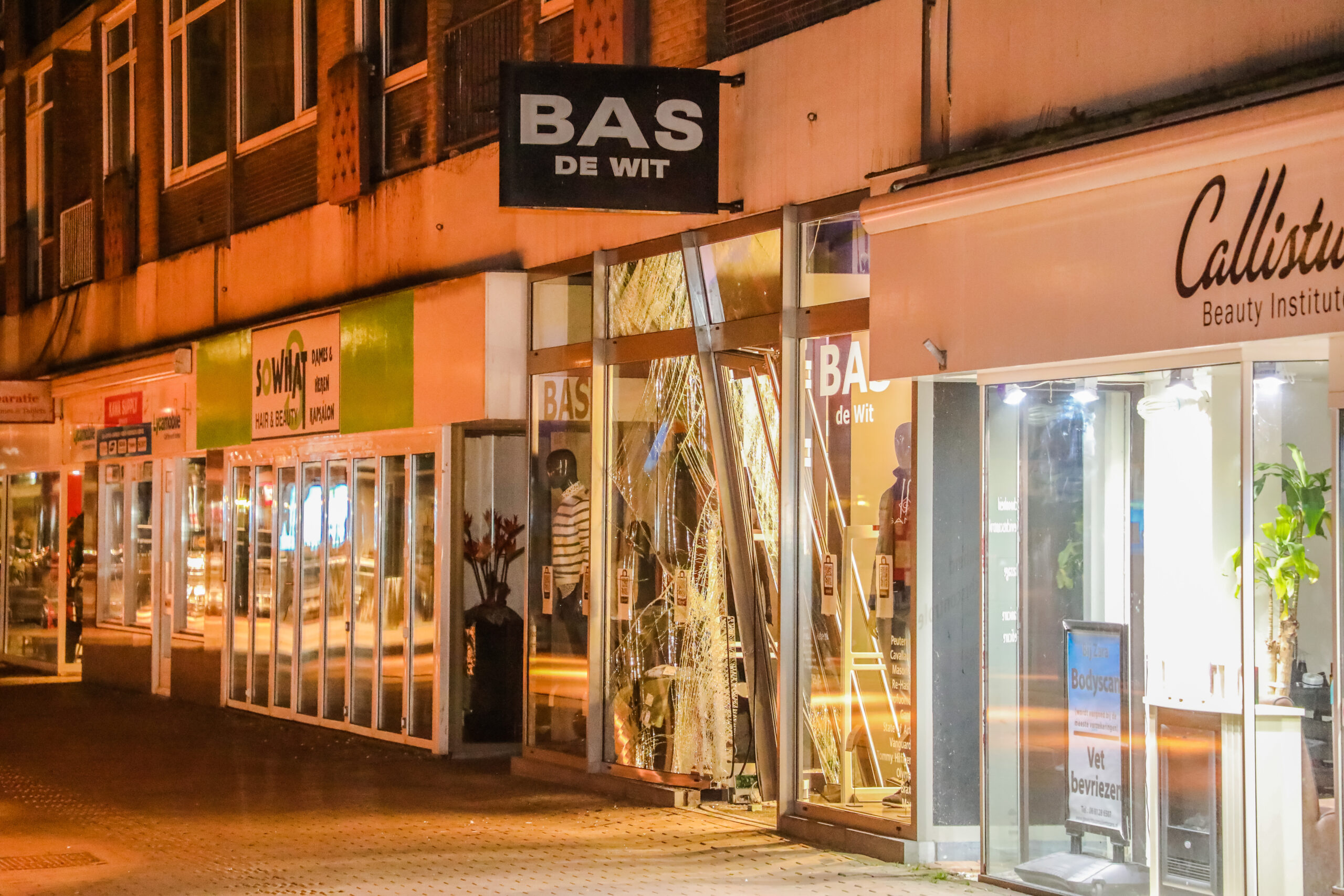 Modewinkel Bas de Wit is vannacht voor de tweede keer in korte tijd slachtoffer van een ramkraak. Omstreeks 4.00 uur zijn twee verdachten op de winkel aan het Vijf Meiplein ingereden met een groene Toyota Starlet.