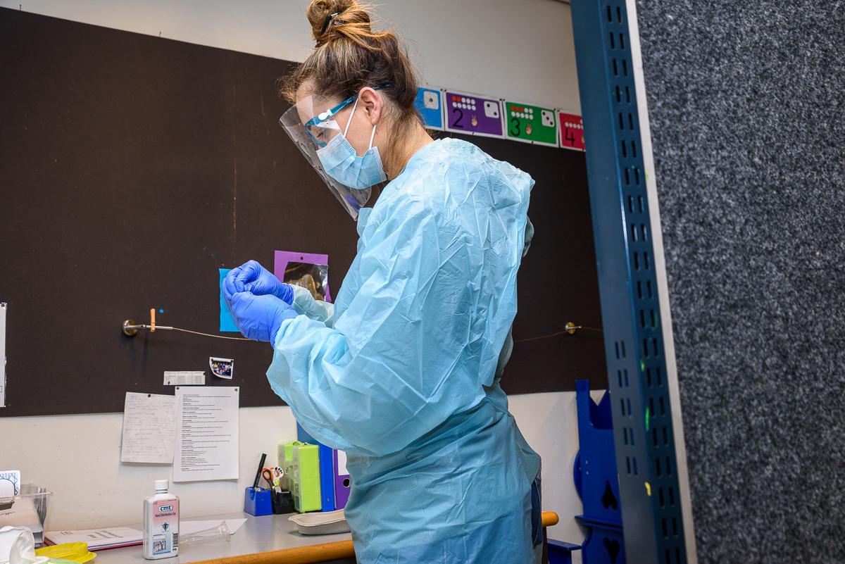 En dan komen de leraren en kinderleidsters met een hoestje of verkoudheid. Het zijn er een handvol, maar dat was ook de verwachting. Een half uur later staan ze allemaal weer buiten – en de meesten blijken geen corona te hebben. Ook dat was verwacht, maar er is zekerheid nodig. Daarom wordt er getest